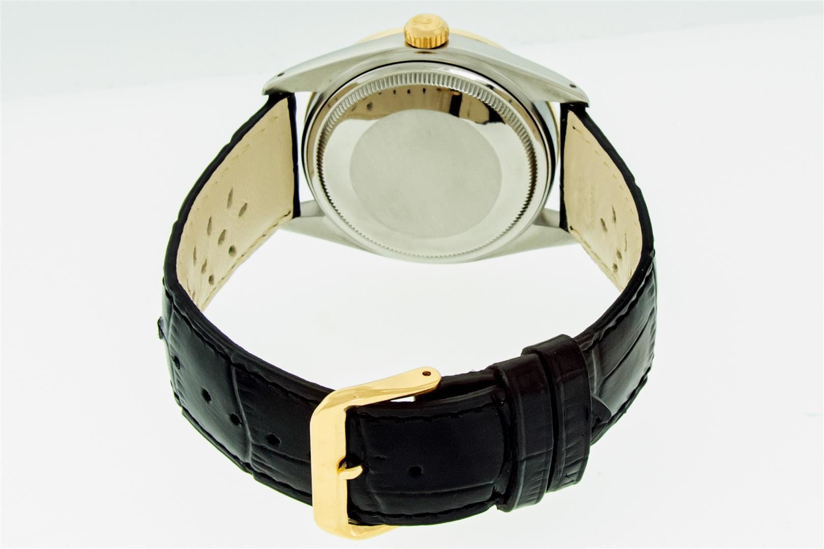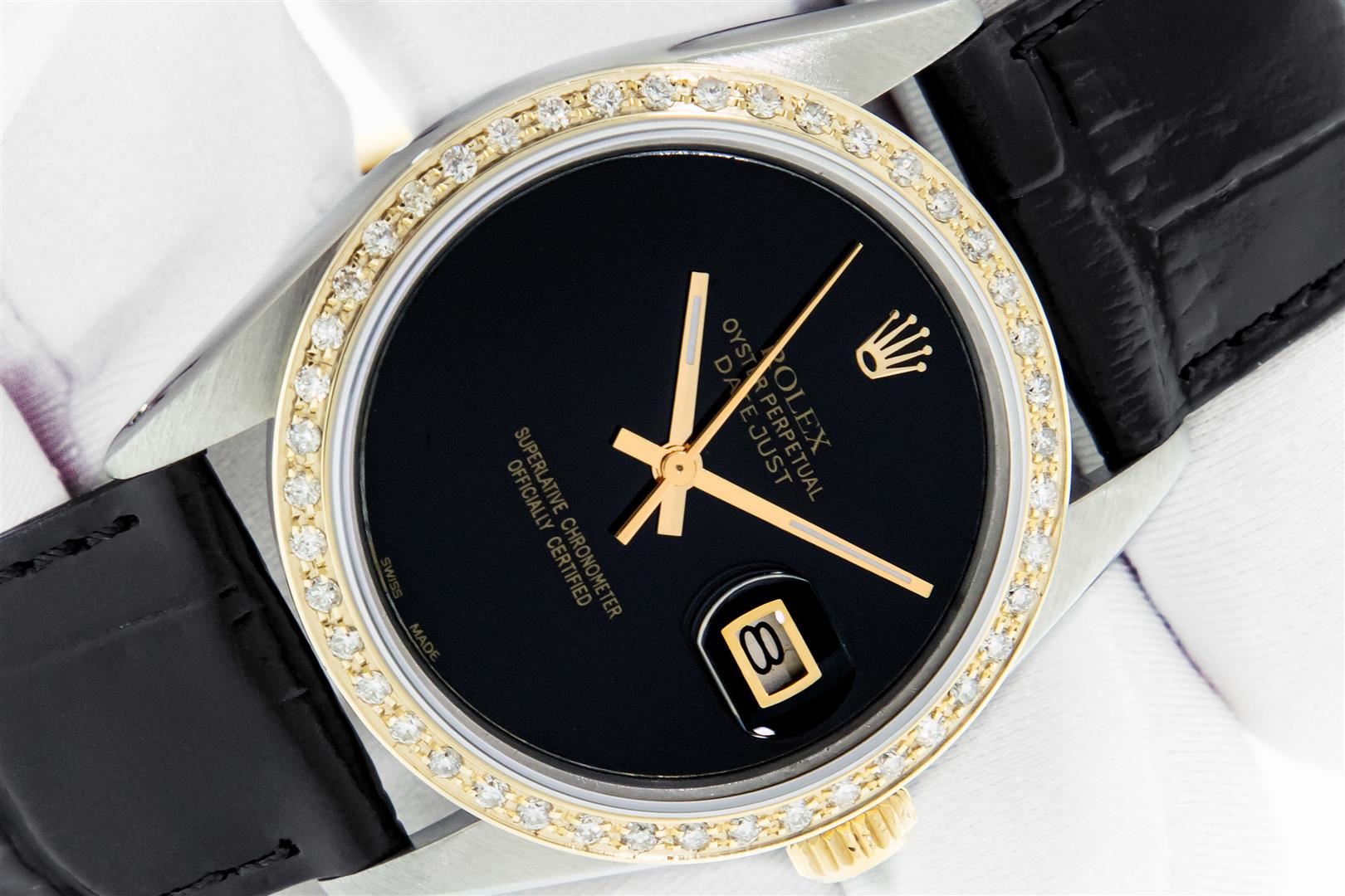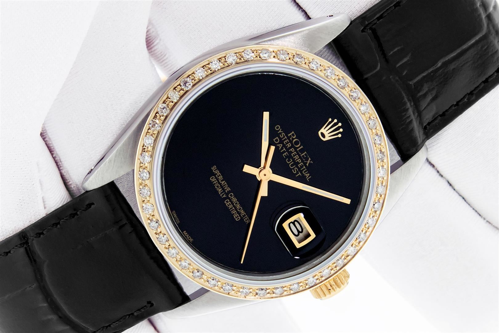 One Men's Yellow Gold Two Tone Rolex Datejust Polished, Serviced & Electronically Tested, Yellow Gold & Stainless Steel Case: 36mm, Yellow Gold Crown, Custom Bezel: New 18K Yellow Gold Beadset Diamond Bezel, Diamond Count: 44 Diamonds In Bezel, Clarity: SI-VS, Color: G to H. Custom Crystal: New Sapphire with Date Window. Custom Hands: New Luminescent Hands. Rolex Movement: Automatic Winding Movement. Custom Dial: Black Onyx Dial. Date Window: 3 O'Clock Position Date Display, Quickset, Model: Datejust. Condition: G-6 Extra Fine. Custom Band: New Black Leather Band. 7.0 Inch Length. New Custom Pink Buckle Clasp. This Watch Has Been Serviced Time Tested And Is In Excellent Condition It Is Free Of All Scratches And Dents.
