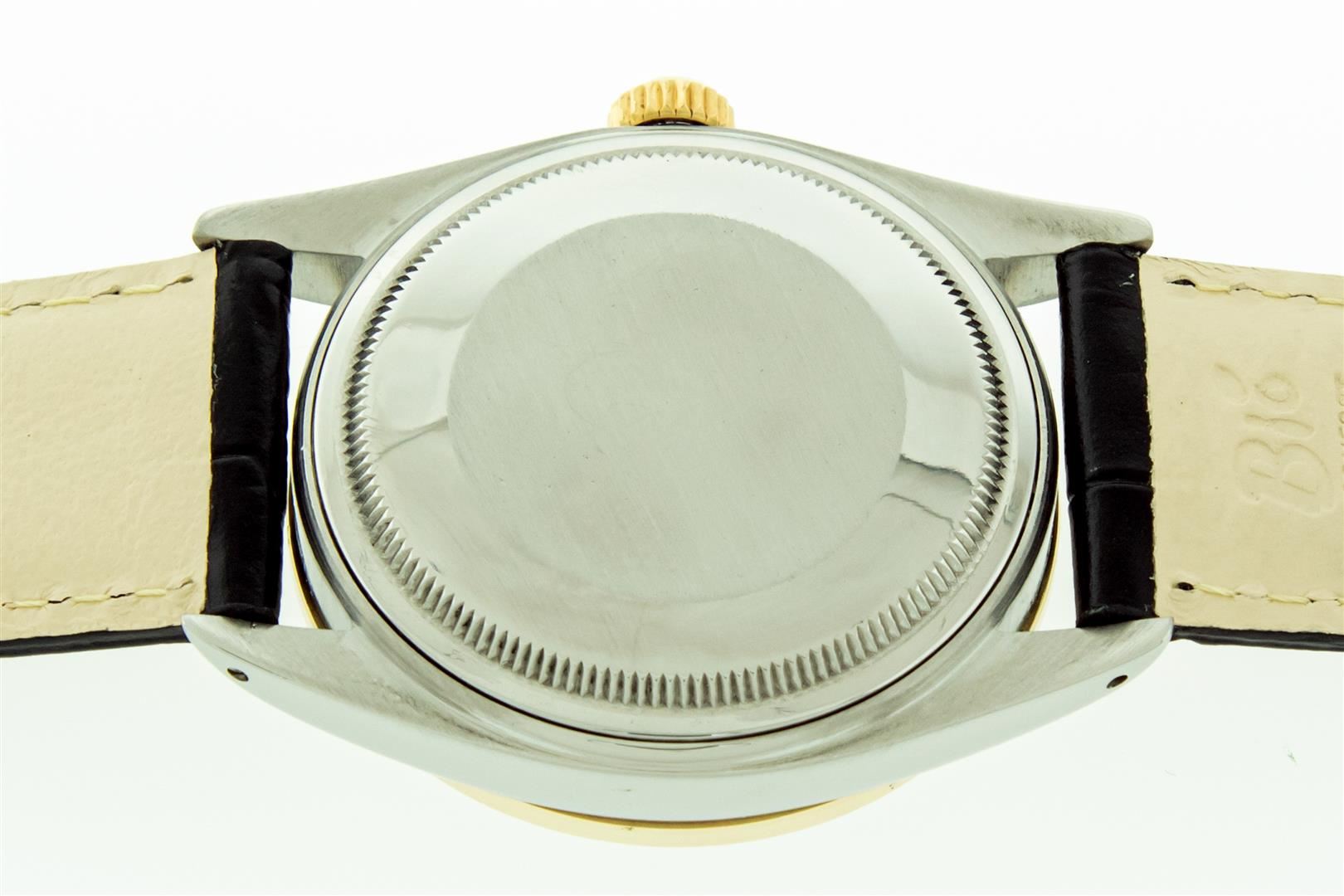 One Men's Yellow Gold Two Tone Rolex Datejust Polished, Serviced & Electronically Tested, Yellow Gold & Stainless Steel Case: 36mm, Yellow Gold Crown, Custom Bezel: New 18K Yellow Gold Beadset Diamond Bezel, Diamond Count: 44 Diamonds In Bezel, Clarity: SI-VS, Color: G to H. Custom Crystal: New Sapphire with Date Window. Custom Hands: New Luminescent Hands. Rolex Movement: Automatic Winding Movement. Custom Dial: Black Onyx Dial. Date Window: 3 O'Clock Position Date Display, Quickset, Model: Datejust. Condition: G-6 Extra Fine. Custom Band: New Black Leather Band. 7.0 Inch Length. New Custom Pink Buckle Clasp. This Watch Has Been Serviced Time Tested And Is In Excellent Condition It Is Free Of All Scratches And Dents.