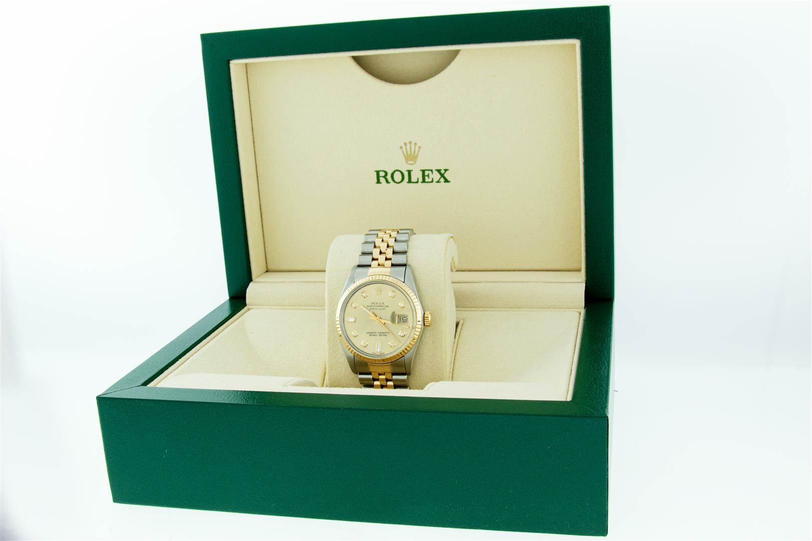 One Men's Pre Owned Yellow Gold Two Tone Rolex Datejust Polished, Serviced & Electronically Tested, Rolex Yellow Gold & Stainless Steel Case: 36mm, Rolex Yellow Gold Crown, Rolex Bezel: Yellow Gold Fluted Bezel. Custom Crystal: New Acrylic Cyclops Lens. Custom Hands: New Luminescent Hands. Rolex Movement: Automatic Winding Movement. Custom Dial: Refinish To Champagne With Added Diamonds, Diamond Count: 8 Diamonds + 2 Baguette Diamonds in Dial, G To H In Color, SI-VS Clarity. Date Window: 3 O'Clock Position Date Display, Quickset, Model: Datejust, Condition: G-6 Extra Fine. Rolex Bracelet: Two Tone Yellow Gold & Stainless Steel Jubilee Band. Bright Polish. 7.0 Inch Length, Adjustable. Standard Clasp, With Rolex Logo. This Watch Has Been Serviced And Polished It Is Free Of All Scratches And Dents.