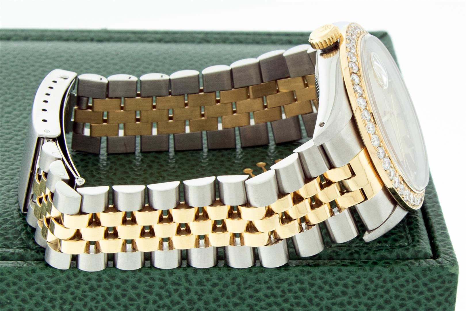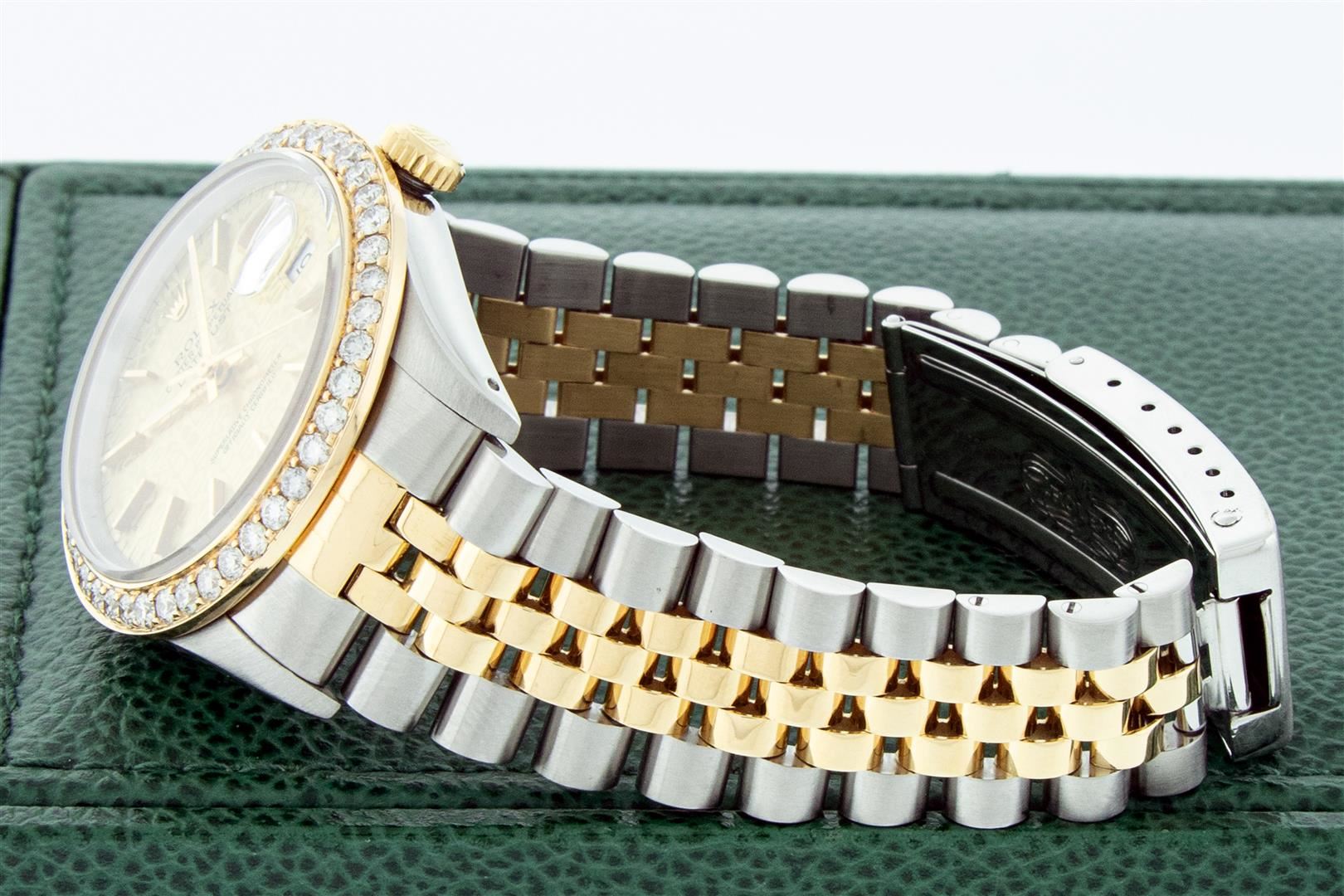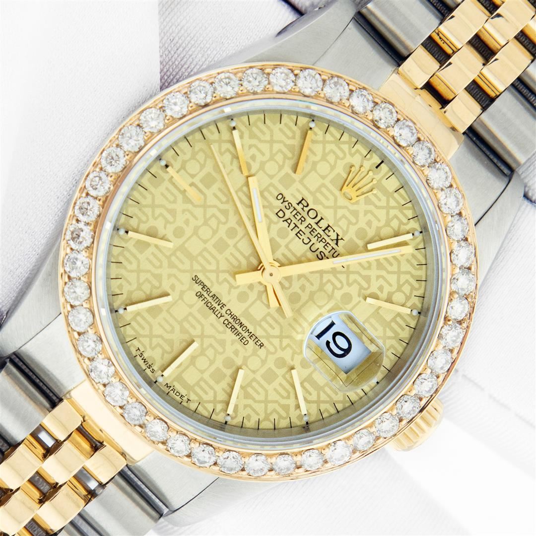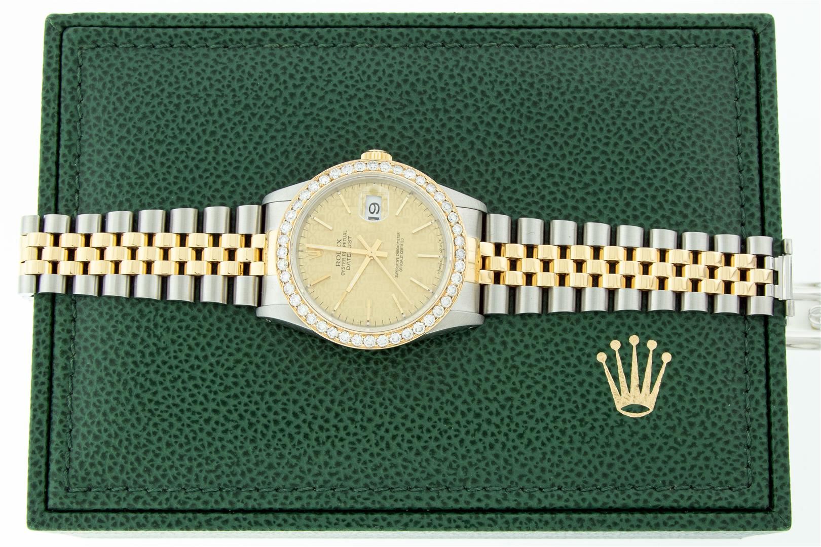 One Men's Pre Owned Yellow Gold Two Tone Rolex Datejust Polished, Serviced & Electronically Tested, Rolex Yellow Gold & Stainless Steel Case: 36mm,Rolex Yellow Gold Crown, Custom Bezel: New 18K Yellow Gold Beadset Diamond Bezel, Diamond Count: 40 Diamonds On Bezel, Total Bezel Weight 2.5 Carat, Clarity: SI-VS, Color: G to H. Custom Crystal: New Scratch Resistant Synthetic Sapphire Cyclops Lens. Custom Hands: New Luminescent Hands. Rolex Movement: Automatic Winding Movement. Rolex Dial: Champagne Jubilee Dial With Index Hour Markers and Small Track With Lumi Dots. Date Window: 3 O'Clock Position Date Display, Quickset, Model: Datejust. Condition: G-6 Extra Fine. Rolex Bracelet: Two Tone Yellow Gold & Stainless Steel Jubilee Band. Bright Polish. 7.0 Inch Length, Adjustable. Standard Clasp, With Rolex Logo. This Watch Has Been Serviced Time Tested And Is In Excellent Condition It Is Free Of All Scratches And Dents. This Watch Comes With A Rolex Box.
