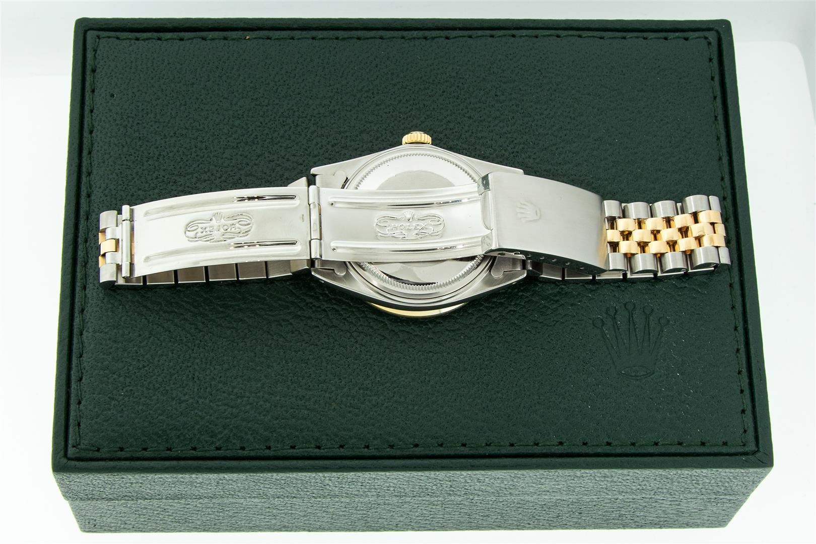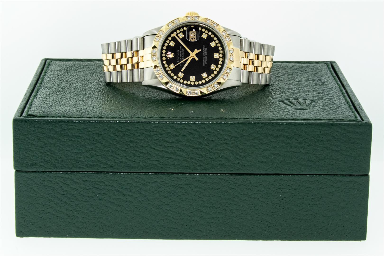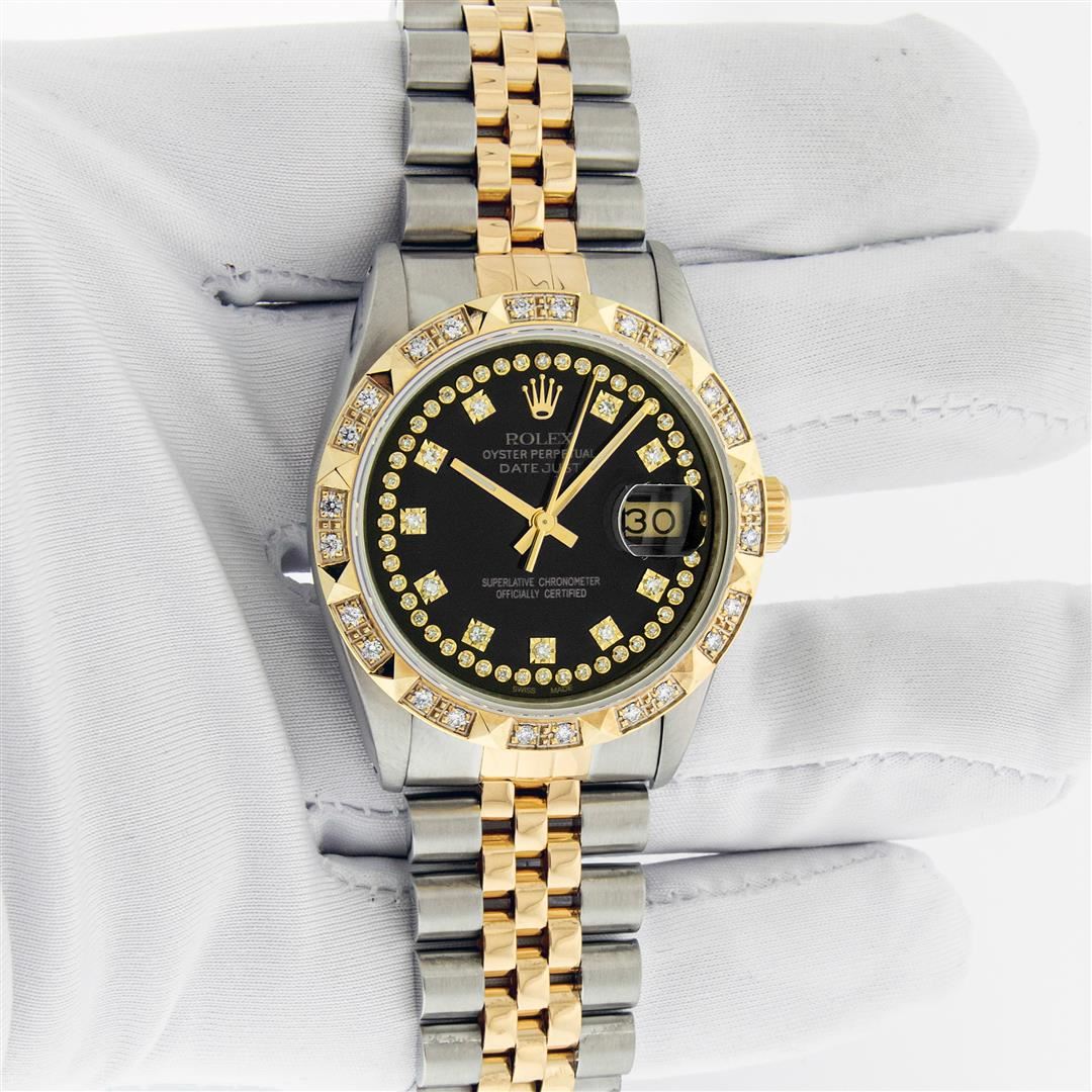 One Men's Yellow Gold Rolex Datejust Polished Bright with Satin Finish, Serviced & Electronically Tested, Rolex Stainless Steel Case: 36mm, Rolex Yellow Gold Crown, Custom Bezel: New 18K Yellow Gold Pyramid Diamond Bezel, Diamond Count: 24 Diamonds, Clarity: SI-VS, Color: G to H. Custom Crystal: New Sapphire with Magnified Date Window. Custom Hands: New Luminescent Hands. Rolex Movement: Automatic Winding Movement. Custom Dial: Refinished To Black String with Added Diamonds, Diamond Count: 58 Diamonds In Dial, Color: G to H, Clarity: VS. Date Window: 3 O'clock Position Date Display, Quickset, Model: Datejust. Condition: G-6 Extra Fine. Rolex Bracelet: Yellow Gold And Stainless Steel Jubilee Band. Bright Polish & Satin Finish. 7.0 Inch Length, Adjustable. Standard Clasp, with Rolex Logo. This Preowned Watch Has Been Serviced And Polished It Is Free Of All Scratches And Dents. This Watch Comes with A Rolex Box.