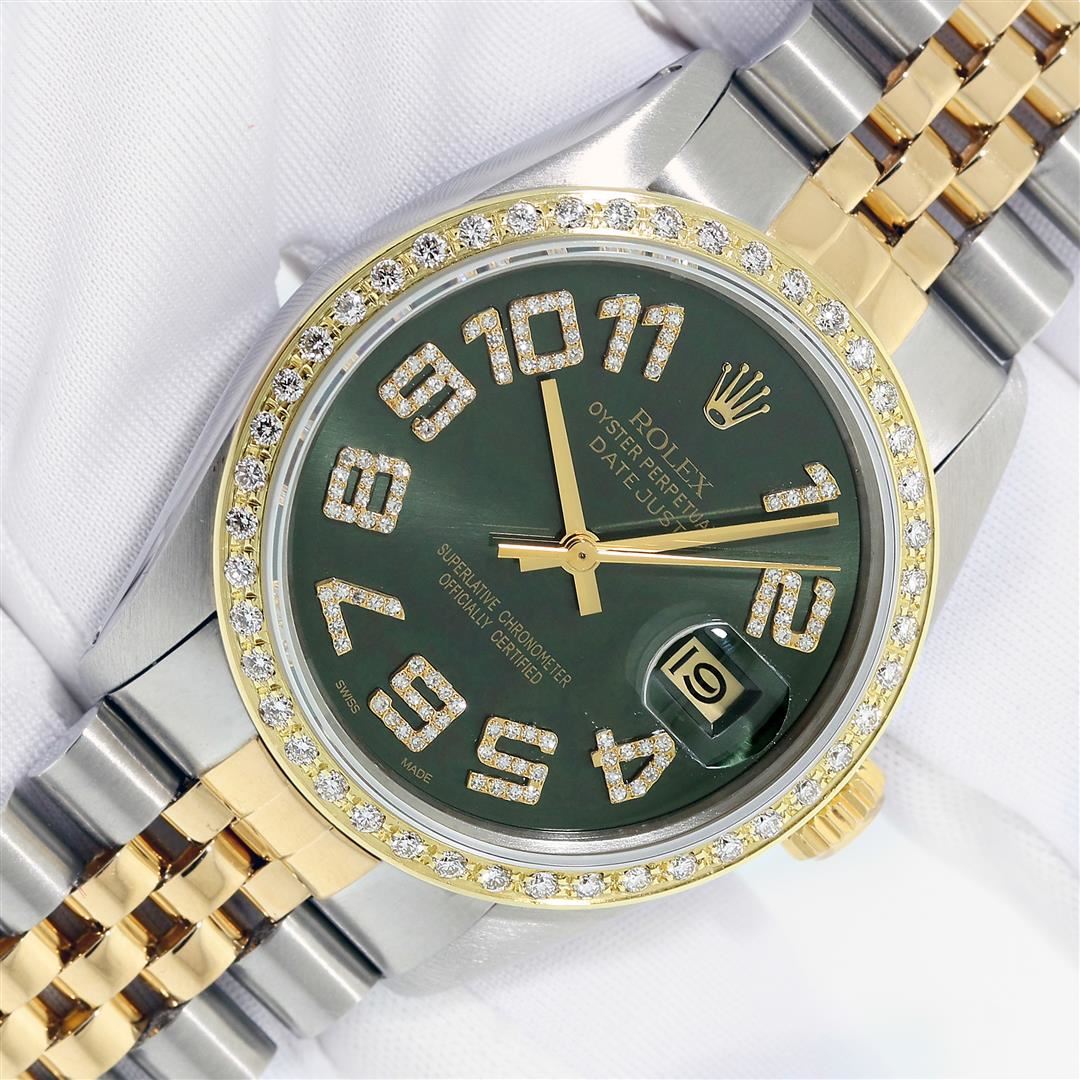 One Men's Yellow Gold Two Tone Rolex Datejust Polished, Serviced & Electronically Tested, Rolex Yellow Gold & Stainless Steel Case: 36mm, Rolex Yellow Gold Crown, Custom Bezel: New 18K Yellow Gold Beadset Diamond Bezel, Diamond Count: 44 Diamonds, Clarity: SI-VS, Color: G to H. Custom Crystal: New Sapphire with Magnified Date Window. Custom Hands: New Luminescent Hands. Rolex Movement: Automatic Winding Movement. Custom Dial: Refinished To Green with Added Arabic Diamond Hour Markers, G To H In Color, VS In Clarity. Date Window: 3 O'Clock Position Date Display, Quickset, Model: Datejust. Condition: G-6 Extra Fine. Rolex Bracelet: Two Tone Yellow Gold & Stainless Steel Jubilee Band. Bright Polish. 7.0 Inch Length, Adjustable. Standard Clasp, with Rolex Logo. This Pre Owned Watch Has Been Serviced Time Tested And Is In Excellent Condition It Is Free Of All Scratches And Dents.
