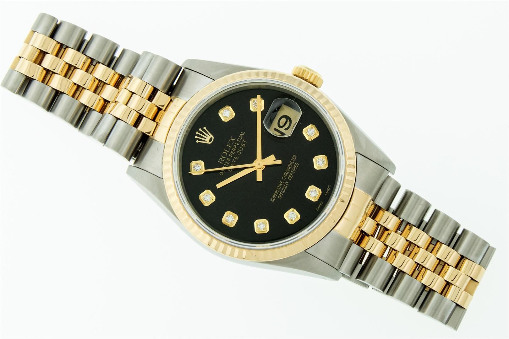 One Men's Pre Owned Yellow Gold Two Tone Rolex Datejust Polished, Serviced & Electronically Tested, Rolex Yellow Gold & Stainless Steel Case: 36mm, Rolex Yellow Gold Crown, Rolex Bezel: Yellow Gold Fluted Bezel. Custom Crystal: New Acrylic Cyclops Lens. Custom Hands: New Gold Hands. Rolex Movement: Automatic Winding Movement. Custom Dial: Refinished To Black Dial Set With VS Custom Added Diamond Hour Markers, Diamond Count: 10 Diamonds in Dial G To H In Color, SI-VS Clarity. Date Window: 3 O'clock Position Date Display, Quickset, Model: Condition: G-6 Extra Fine. Rolex Bracelet: Two Tone Yellow Gold & Stainless Steel Jubilee Band. Bright Polish. 7.0 Inch Length, Adjustable. Standard Clasp, With Rolex Logo. This Watch Has Been Serviced And Polished It Is Free Of All Scratches And Dents.