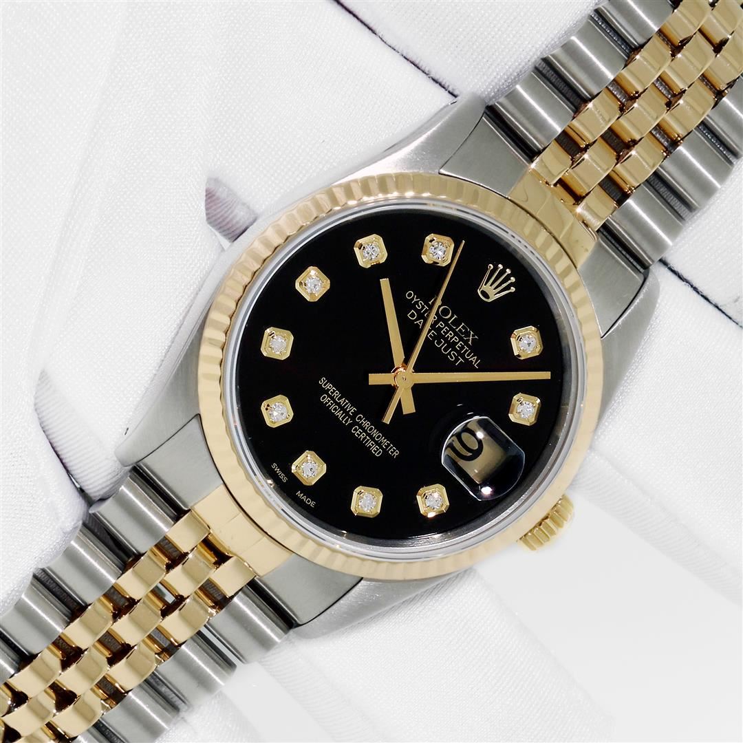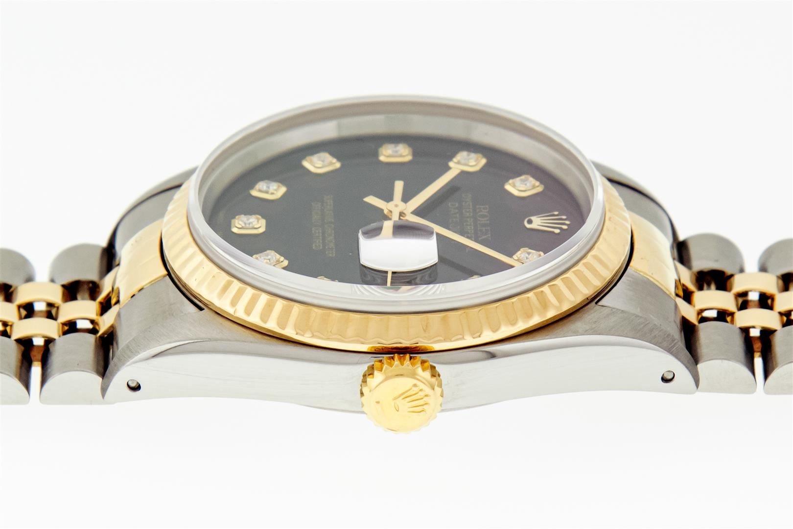 One Men's Pre Owned Yellow Gold Two Tone Rolex Datejust Polished, Serviced & Electronically Tested, Rolex Yellow Gold & Stainless Steel Case: 36mm, Rolex Yellow Gold Crown, Rolex Bezel: Yellow Gold Fluted Bezel. Custom Crystal: New Acrylic Cyclops Lens. Custom Hands: New Gold Hands. Rolex Movement: Automatic Winding Movement. Custom Dial: Refinished To Black Dial Set With VS Custom Added Diamond Hour Markers, Diamond Count: 10 Diamonds in Dial G To H In Color, SI-VS Clarity. Date Window: 3 O'clock Position Date Display, Quickset, Model: Condition: G-6 Extra Fine. Rolex Bracelet: Two Tone Yellow Gold & Stainless Steel Jubilee Band. Bright Polish. 7.0 Inch Length, Adjustable. Standard Clasp, With Rolex Logo. This Watch Has Been Serviced And Polished It Is Free Of All Scratches And Dents.
