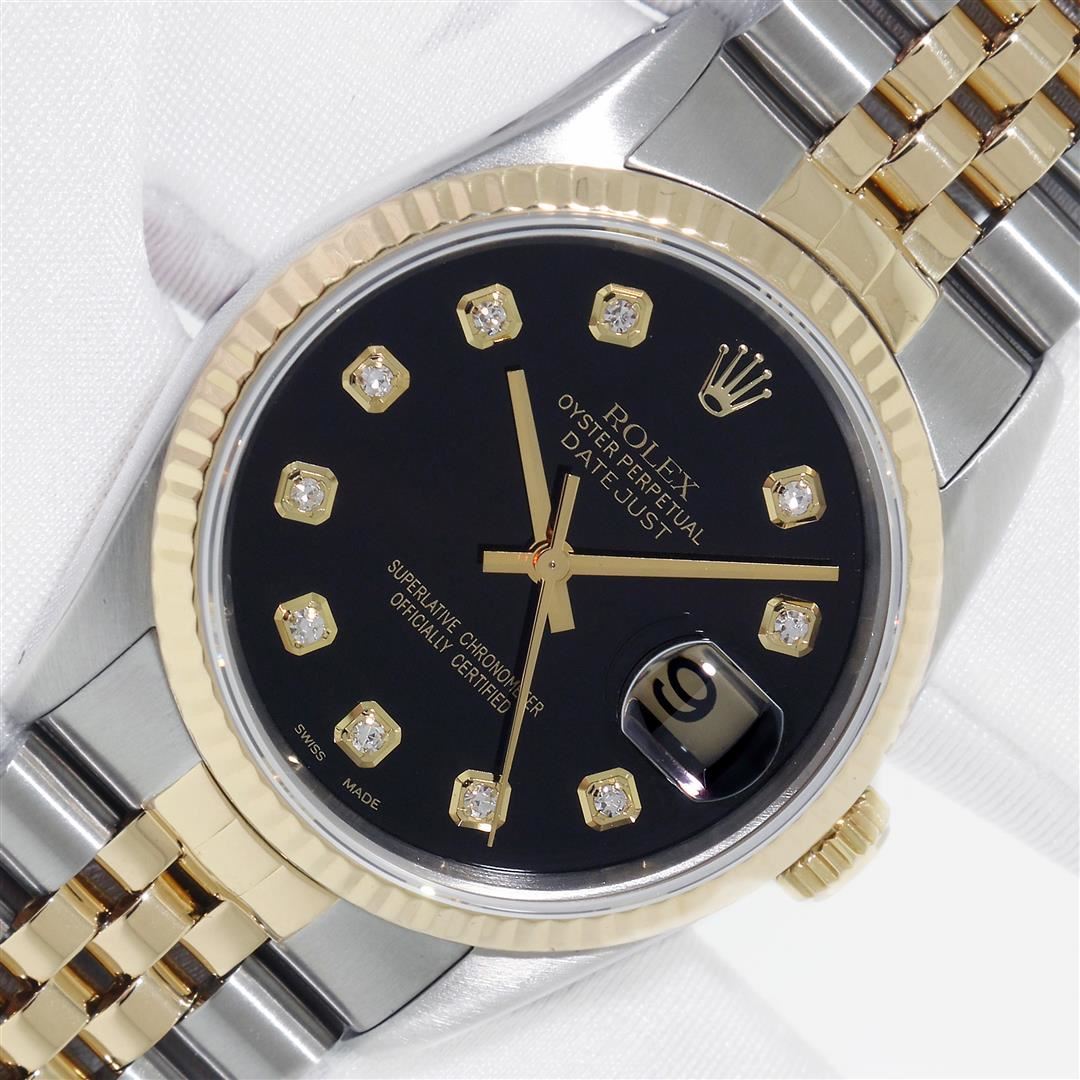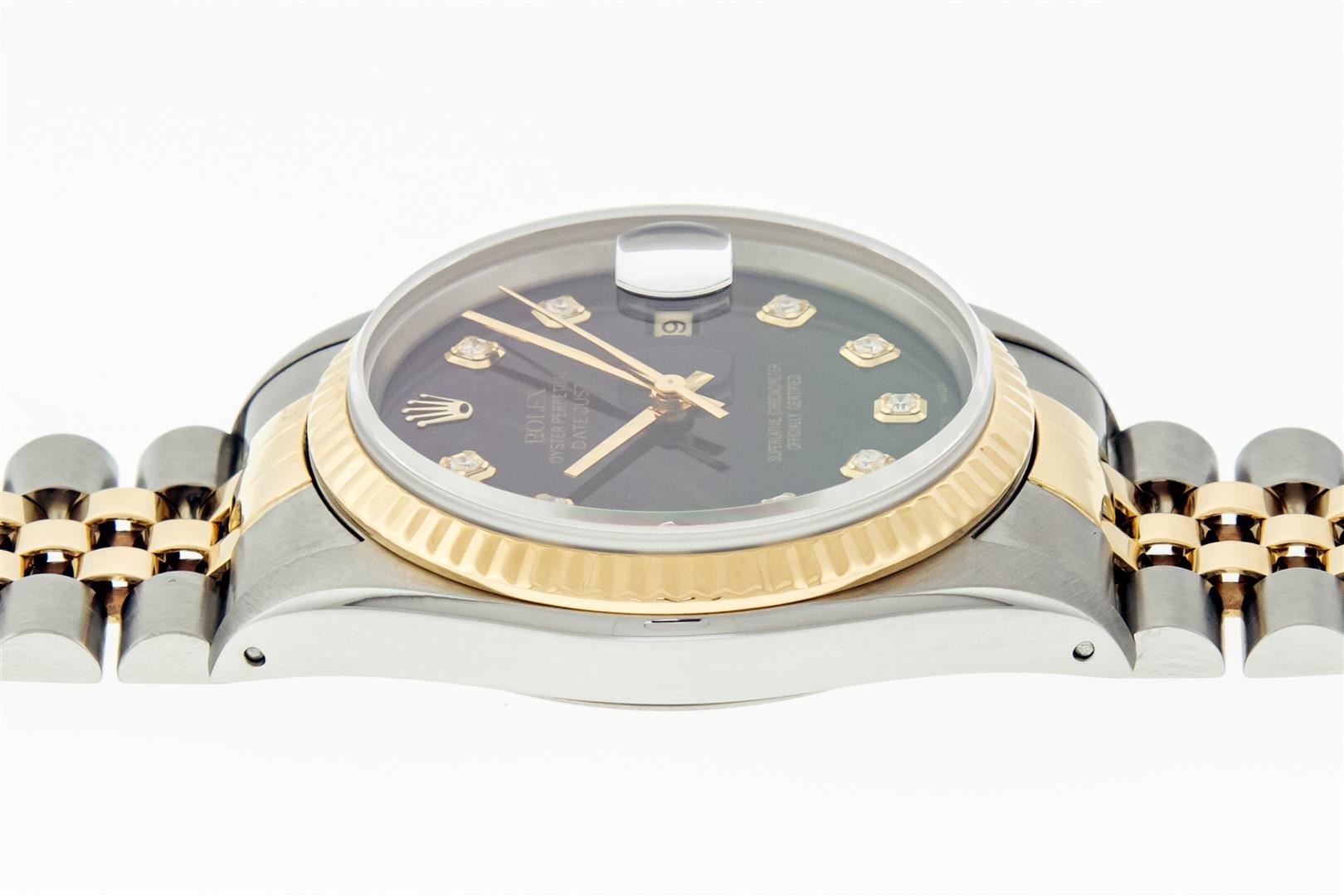 One Men's Pre Owned Yellow Gold Two Tone Rolex Datejust Polished, Serviced & Electronically Tested, Rolex Yellow Gold & Stainless Steel Case: 36mm, Rolex Yellow Gold Crown, Rolex Bezel: Yellow Gold Fluted Bezel. Custom Crystal: New Acrylic Cyclops Lens. Custom Hands: New Gold Hands. Rolex Movement: Automatic Winding Movement. Custom Dial: Refinished To Black Dial Set With VS Custom Added Diamond Hour Markers, Diamond Count: 10 Diamonds in Dial G To H In Color, SI-VS Clarity. Date Window: 3 O'clock Position Date Display, Quickset, Model: Condition: G-6 Extra Fine. Rolex Bracelet: Two Tone Yellow Gold & Stainless Steel Jubilee Band. Bright Polish. 7.0 Inch Length, Adjustable. Standard Clasp, With Rolex Logo. This Watch Has Been Serviced And Polished It Is Free Of All Scratches And Dents.