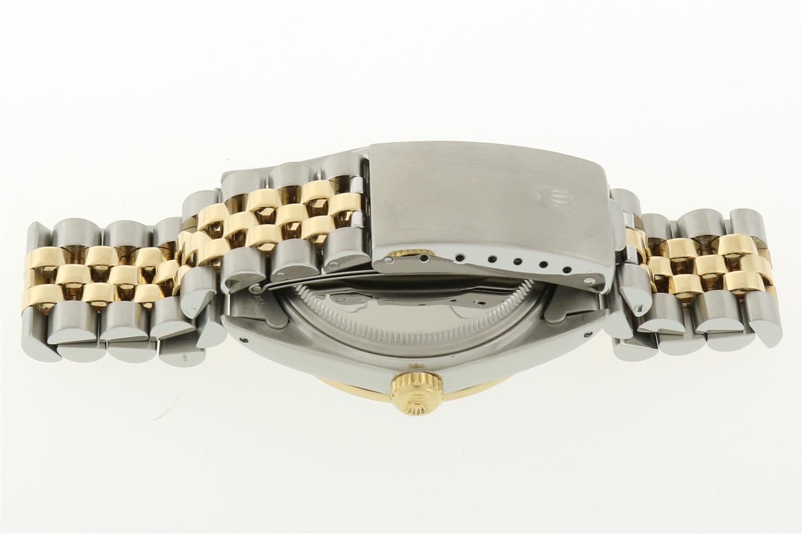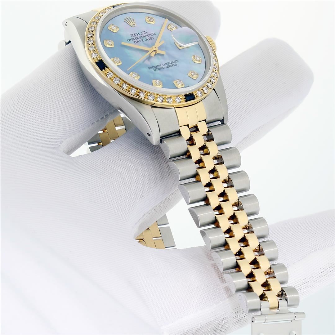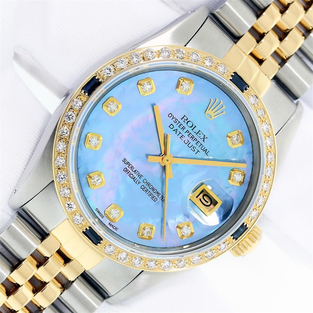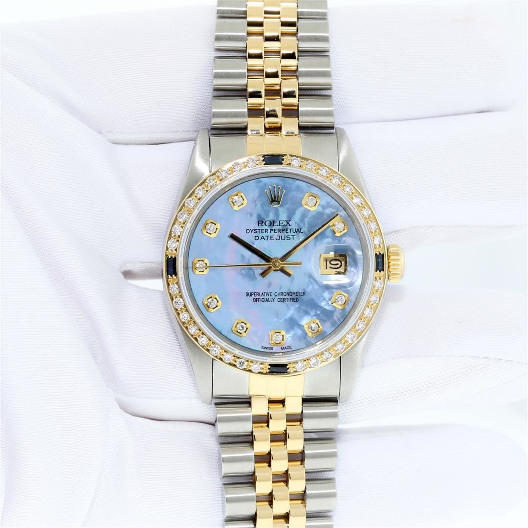 One Men's Yellow Gold Two Tone Rolex Datejust Polished, Serviced & Electronically Tested, Yellow Gold & Stainless Steel Case: 36mm, Rolex Yellow Gold Crown, Custom Bezel: New 18K Yellow Gold Sapphire Beadset Diamond Bezel, Diamond Count: 36 Diamonds + 4 Sapphires, Clarity: SI-VS, Color: G to H. Custom Crystal: New Sapphire with Magnified Date Window. Custom Hands: New Luminescent Hands. Rolex Movement: Automatic Winding Movement. Custom Dial: Blue MOP with Added Diamond Hour Markers. Diamond Count: 10 Diamonds In Dial, Clarity: SI-VS, Color: Color G to H Date Window: 3 O'Clock Position Date Display, Quickset, Model: Datejust. Condition: G-6 Extra Fine. Rolex Bracelet: Two Tone Yellow Gold & Stainless Steel Jubilee Band. Bright Polish. 7.0 Inch Length, Adjustable. Standard Clasp, with Rolex Logo. This Pre Owned Watch Has Been Serviced Time Tested And Is In Excellent Condition It Is Free Of All Scratches And Dents.