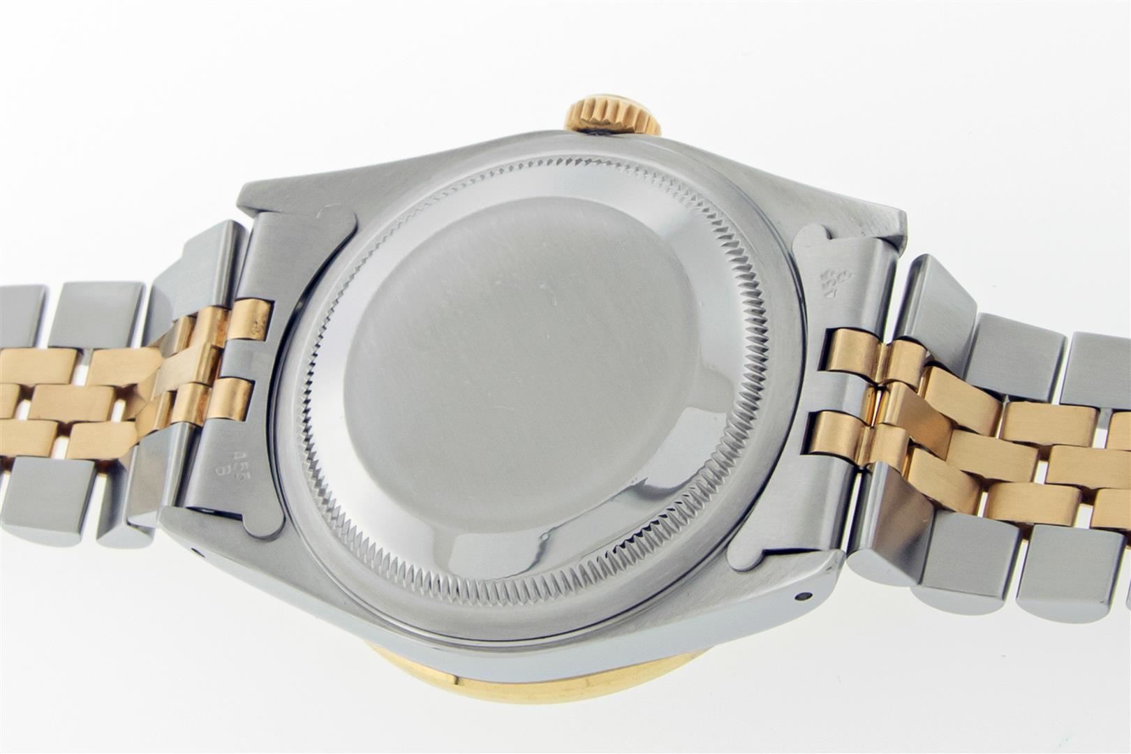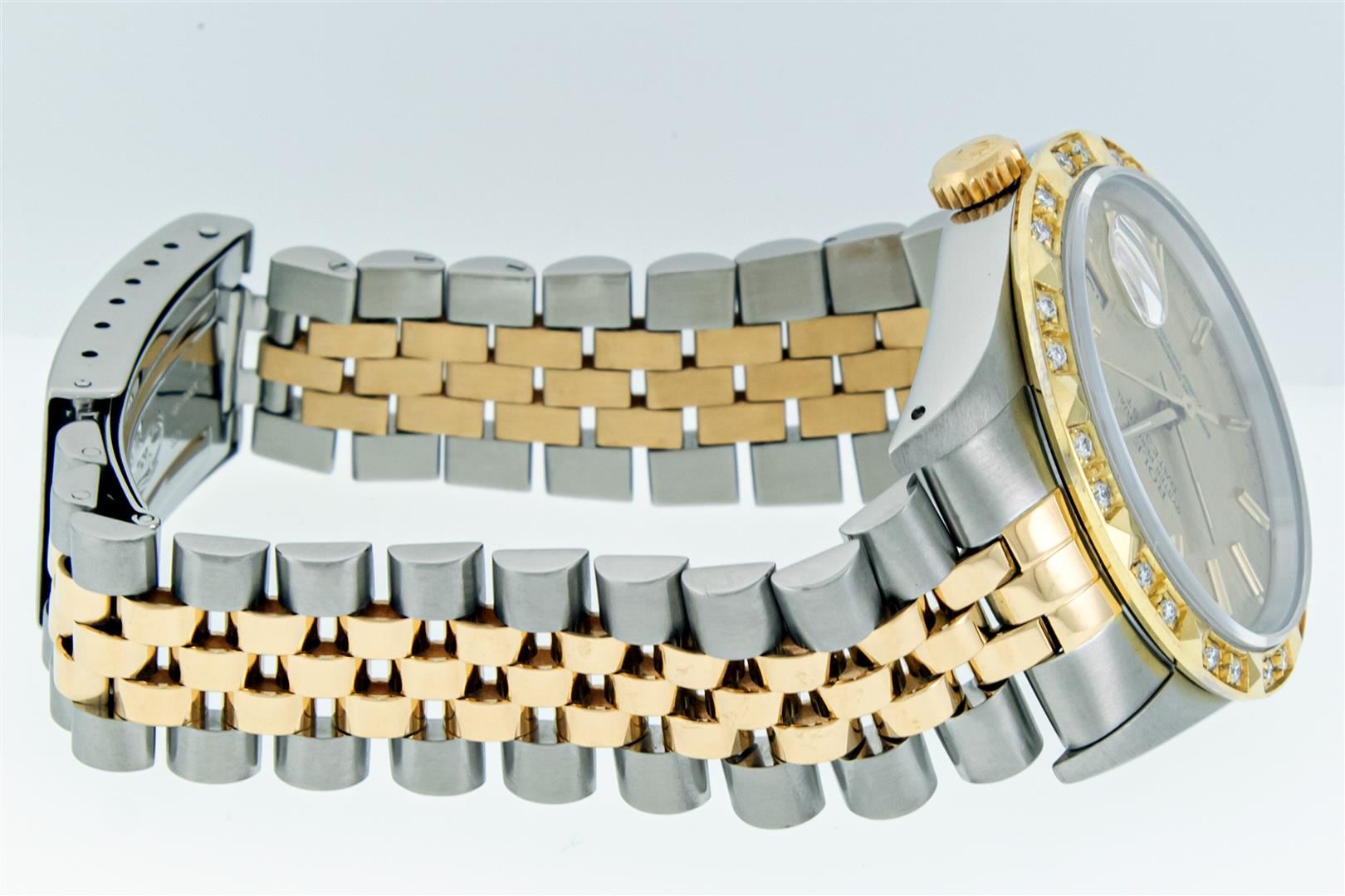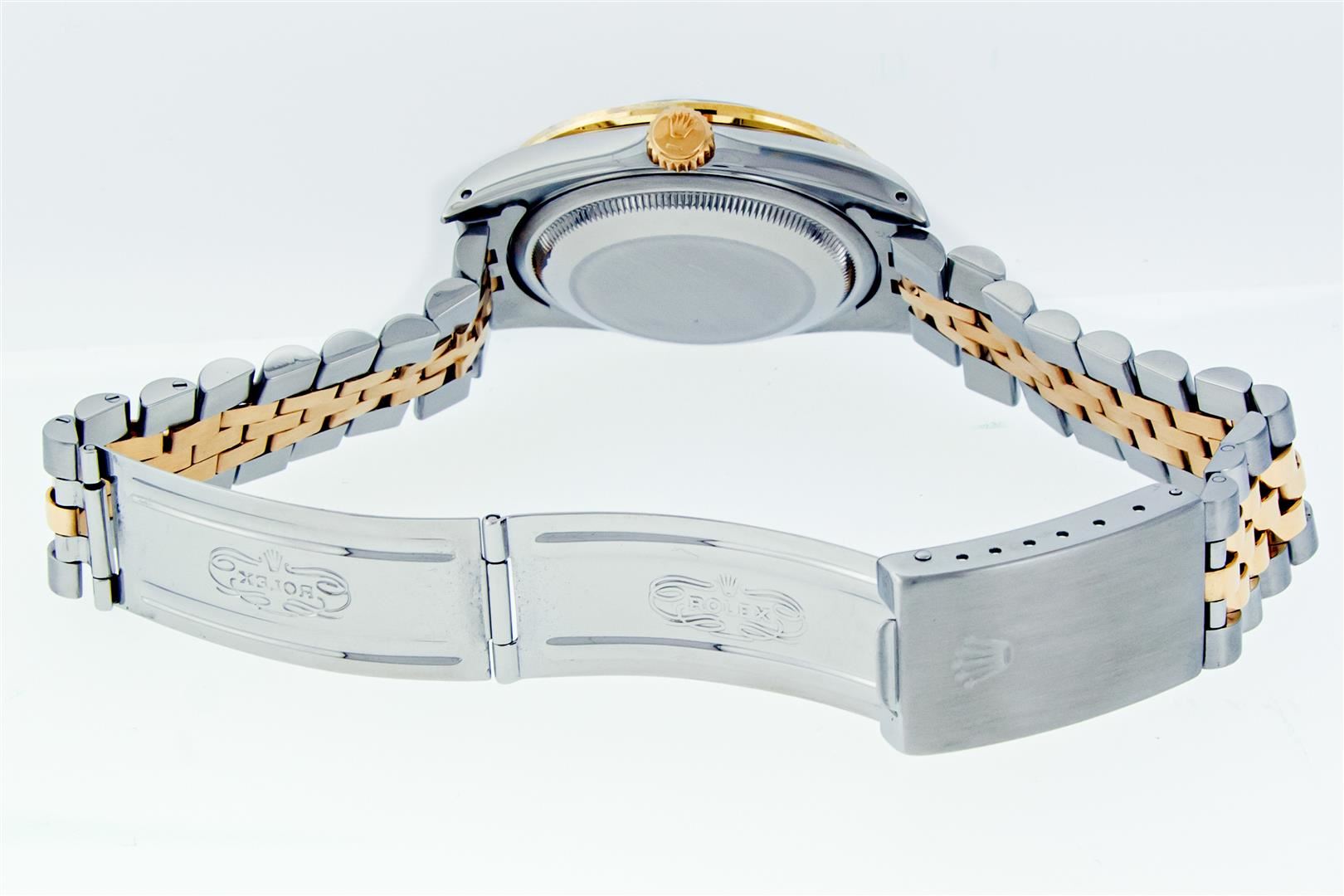One Men's Pre Owned Yellow Gold Two Tone Rolex Datejust Polished, Serviced & Electronically Tested, Rolex Yellow Gold & Stainless Steel Case: 36mm, Rolex 14K Yellow Gold Crown, Custom Bezel: New 18K Yellow Gold Pyramid Diamond Bezel, Diamond Count On Bezel: 24 Diamonds, Total Weight .75 Carat, Clarity: SI-VS, Color: G to H. Custom Crystal: New Scratch Resistant Synthetic Sapphire Cyclops Lens. Custom Hands: New Luminescent Hands. Rolex Movement: Automatic Winding Movement. Rolex Dial: Champagne Jubilee Dial With Index Hour Markers and Small Track With Lumi Dots. Date Window: 3 O'Clock Position Date Display, Quickset, Model: Datejust. Condition: G-6 Extra Fine. Rolex Bracelet: Two Tone Yellow Gold & Stainless Steel Jubilee Band. Bright Polish. 7.0 Inch Length, Adjustable. Standard Clasp, With Rolex Logo. This Watch Has Been Serviced Time Tested And Is In Excellent Condition It Is Free Of All Scratches And Dents. This Watch Comes With Rolex Box And Booklets.