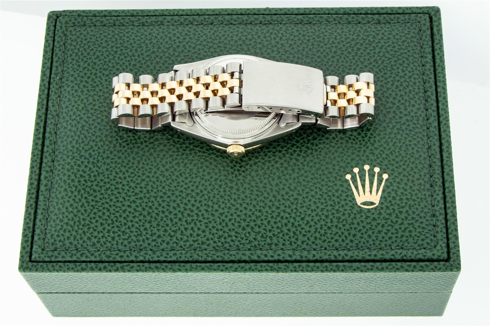 One Men's Yellow Gold Two Tone Rolex Datejust Polished, Serviced & Electronically Tested, Rolex Yellow Gold & Stainless Steel Case: 36mm, Rolex Yellow Gold Crown, Custom Bezel: New 18K Yellow Gold Emerald Beadset Diamond Bezel, Diamond Count: 36 Diamonds + 4 Emeralds, Total Weight 1.00 Carat, Clarity: SI-VS, Color: G to H. Custom Crystal: New Sapphire With Magnified Date Window. Custom Hands: New Luminescent Hands. Rolex Movement: Automatic Winding Movement. Custom Dial: Refinished To Green With Added Diamonds, Diamond Count: 58 Diamonds in Dial, G To H In Color, SI-VS Clarity. Date Window: 3 O'clock Position Date Display, Quickset, Model: Datejust. Condition: G-6 Extra Fine. Rolex Bracelet: Two Tone Yellow Gold & Stainless Steel Jubilee Band. Bright Polish. 7.0 Inch Length, Adjustable. Standard Clasp, With Rolex Logo. This Watch Has Been Serviced Time Tested And Is In Excellent Condition It Is Free Of All Scratches And Dents. This Pre Owned Watch Comes With A Rolex Box.
