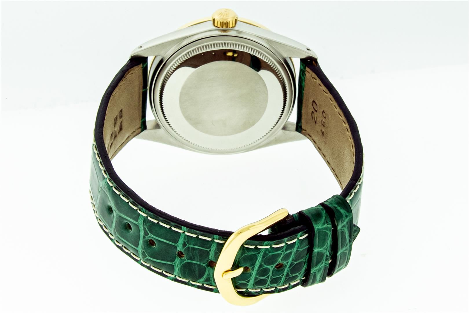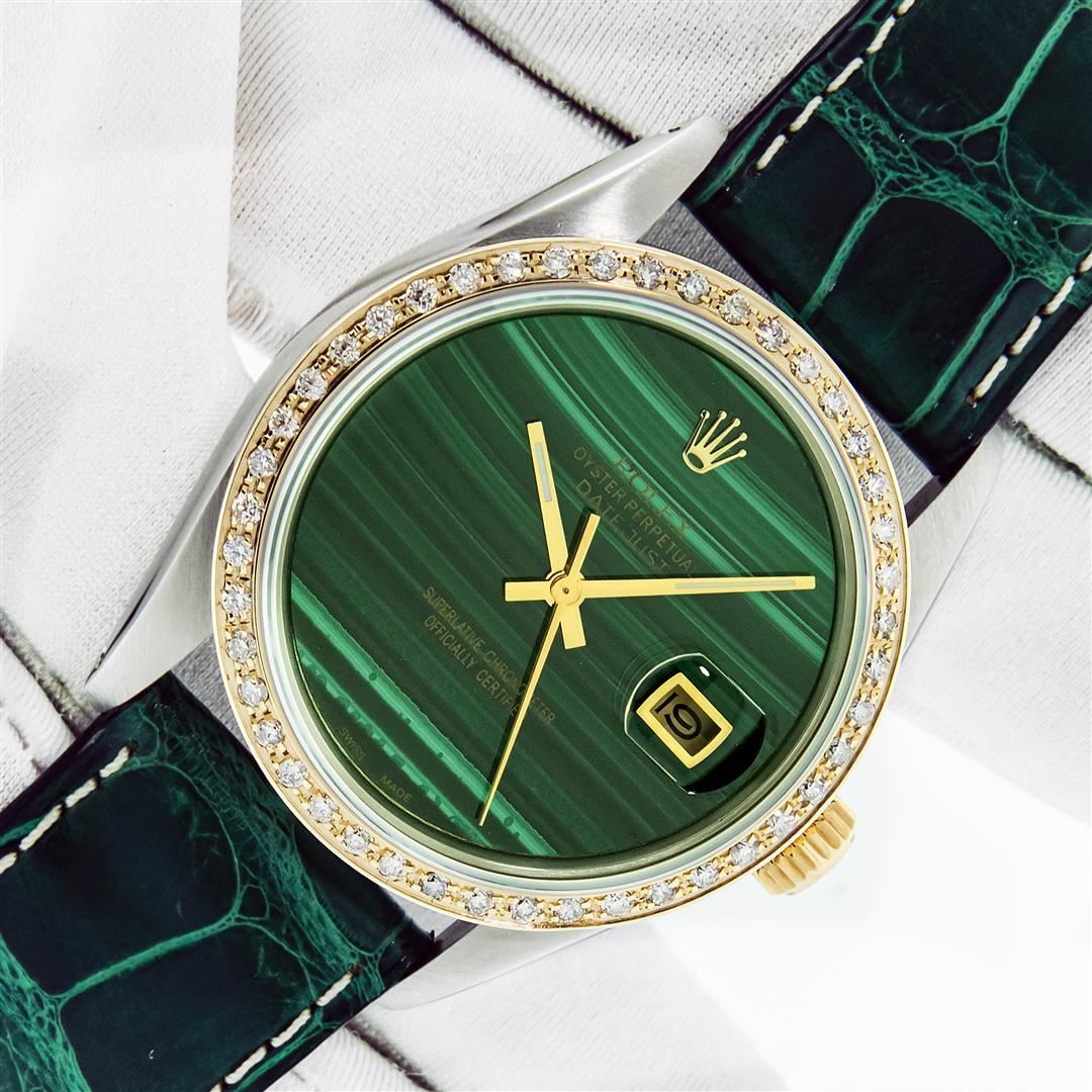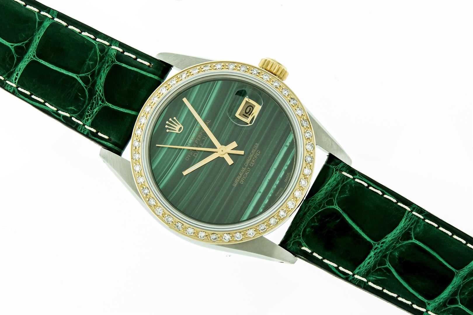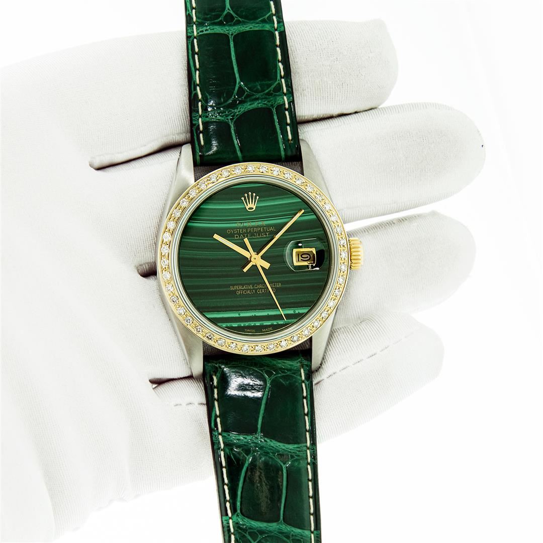 One Mens Yellow Gold Two Tone Rolex Datejust Polished, Serviced & Electronically Tested, Yellow Gold & Stainless Steel Case: 36mm, Yellow Gold Crown, Custom Bezel: New 18K Yellow Gold Beadset Diamond Bezel, Diamond Count: 44 Diamonds In Bezel, Total Bezel Weight 1.00 Carat, Clarity: SI-VS, Color: G to H. Custom Crystal: New Sapphire With Date Window. Custom Hands: New Luminescent Hands. Rolex Movement: Automatic Winding Movement. Custom Dial: Green Malachite Dial. Date Window: 3 O'Clock Position Date Display, Quickset, Model: Datejust. Condition: G-6 Extra Fine. Custom Band: New Green Leather Band With White Stitching. 7.0 Inch Length. New Custom Buckle Clasp. This Watch Has Been Serviced Time Tested And Is In Excellent Condition It Is Free Of All Scratches And Dents. This Watch Comes With A Rolex Box & Booklets.