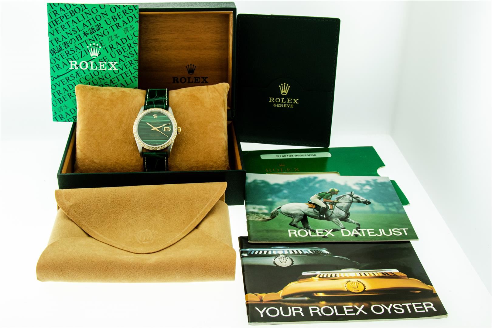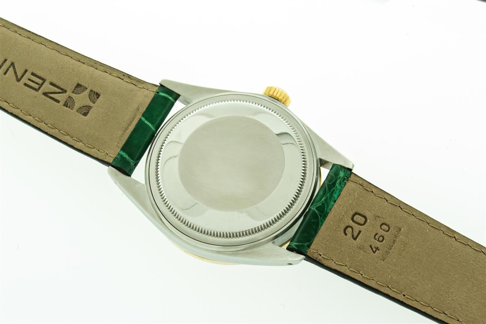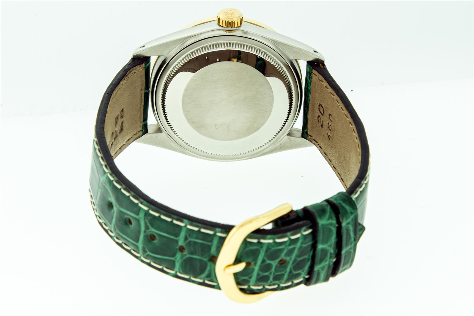 One Mens Yellow Gold Two Tone Rolex Datejust Polished, Serviced & Electronically Tested, Yellow Gold & Stainless Steel Case: 36mm, Yellow Gold Crown, Custom Bezel: New 18K Yellow Gold Beadset Diamond Bezel, Diamond Count: 44 Diamonds In Bezel, Total Bezel Weight 1.00 Carat, Clarity: SI-VS, Color: G to H. Custom Crystal: New Sapphire With Date Window. Custom Hands: New Luminescent Hands. Rolex Movement: Automatic Winding Movement. Custom Dial: Green Malachite Dial. Date Window: 3 O'Clock Position Date Display, Quickset, Model: Datejust. Condition: G-6 Extra Fine. Custom Band: New Green Leather Band With White Stitching. 7.0 Inch Length. New Custom Buckle Clasp. This Watch Has Been Serviced Time Tested And Is In Excellent Condition It Is Free Of All Scratches And Dents. This Watch Comes With A Rolex Box & Booklets.