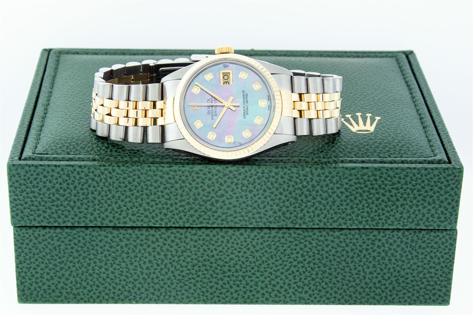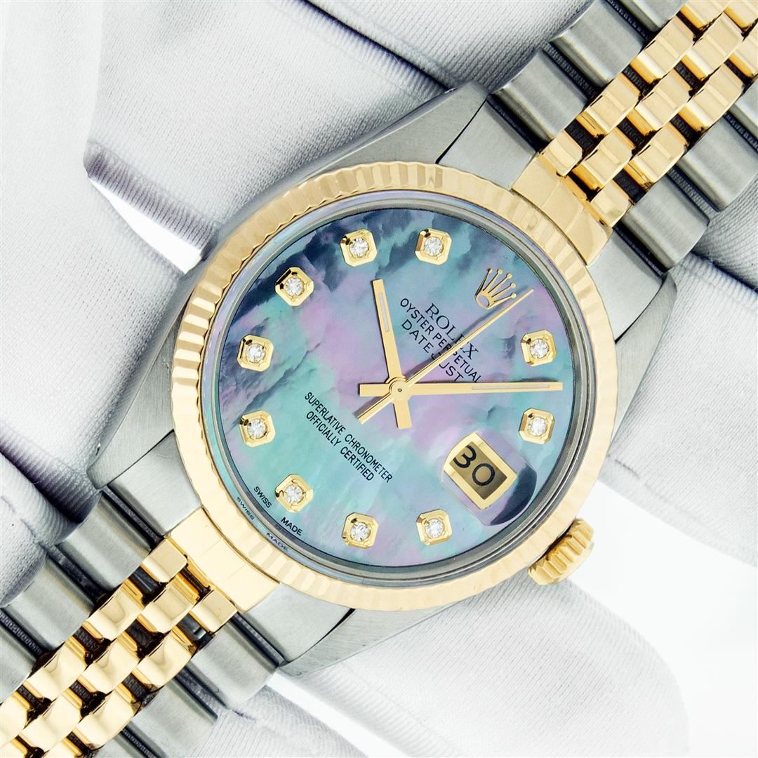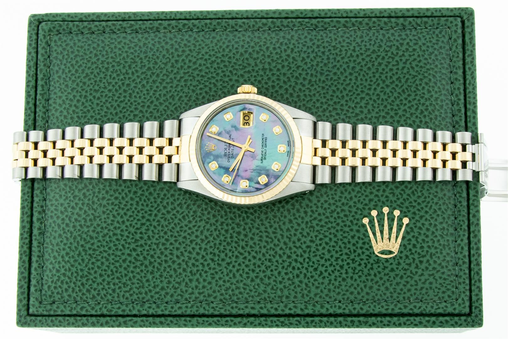 One Men's Pre Owned Yellow Gold Two Tone Rolex Datejust Polished, Serviced & Electronically Tested, Rolex Yellow Gold & Stainless Steel Case: 36mm, Rolex Yellow Gold Crown, Rolex Bezel: Yellow Gold Fluted Bezel. Custom Crystal: New Acrylic Cyclops Lens. Custom Hands: New Luminescent Hands. Rolex Movement: Automatic Winding Movement. Custom Dial: Refinished To Tahitian Mother Of Pearl With Added Diamonds, Stone Count: 10 Diamonds On Dial, G To H In Color, SI-VS Clarity. Date Window: 3 O'Clock Position Date Display, Quickset, Model: Datejust. Condition: G-6 Extra Fine. Rolex Bracelet: Two Tone Yellow Gold & Stainless Steel Jubilee Band. Bright Polish. 7.0 Inch Length, Adjustable. Standard Clasp, With Rolex Logo. This Watch Has Been Serviced And Polished It Is Free Of All Scratches And Dents. This Watch Comes With A Rolex Box.