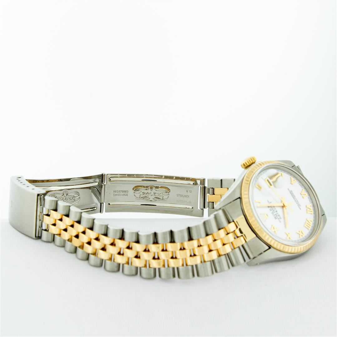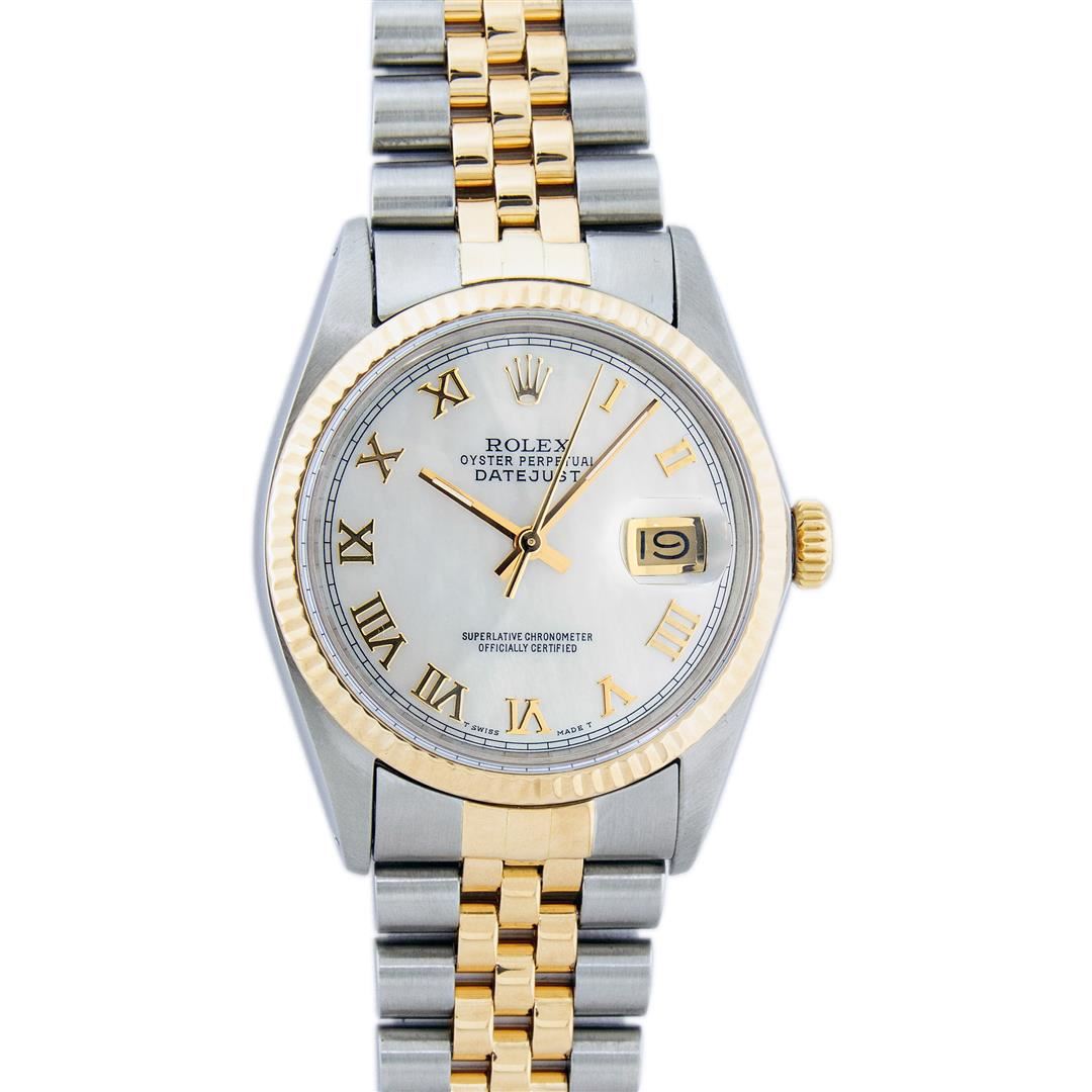 One Men's Pre Owned Yellow Gold Two Tone Rolex Datejust Polished, Serviced & Electronically Tested, Rolex Yellow Gold & Stainless Steel Case: 36mm, Rolex Yellow Gold Crown, Rolex Bezel: Yellow Gold Fluted Bezel. Custom Crystal: New Acrylic Cyclops Lens. Custom Hands: New Luminescent Hands. Rolex Movement: Automatic Winding Movement. Custom Dial: Refinished To Mother Of Pearl Roman With Square Track. Date Window: 3 O'Clock Position Date Display, Quickset, Model: Datejust. Condition: G-6 Extra Fine. Rolex Bracelet: Two Tone Yellow Gold & Stainless Steel Jubilee Band. Bright Polish. 7.0 Inch Length, Adjustable. Standard Clasp, With Rolex Logo. This Watch Has Been Serviced Time Tested And Is In Excellent Condition It Is Free Of All Scratches And Dents.