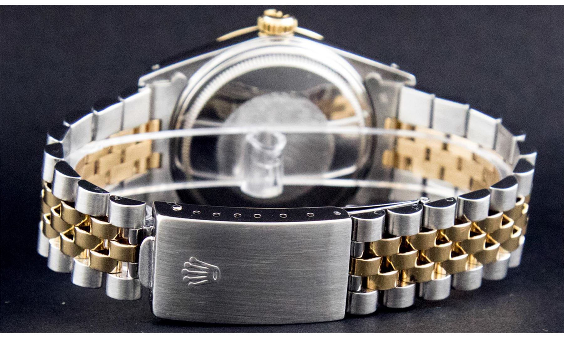 One Men's Yellow Gold Two Tone Rolex Datejust Polished, Serviced & Electronically Tested, Yellow Gold & Stainless Steel Case: 36mm, Yellow Gold Crown, Custom Bezel: New 18K Yellow Gold Beadset Diamond Bezel, Diamond Count: 44 Diamonds, Total Weight 1.00 Carat, Clarity: SI-VS, Color: G to H. Custom Crystal: New Synthetic Sapphire Cyclops Lens. Movement: Automatic Winding Movement. Custom Dial: Mother Of Pearl Diamond Dial with 2 Baguette Hour Markers, Diamond Count: 8 Diamonds + 2 Baguette Diamond Hour Markers, Color: G To H In Color, Clarity: SI-VS, Date Window: 3 O'Clock Position Date Display, Quickset, Model: Datejust. Condition: G-6 Extra Fine. Bracelet: Two Tone Yellow Gold & Stainless Steel Jubilee. Bright Polish. 7.0 Inch Length, Adjustable. Standard Clasp, With Rolex Logo. This Watch Has Been Serviced Time Tested And Is In Excellent Condition It Is Free Of All Scratches And Dents.