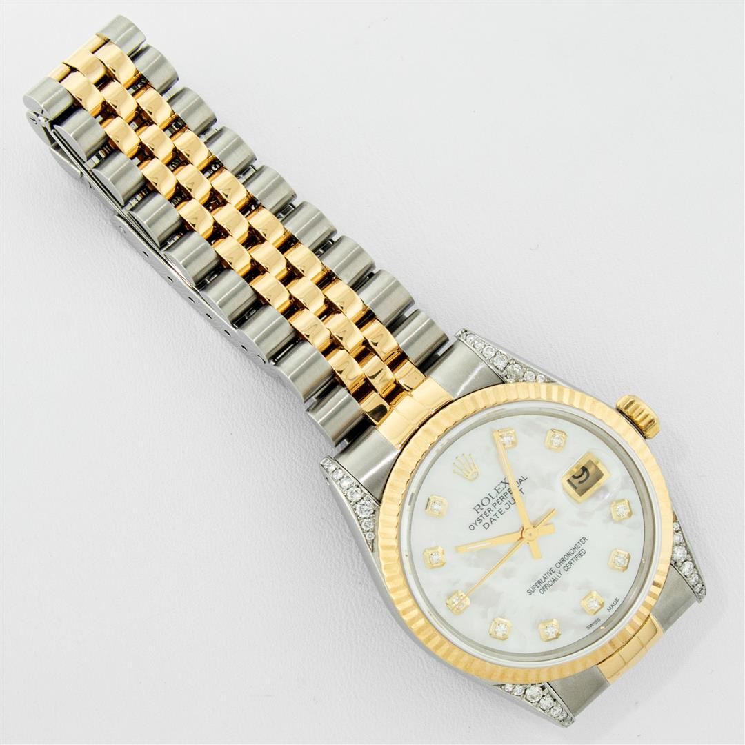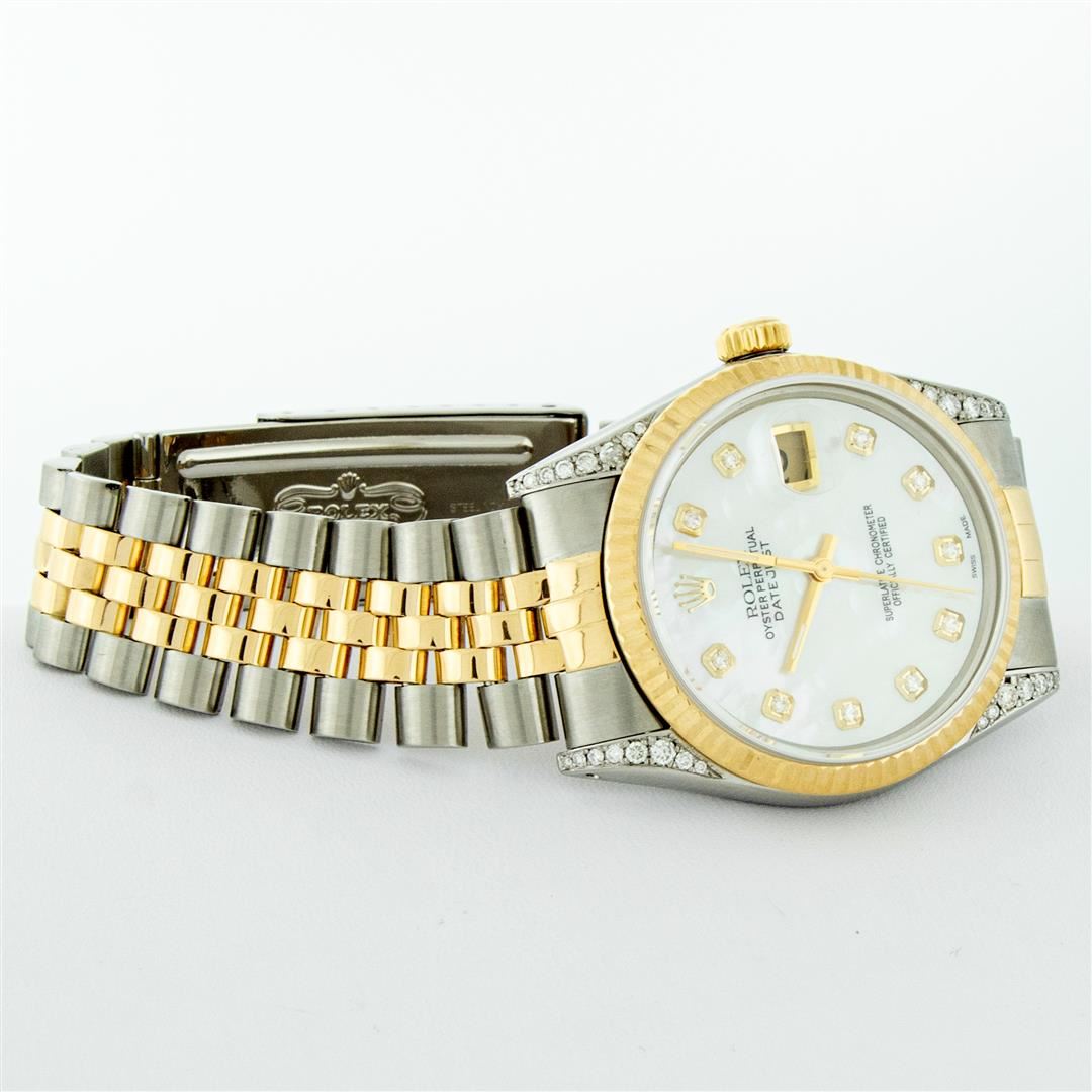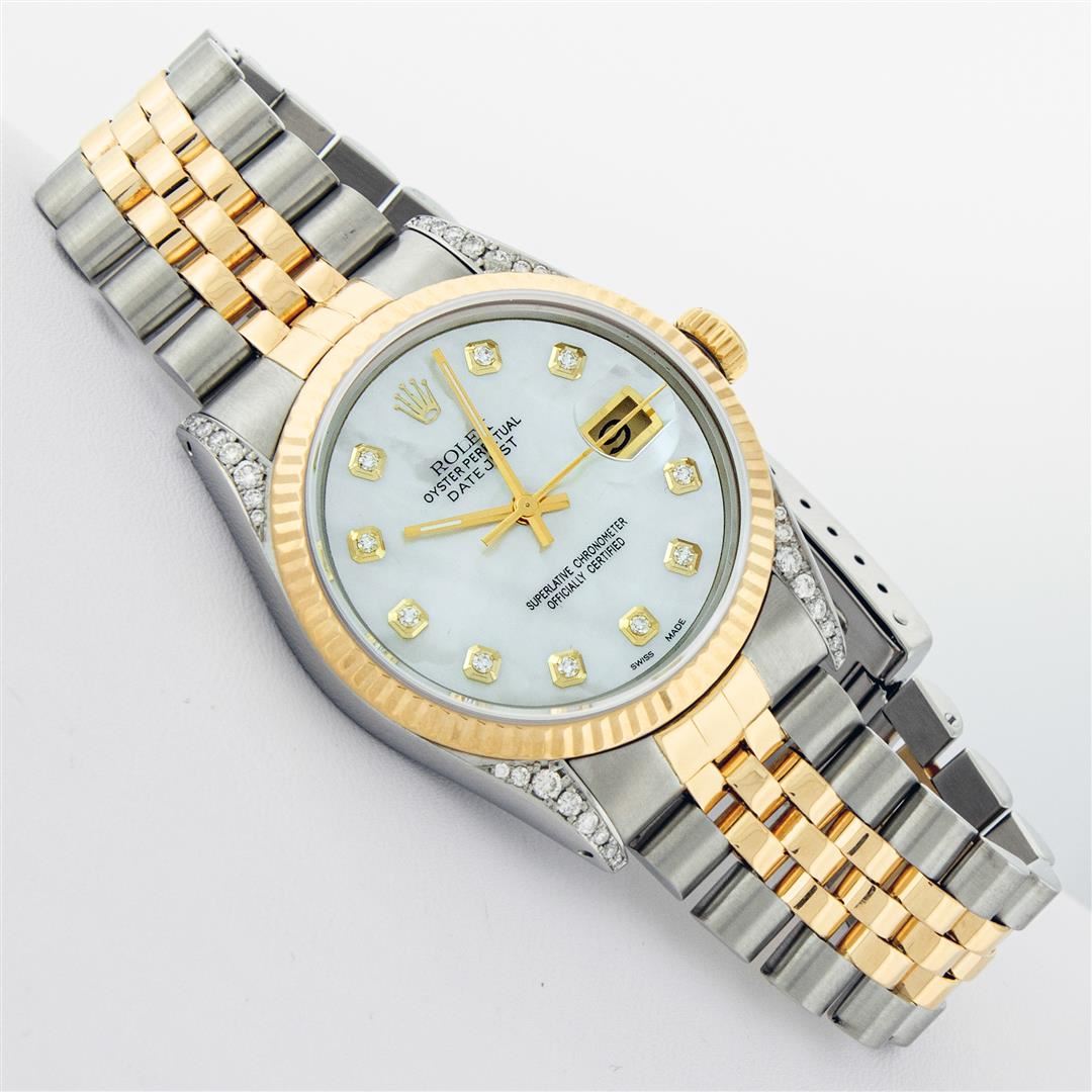 One Men's Pre Owned Yellow Gold Rolex Datejust Polished Bright with Satin Finish, Serviced & Electronically Tested, Stainless Steel Case: 36mm, Custom Diamond Lugs: 28 Diamonds On Lugs, Color: G to H, Clarity: SI-VS. Yellow Gold Crown, Rolex Bezel: Yellow Gold Fluted Bezel. Custom Crystal: New Scratch Resistant Acrylic Cyclops Lens. Custom Hands: New Luminescent Hands. Movement: Automatic Winding Movement. Custom Dial: Refinished To Mother Of Pearl With Added Diamonds, Stone Count: 10 Diamonds On Dial, Color: G to H, Clarity: VS2. Date Window: 3 O'Clock Position Date Display, Quickset, Model: Datejust. Condition: G-6 Extra Fine. Rolex Bracelet: Yellow Gold And Stainless Steel Jubilee Band. Bright Polish & Satin Finish. 7.0 Inch Length, Adjustable. Standard Clasp, With Rolex Logo. This Watch Has Been Serviced And Polished It Is Free Of All Scratches And Dents.