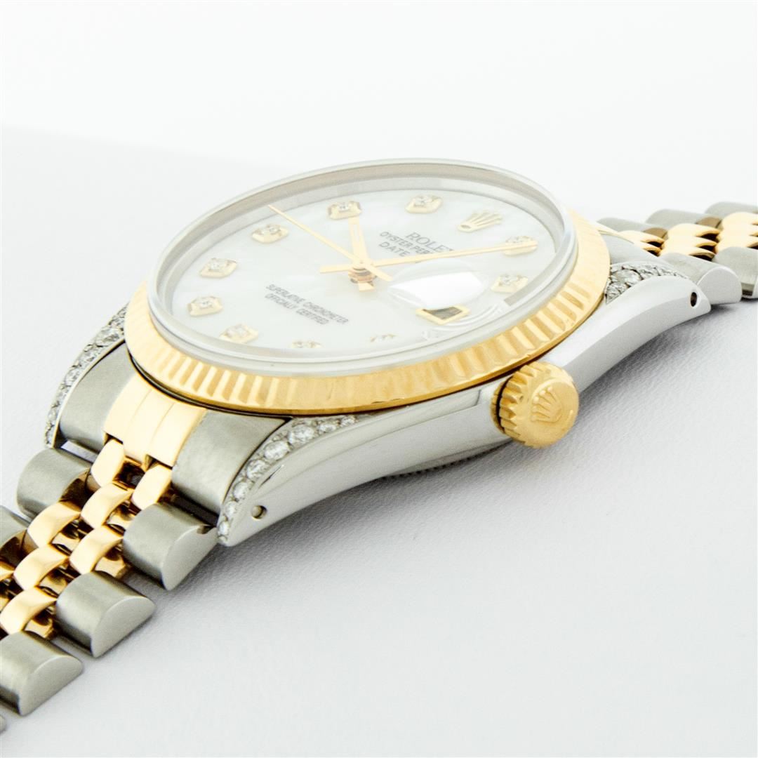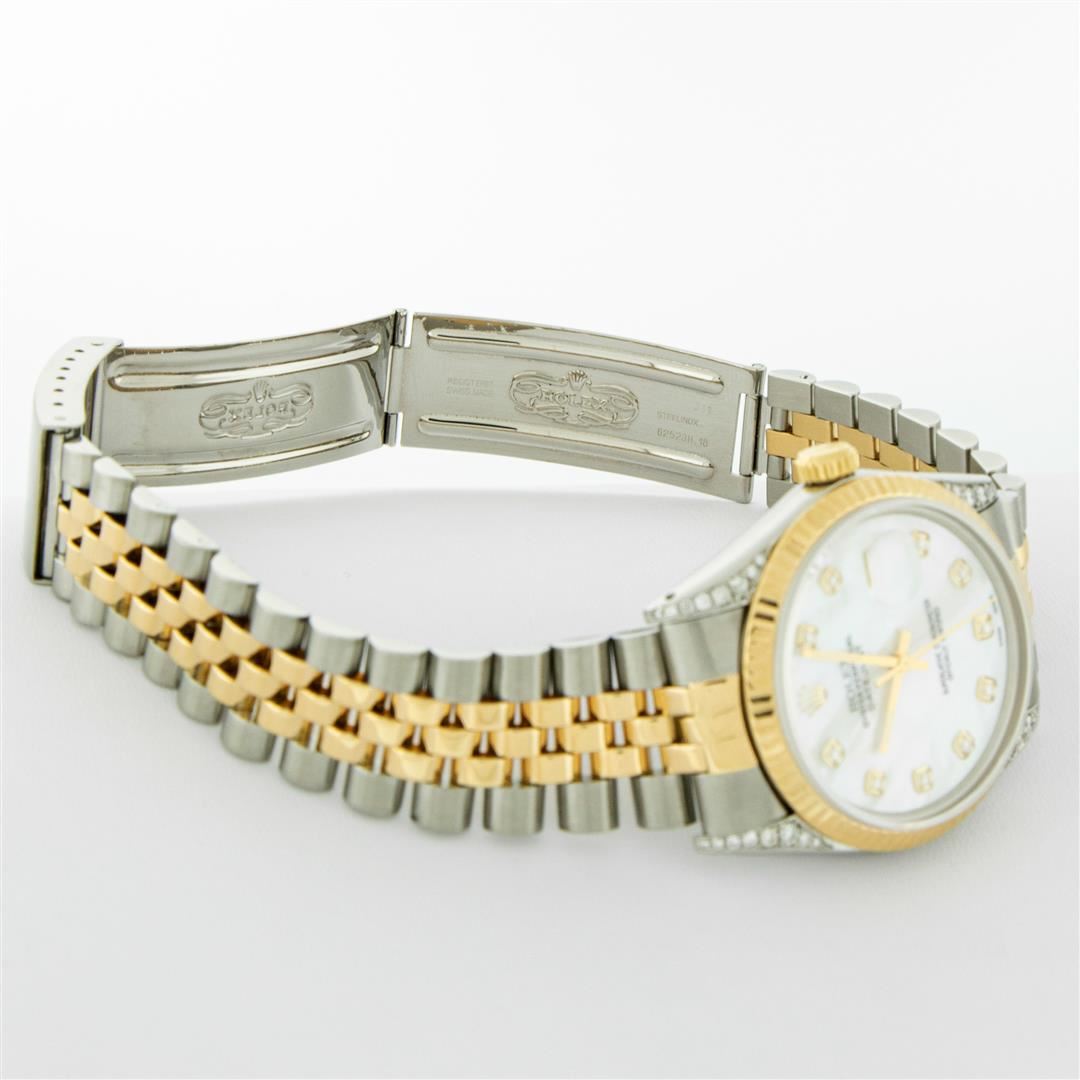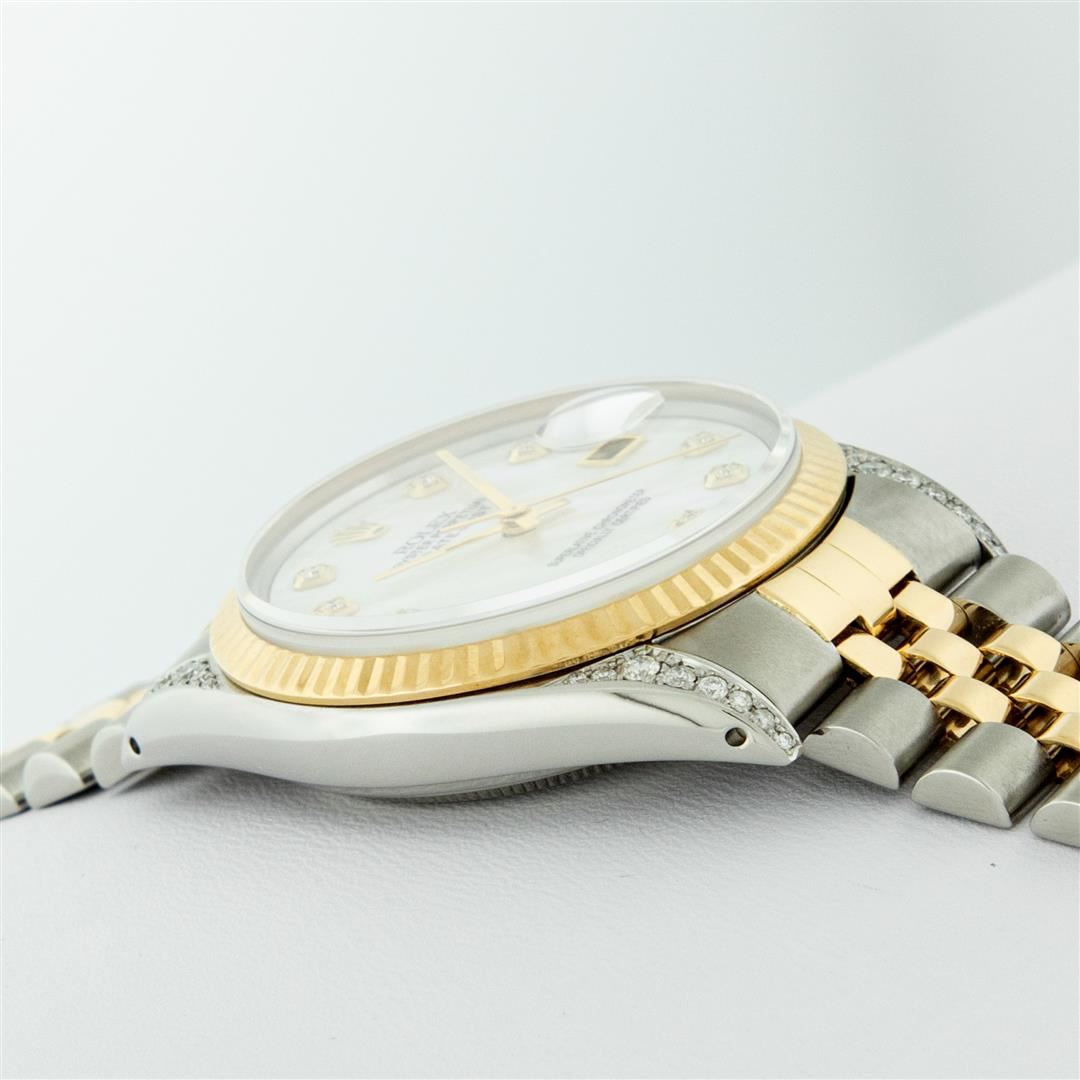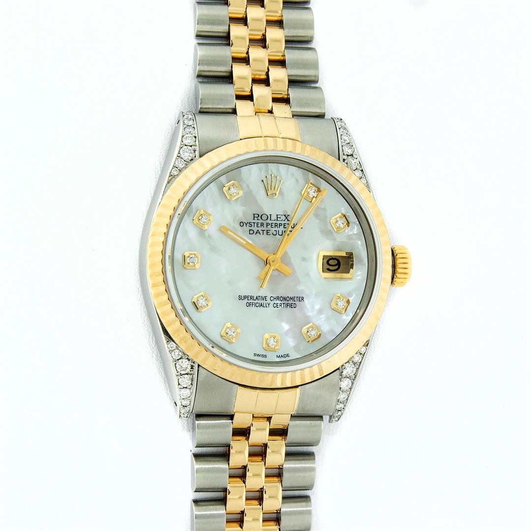 One Men's Pre Owned Yellow Gold Rolex Datejust Polished Bright with Satin Finish, Serviced & Electronically Tested, Stainless Steel Case: 36mm, Custom Diamond Lugs: 28 Diamonds On Lugs, Color: G to H, Clarity: SI-VS. Yellow Gold Crown, Rolex Bezel: Yellow Gold Fluted Bezel. Custom Crystal: New Scratch Resistant Acrylic Cyclops Lens. Custom Hands: New Luminescent Hands. Movement: Automatic Winding Movement. Custom Dial: Refinished To Mother Of Pearl With Added Diamonds, Stone Count: 10 Diamonds On Dial, Color: G to H, Clarity: VS2. Date Window: 3 O'Clock Position Date Display, Quickset, Model: Datejust. Condition: G-6 Extra Fine. Rolex Bracelet: Yellow Gold And Stainless Steel Jubilee Band. Bright Polish & Satin Finish. 7.0 Inch Length, Adjustable. Standard Clasp, With Rolex Logo. This Watch Has Been Serviced And Polished It Is Free Of All Scratches And Dents.