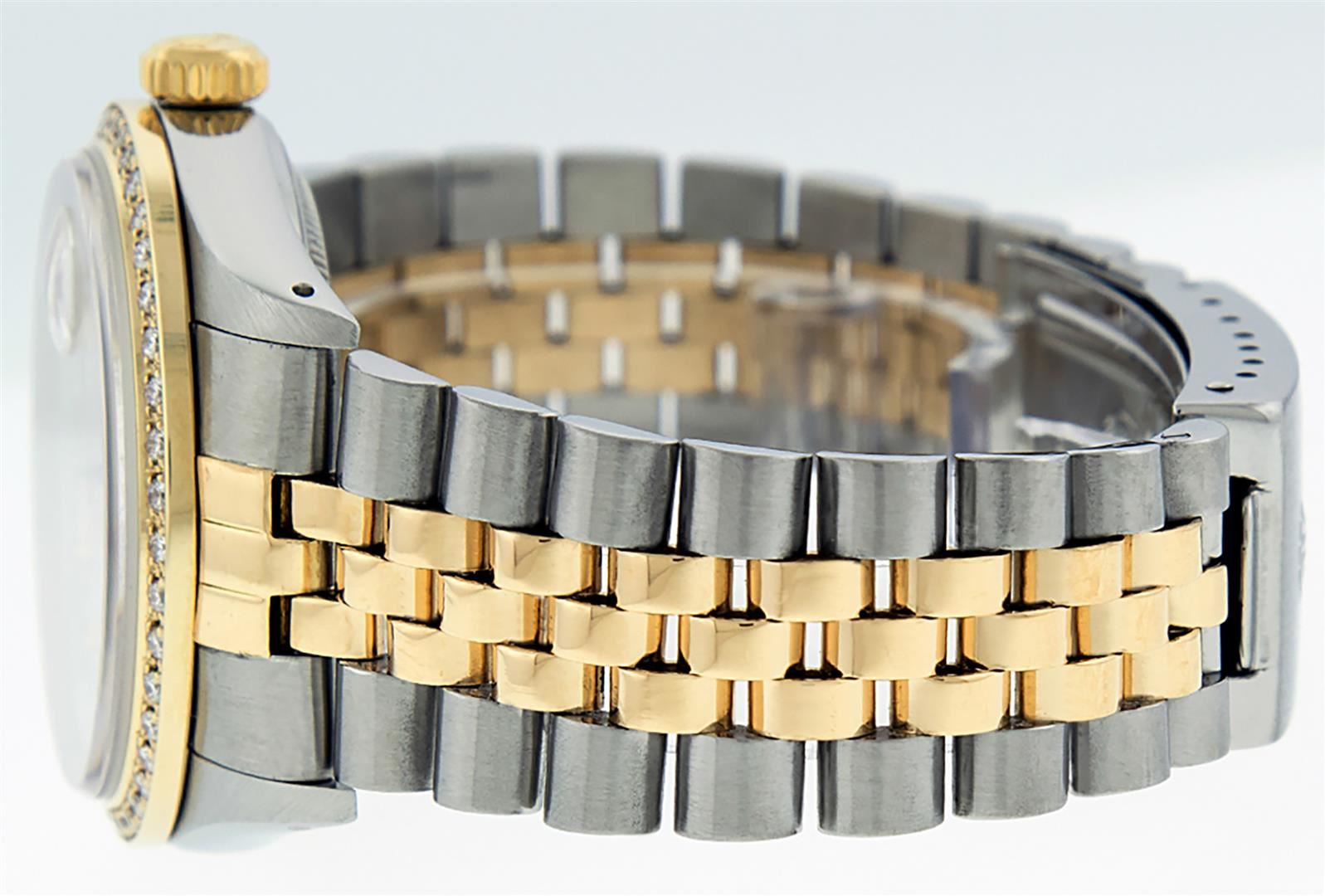 One Men's Yellow Gold Two Tone Rolex Datejust Polished, Serviced & Electronically Tested, Yellow Gold & Stainless Steel Case: 36mm, Yellow Gold Crown, Custom Bezel: New 18K Yellow Gold Beadset Diamond Bezel, Diamond Count: 44 Diamonds, Total Weight 1.00 Carat, Clarity: SI-VS, Color: G to H. Custom Crystal: New Synthetic Sapphire Cyclops Lens. Movement: Automatic Winding Movement. Custom Dial: Mother Of Pearl Diamond Dial with 2 Baguette Hour Markers, Diamond Count: 8 Diamonds + 2 Baguette Diamond Hour Markers, Color: G To H In Color, Clarity: SI-VS, Date Window: 3 O'clock Position Date Display, Quickset, Model: Datejust. Condition: G-6 Extra Fine. Bracelet: Two Tone Yellow Gold & Stainless Steel Jubilee. Bright Polish. 7.0 Inch Length, Adjustable. Standard Clasp, With Rolex Logo. This Watch Has Been Serviced Time Tested And Is In Excellent Condition It Is Free Of All Scratches And Dents.