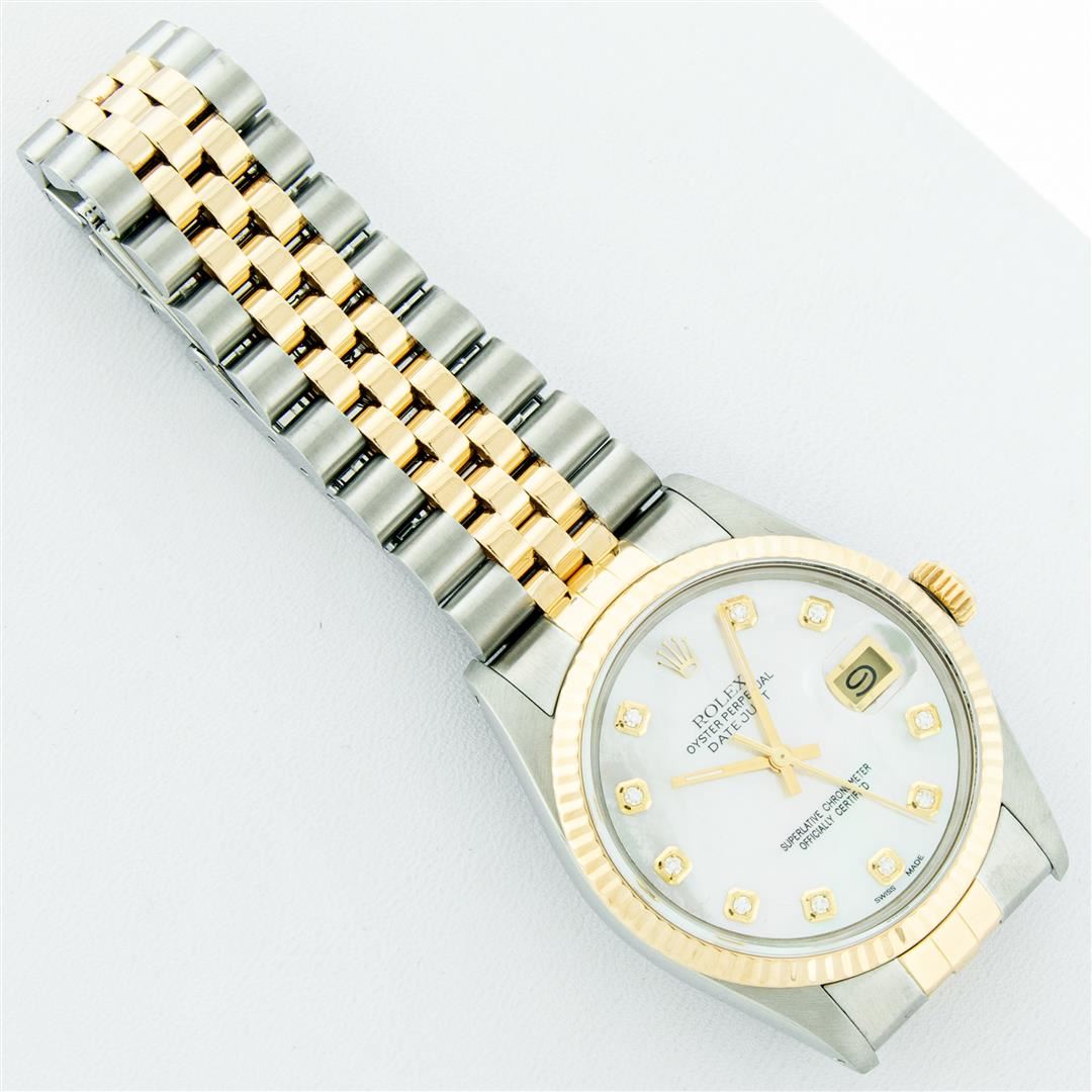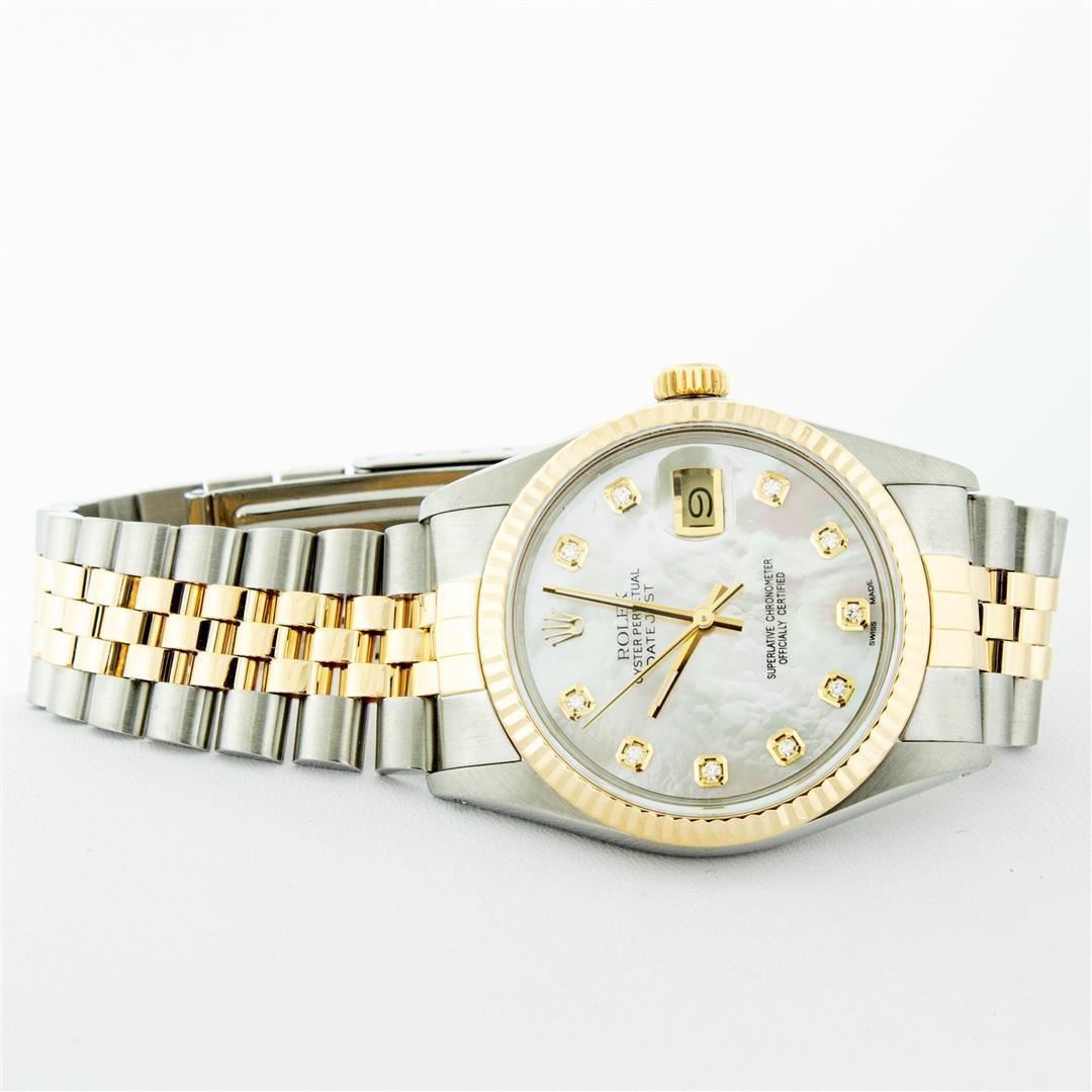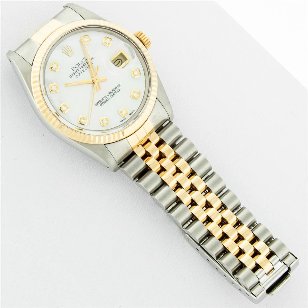 One Men's Pre Owned Yellow Gold Two Tone Rolex Datejust Polished, Serviced & Electronically Tested, Rolex Yellow Gold & Stainless Steel Case: 36mm, Rolex Yellow Gold Crown, Rolex Bezel: 18K Yellow Gold Fluted Bezel. Custom Crystal: New Acrylic Cyclops Lens. Custom Hands: New Hands. Rolex Movement: Automatic Winding Movement. Custom Dial: Dial Refinished To Mother Of Pearl Dial With Custom Added Diamond Hour Markers, Diamond Count: 10 Diamonds in Dial G To H In Color, VS Clarity. Date Window: 3 O'Clock Position Date Display, Quickset, Model: Condition: G-6 Extra Fine. Rolex Bracelet: Two Tone Yellow Gold & Stainless Steel Jubilee Band. Bright Polish. 7.0 Inch Length, Adjustable. Standard Clasp, With Rolex Logo. Watch Has Been Serviced And Polished It Is Free Of All Scratches And Dents. This Watch Has Been Serviced Time Tested And Is In Excellent Condition It Is Free Of All Scratches And Dents.