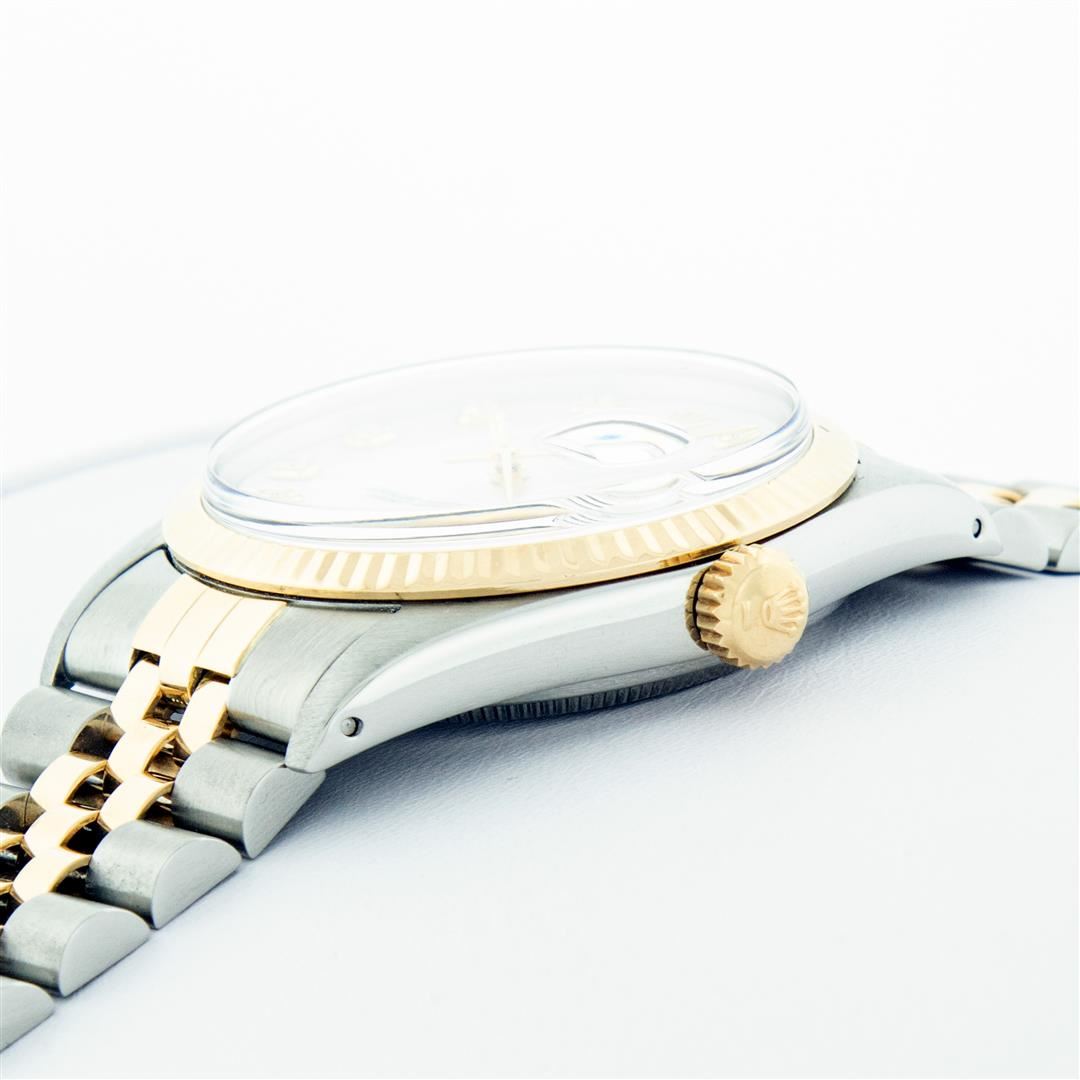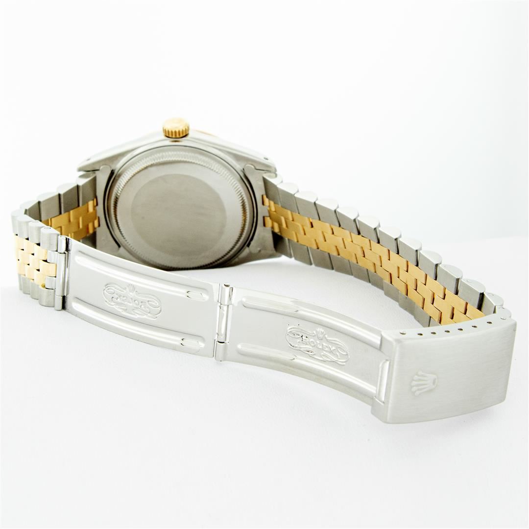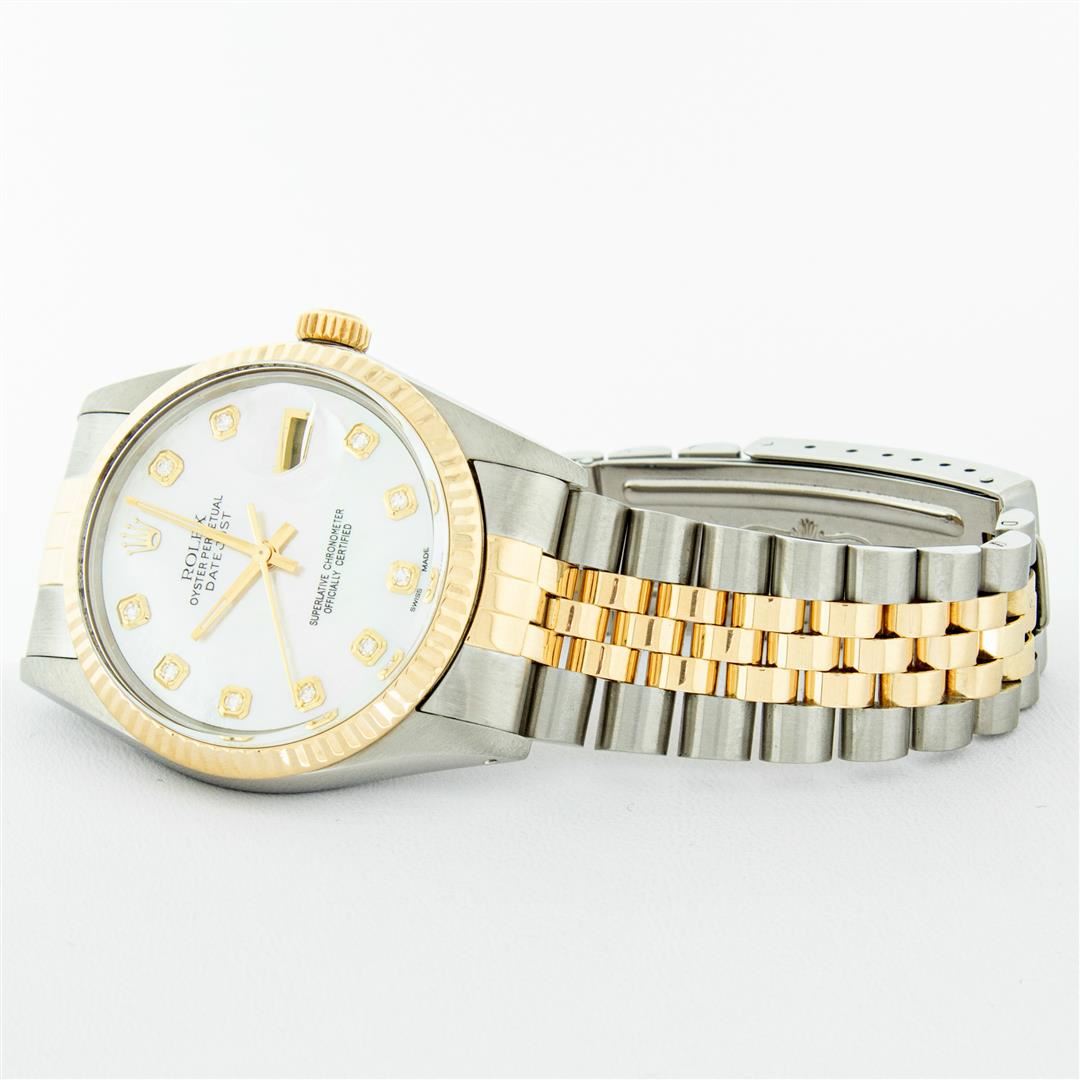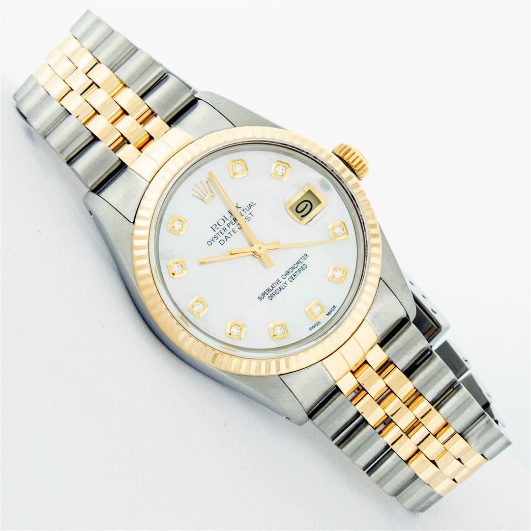 One Men's Pre Owned Yellow Gold Two Tone Rolex Datejust Polished, Serviced & Electronically Tested, Rolex Yellow Gold & Stainless Steel Case: 36mm, Rolex Yellow Gold Crown, Rolex Bezel: 18K Yellow Gold Fluted Bezel. Custom Crystal: New Acrylic Cyclops Lens. Custom Hands: New Hands. Rolex Movement: Automatic Winding Movement. Custom Dial: Dial Refinished To Mother Of Pearl Dial With Custom Added Diamond Hour Markers, Diamond Count: 10 Diamonds in Dial G To H In Color, VS Clarity. Date Window: 3 O'Clock Position Date Display, Quickset, Model: Condition: G-6 Extra Fine. Rolex Bracelet: Two Tone Yellow Gold & Stainless Steel Jubilee Band. Bright Polish. 7.0 Inch Length, Adjustable. Standard Clasp, With Rolex Logo. Watch Has Been Serviced And Polished It Is Free Of All Scratches And Dents. This Watch Has Been Serviced Time Tested And Is In Excellent Condition It Is Free Of All Scratches And Dents.
