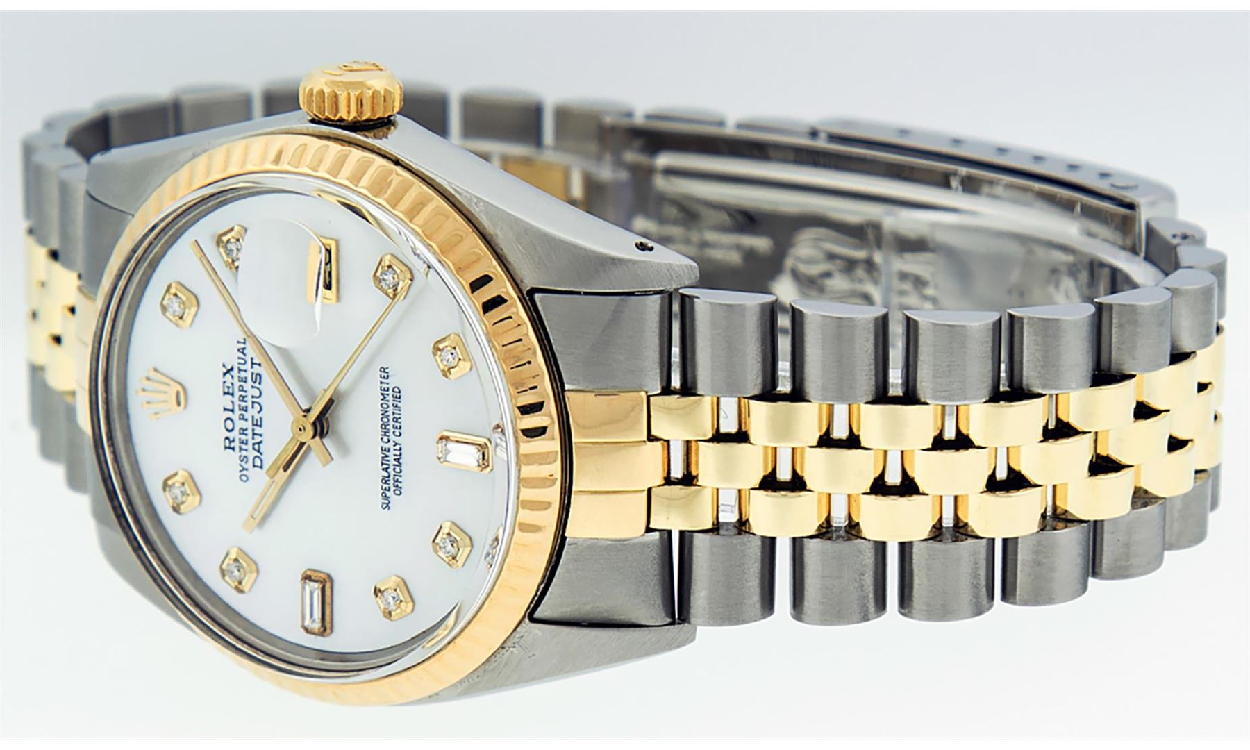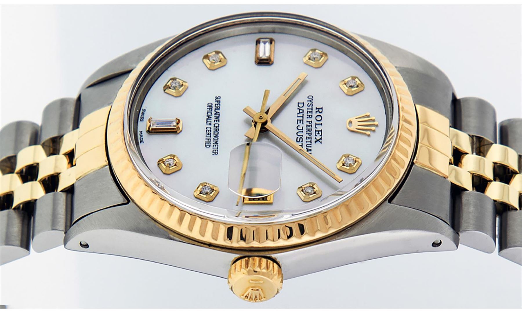 One Men's Pre Owned Yellow Gold Two Tone Rolex Datejust Polished, Serviced & Electronically Tested, Rolex Yellow Gold & Stainless Steel Case: 36mm, Rolex Yellow Gold Crown, Rolex Bezel: Yellow Gold Fluted Bezel. Custom Crystal: New Acrylic Cyclops Lens. Custom Hands: New Luminescent Hands. Rolex Movement: Automatic Winding Movement. Custom Dial: Refinished To Mother Of Pearl Diamond Dial, Stone Count: 8 Diamonds + 2 Diamond Baguettes in Dial, G To H In Color, SI-VS Clarity. Date Window: 3 O'Clock Position Date Display, Quickset, Model: Datejust. Condition: G-6 Extra Fine. Rolex Bracelet: Two Tone Yellow Gold & Stainless Steel Jubilee Band. Bright Polish. 7.0 Inch Length, Adjustable. Standard Clasp, With Rolex Logo. This Watch Has Been Serviced And Polished It Is Free Of All Scratches And Dents.