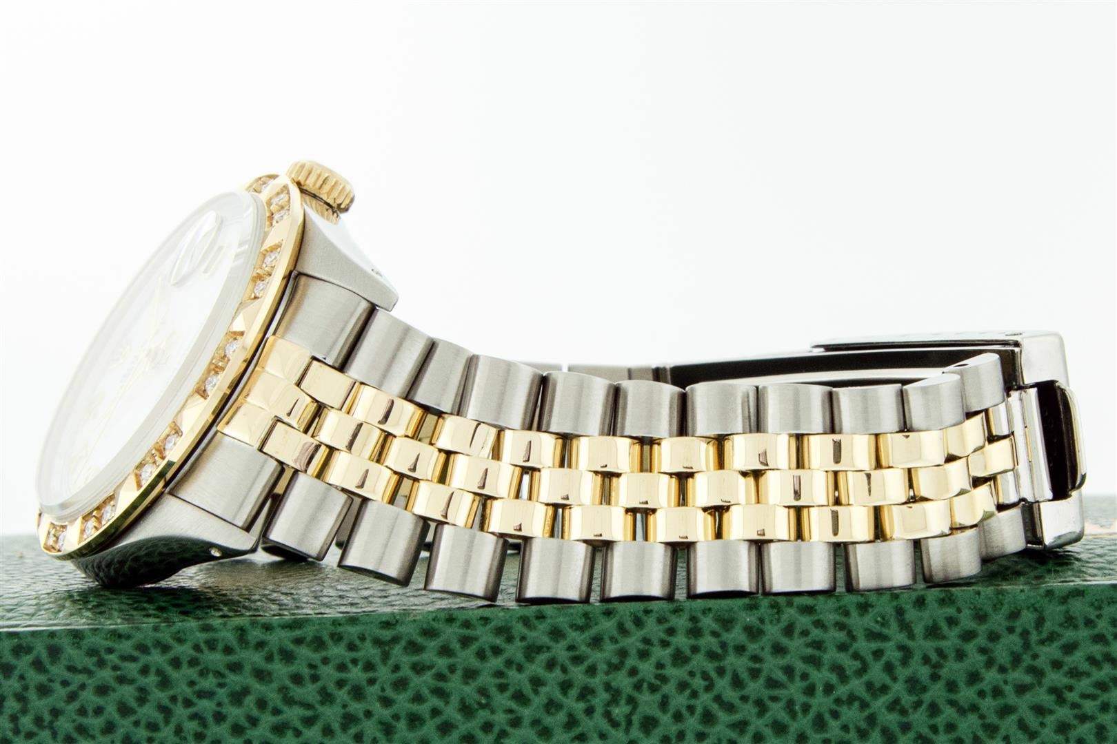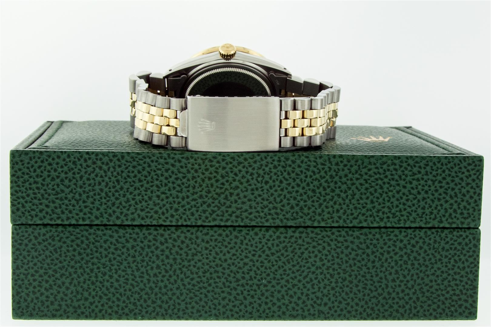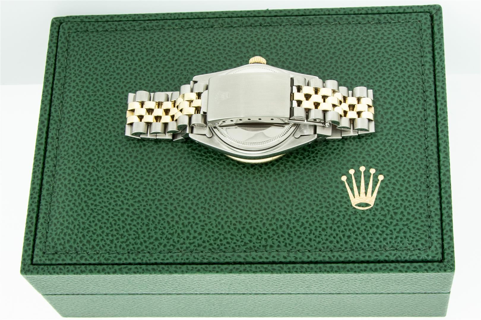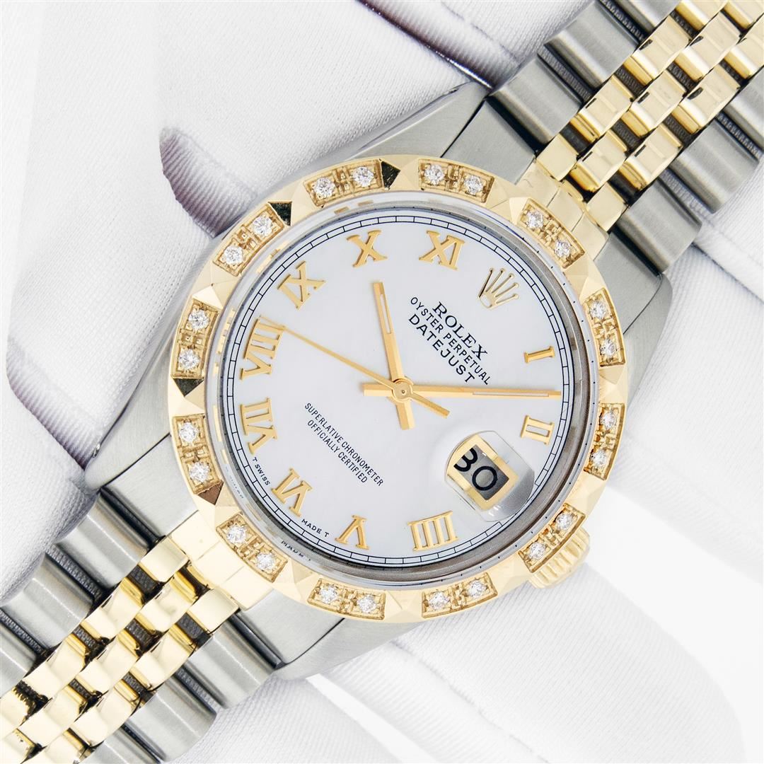 One Men's Yellow Gold Rolex Datejust Polished Bright with Satin Finish, Serviced & Electronically Tested, Stainless Steel Case: 36mm, Rolex Yellow Gold Crown, Custom Bezel: New 18K Yellow Gold Pyramid Diamond Bezel, Diamond Count: 24 Diamonds, Total Weight .75 Carat, Clarity: SI-VS, Color: G to H. Custom Crystal: New Sapphire With Magnified Date Window. Custom Hands: New Luminescent Hands. Rolex Movement: Automatic Winding Movement. Custom Dial: Mother Of Pearl With Square Track. Date Window: 3 O'clock Position Date Display, Quickset, Model: Datejust. Condition: G-6 Extra Fine. Rolex Bracelet: Yellow Gold And Stainless Steel Jubilee Band. Bright Polish & Satin Finish. 7.0 Inch Length, Adjustable. Standard Clasp, With Rolex Logo. This Pre Owned Watch Has Been Serviced And Polished It Is Free Of All Scratches And Dents. This Watch Comes With A Rolex Box.