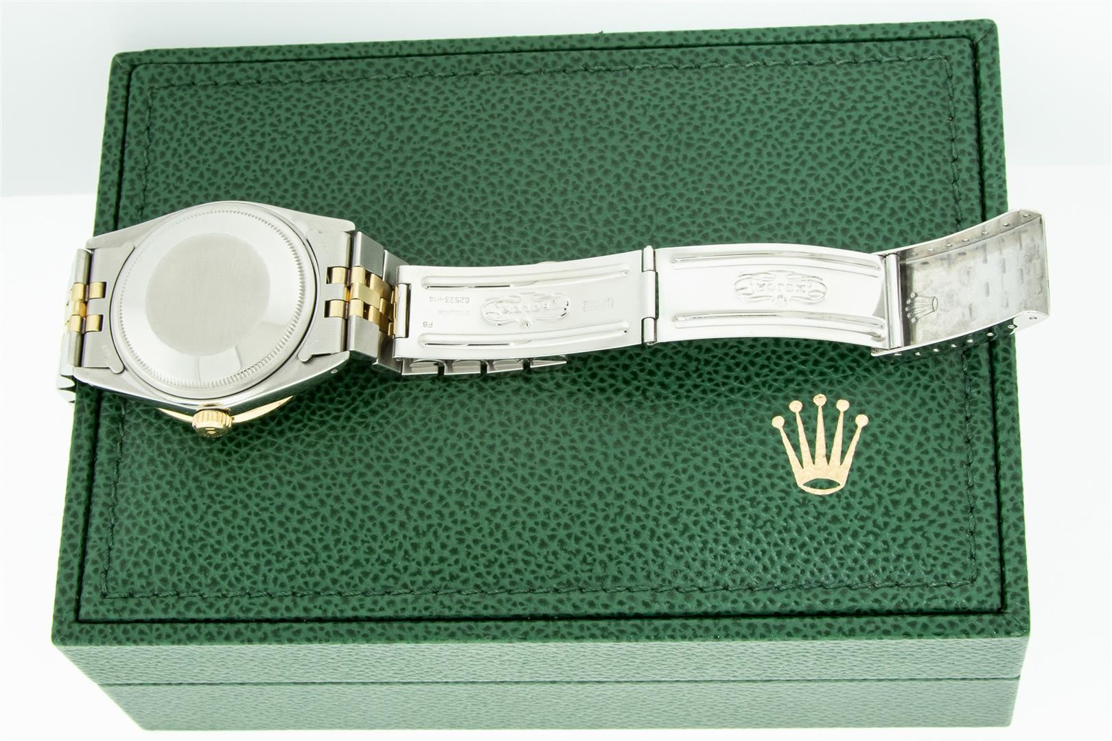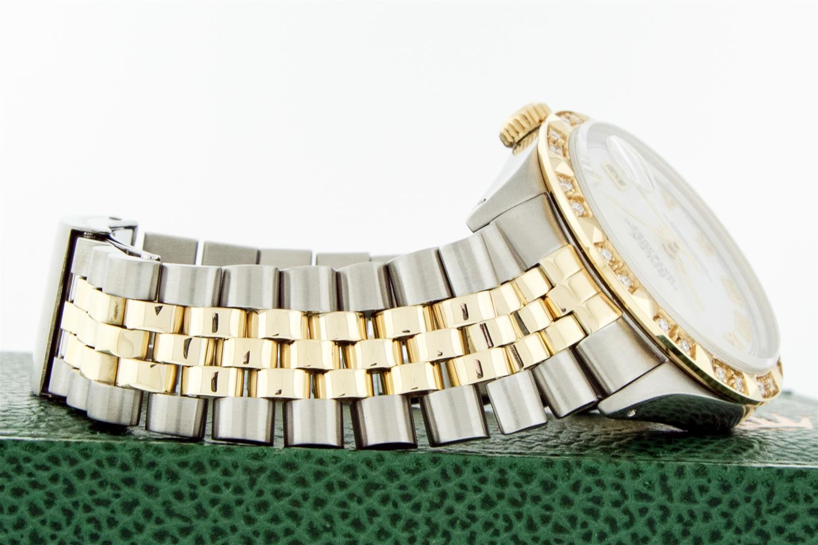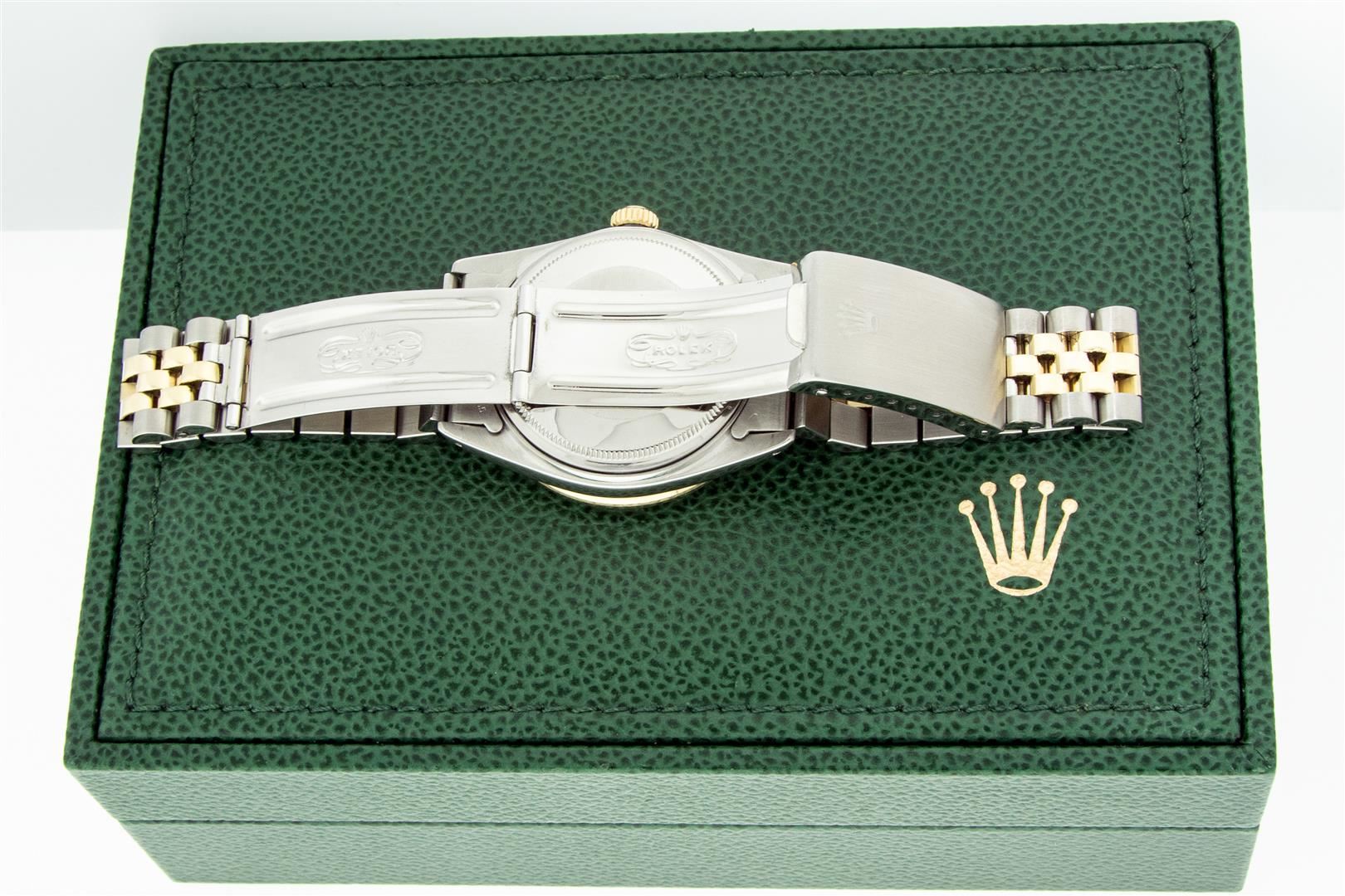 One Men's Yellow Gold Rolex Datejust Polished Bright with Satin Finish, Serviced & Electronically Tested, Stainless Steel Case: 36mm, Rolex Yellow Gold Crown, Custom Bezel: New 18K Yellow Gold Pyramid Diamond Bezel, Diamond Count: 24 Diamonds, Total Weight .75 Carat, Clarity: SI-VS, Color: G to H. Custom Crystal: New Sapphire With Magnified Date Window. Custom Hands: New Luminescent Hands. Rolex Movement: Automatic Winding Movement. Custom Dial: Mother Of Pearl With Square Track. Date Window: 3 O'clock Position Date Display, Quickset, Model: Datejust. Condition: G-6 Extra Fine. Rolex Bracelet: Yellow Gold And Stainless Steel Jubilee Band. Bright Polish & Satin Finish. 7.0 Inch Length, Adjustable. Standard Clasp, With Rolex Logo. This Pre Owned Watch Has Been Serviced And Polished It Is Free Of All Scratches And Dents. This Watch Comes With A Rolex Box.