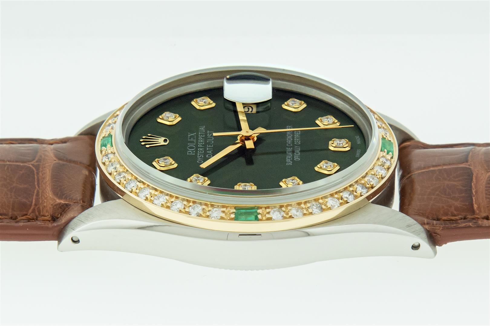 One Men's Yellow Gold Two Tone Rolex Datejust Polished, Serviced & Electronically Tested, Yellow Gold & Stainless Steel Case: 36mm, Rolex Yellow Gold Crown, Custom Bezel: New 18K Yellow Gold Emerald Beadset Diamond Bezel, Diamond Count: 36 Diamonds + 4 Emeralds In Bezel, Total Bezel Weight 1.00 Carat, Clarity: SI-VS, Color: G to H. Custom Crystal: New Sapphire With Magnified Date Window. Custom Hands: New Luminescent Hands. Rolex Movement: Automatic Winding Movement. Custom Dial: Refinished To Green With Added Diamond Hour Markers. Date Window: 3 O'clock Position Date Display, Quickset, Model: Datejust. Condition: G-6 Extra Fine. Custom Band: New Brown Leather Band 7.0 Inch Length. New Custom Pin Buckle Clasp. This Pre Owned Watch Has Been Serviced Time Tested And Is In Excellent Condition It Is Free Of All Scratches And Dents.