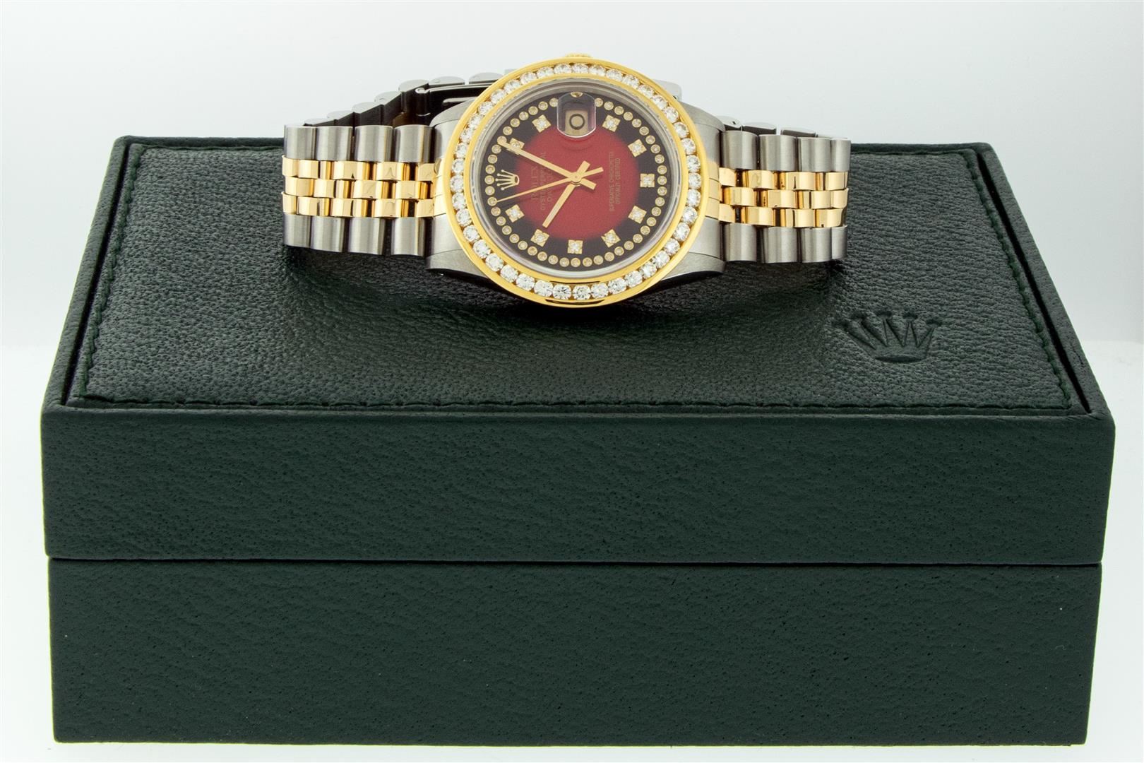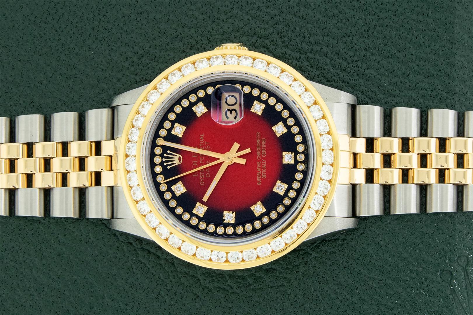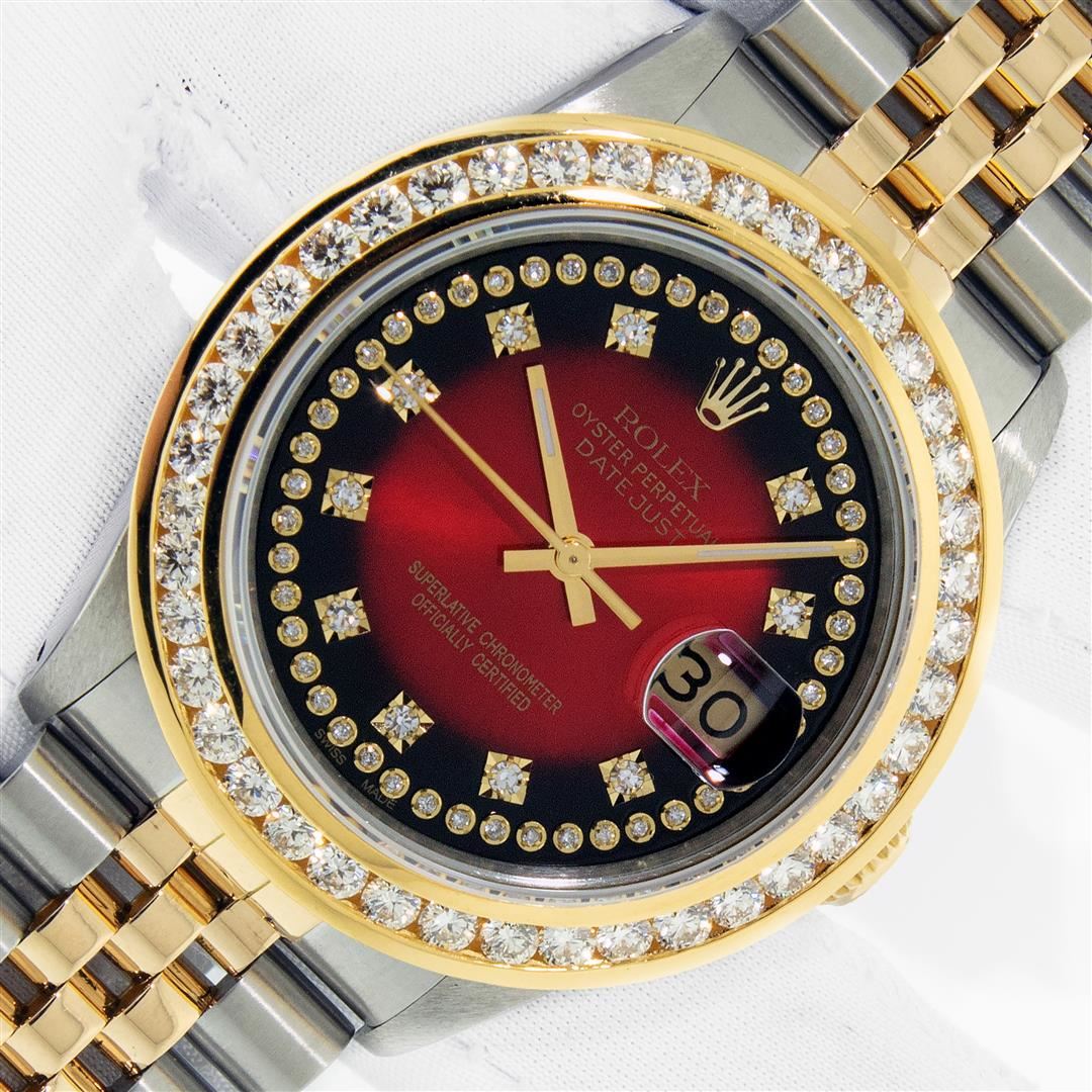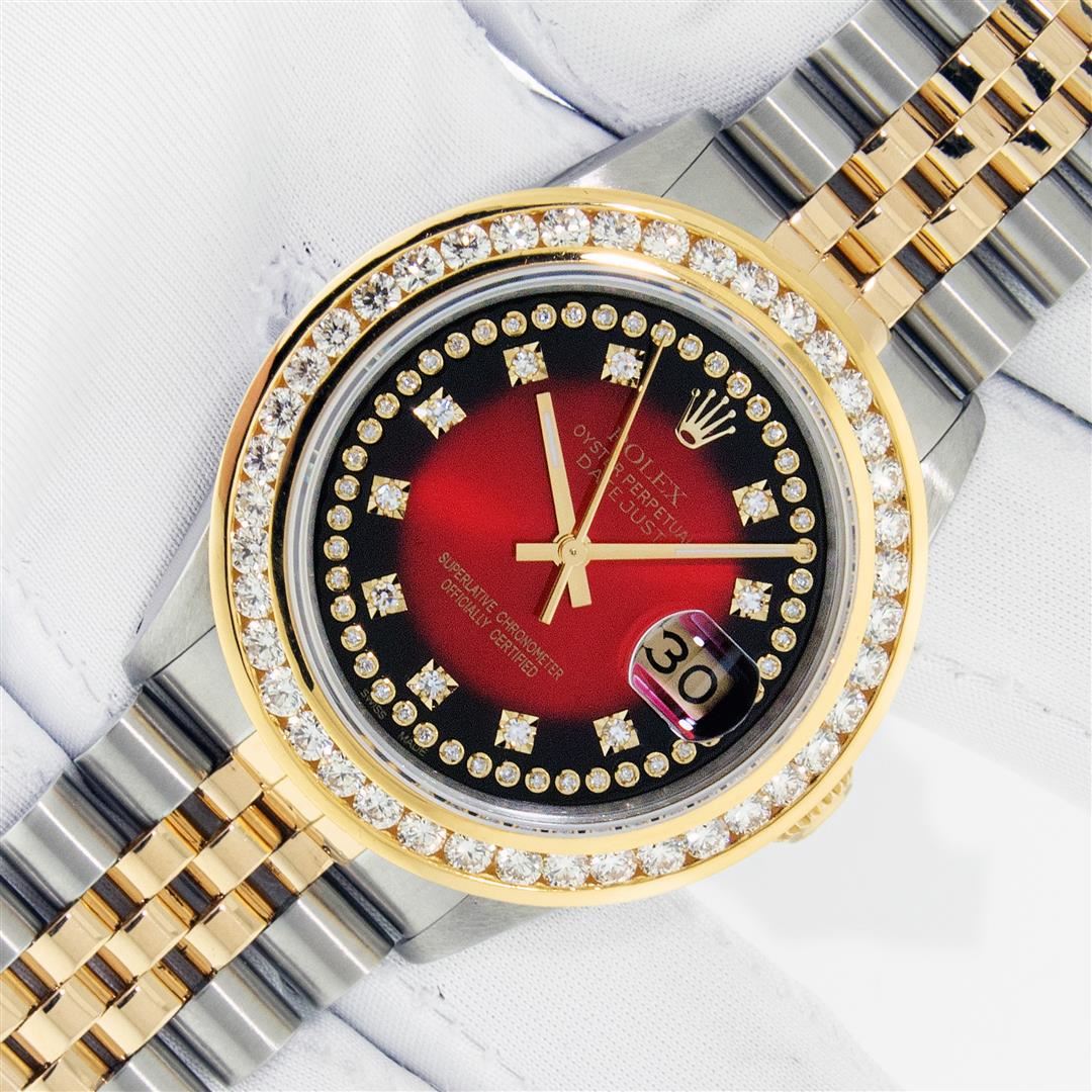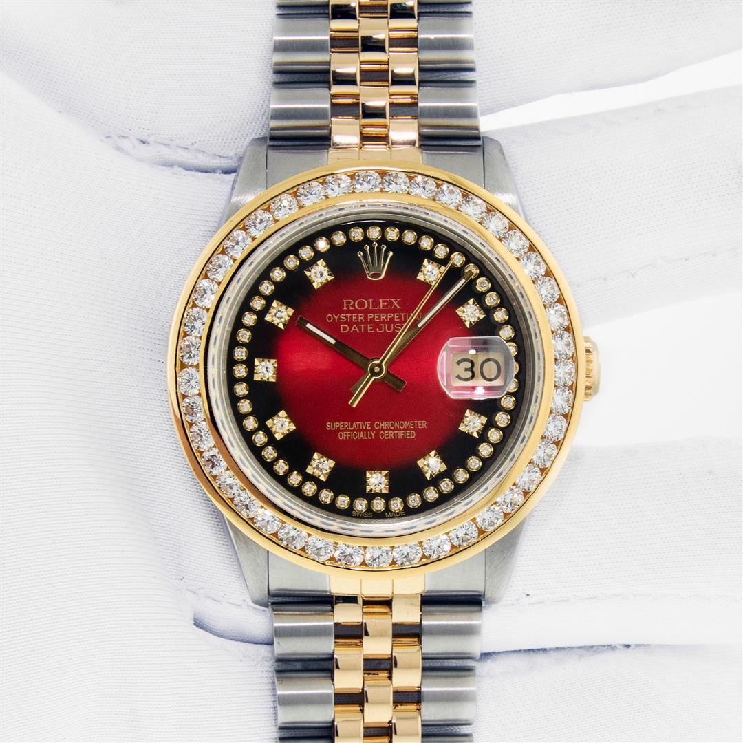 One Men's Yellow Gold Rolex Datejust Polished Bright with Satin Finish, Serviced & Electronically Tested, Stainless Steel Case: 36mm, Rolex Yellow Gold Crown, Custom Bezel: New 18K Yellow Gold 3ct Channel Set Diamond Bezel, Diamond Count: 40 Diamonds, Total Weight 3.00 Carat, Clarity: SI-VS, Color: G to H. Custom Crystal: New Sapphire With Magnified Date Window. Custom Hands: New Luminescent Hands. Rolex Movement: Automatic Winding Movement. Custom Dial: Refinished To Red Vignette With Added Diamond Hour Markers, Diamond Count: 58 Diamonds In Dial, Color: G to H, Clarity: VS. Date Window: 3 O'clock Position Date Display, Quickset, Model: Datejust. Condition: G-6 Extra Fine. Rolex Bracelet: Yellow Gold And Stainless Steel Jubilee Band. Bright Polish & Satin Finish. 7.0 Inch Length, Adjustable. Standard Clasp, With Rolex Logo. This Pre Owned Watch Has Been Serviced And Polished It Is Free Of All Scratches And Dents. This Watch Comes With A Rolex Box.