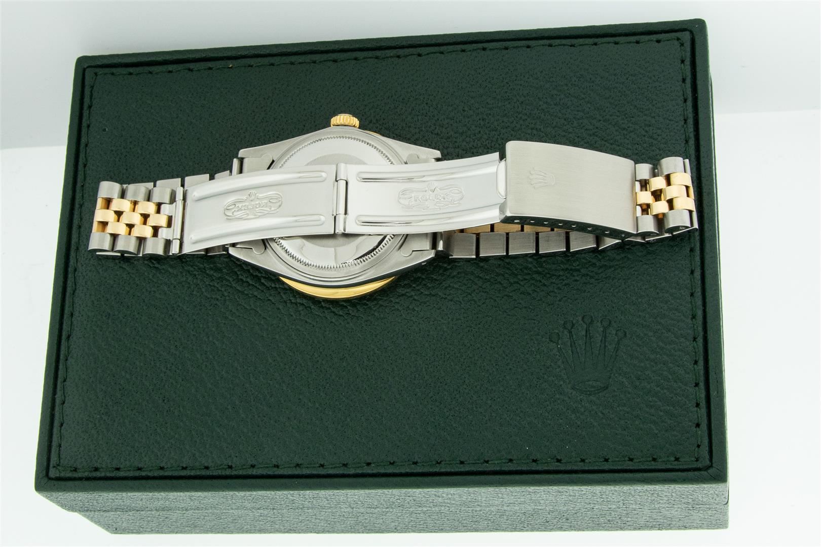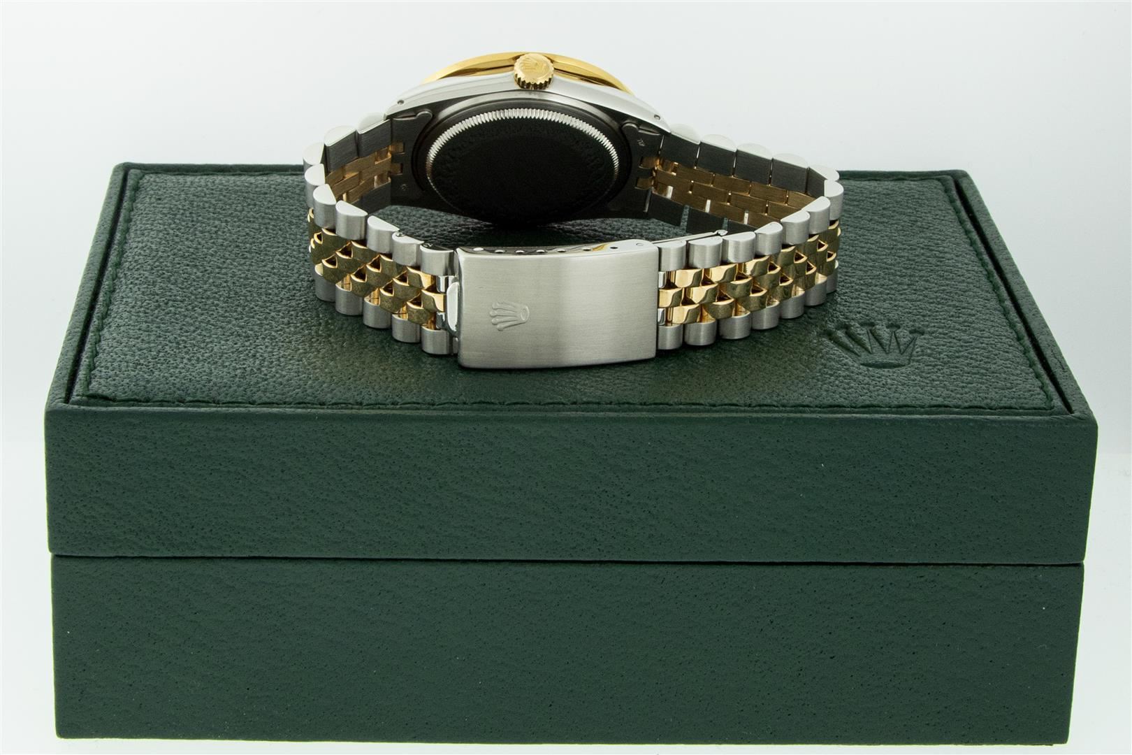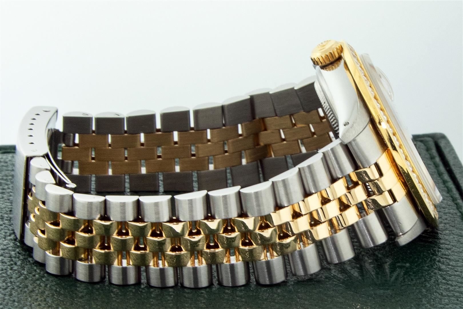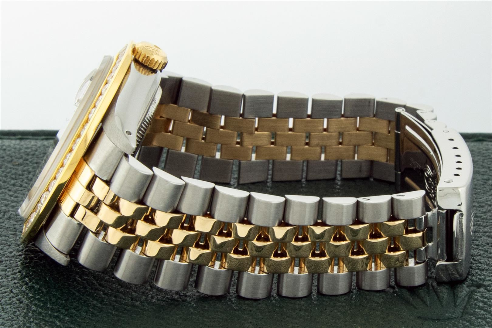 One Men's Yellow Gold Rolex Datejust Polished Bright with Satin Finish, Serviced & Electronically Tested, Stainless Steel Case: 36mm, Rolex Yellow Gold Crown, Custom Bezel: New 18K Yellow Gold 3ct Channel Set Diamond Bezel, Diamond Count: 40 Diamonds, Total Weight 3.00 Carat, Clarity: SI-VS, Color: G to H. Custom Crystal: New Sapphire With Magnified Date Window. Custom Hands: New Luminescent Hands. Rolex Movement: Automatic Winding Movement. Custom Dial: Refinished To Red Vignette With Added Diamond Hour Markers, Diamond Count: 58 Diamonds In Dial, Color: G to H, Clarity: VS. Date Window: 3 O'clock Position Date Display, Quickset, Model: Datejust. Condition: G-6 Extra Fine. Rolex Bracelet: Yellow Gold And Stainless Steel Jubilee Band. Bright Polish & Satin Finish. 7.0 Inch Length, Adjustable. Standard Clasp, With Rolex Logo. This Pre Owned Watch Has Been Serviced And Polished It Is Free Of All Scratches And Dents. This Watch Comes With A Rolex Box.