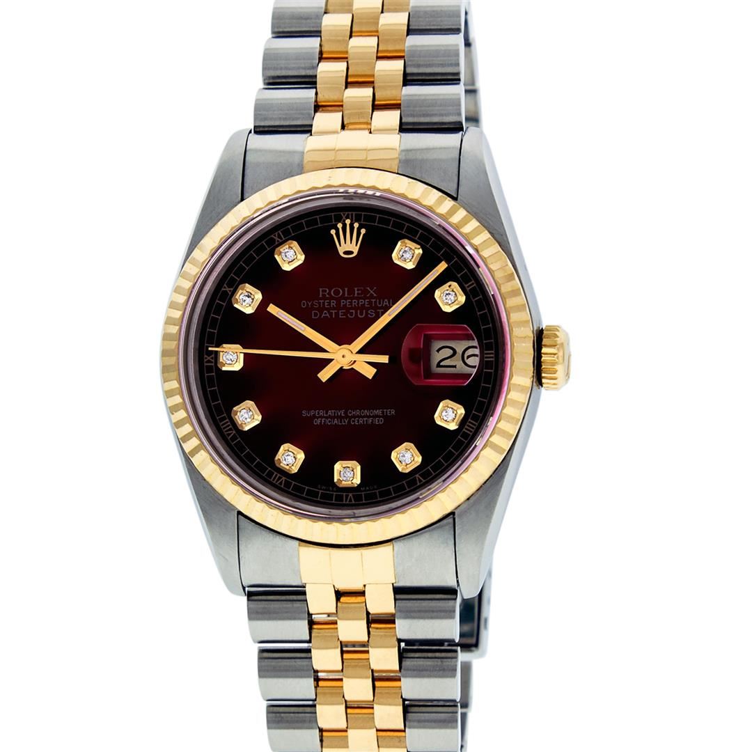 One Men's Yellow Gold Two Tone Rolex Datejust Polished, Serviced & Electronically Tested, Yellow Gold & Stainless Steel Case: 36mm, Yellow Gold Crown, Bezel: Yellow Gold Fluted Bezel. Custom Crystal: New Acrylic Cyclops Lens. Custom Hands: New Luminescent Hands. Movement: Automatic Winding Movement. Custom Dial: Red Vignette Set With Diamond Hour Markers And Square Roman Track, Diamond Count: 10 Diamonds in Dial, G To H In Color, SI-VS Clarity. Date Window: 3 O'clock Position Date Display, Quickset, Model: Datejust, Condition: G-6 Extra Fine. Bracelet: Two Tone Yellow Gold & Stainless Steel Jubilee Band. Bright Polish. 7.0 Inch Length, Adjustable. Standard Clasp, With Rolex Logo. This Watch Has Been Serviced And Polished It Is Free Of All Scratches And Dents.