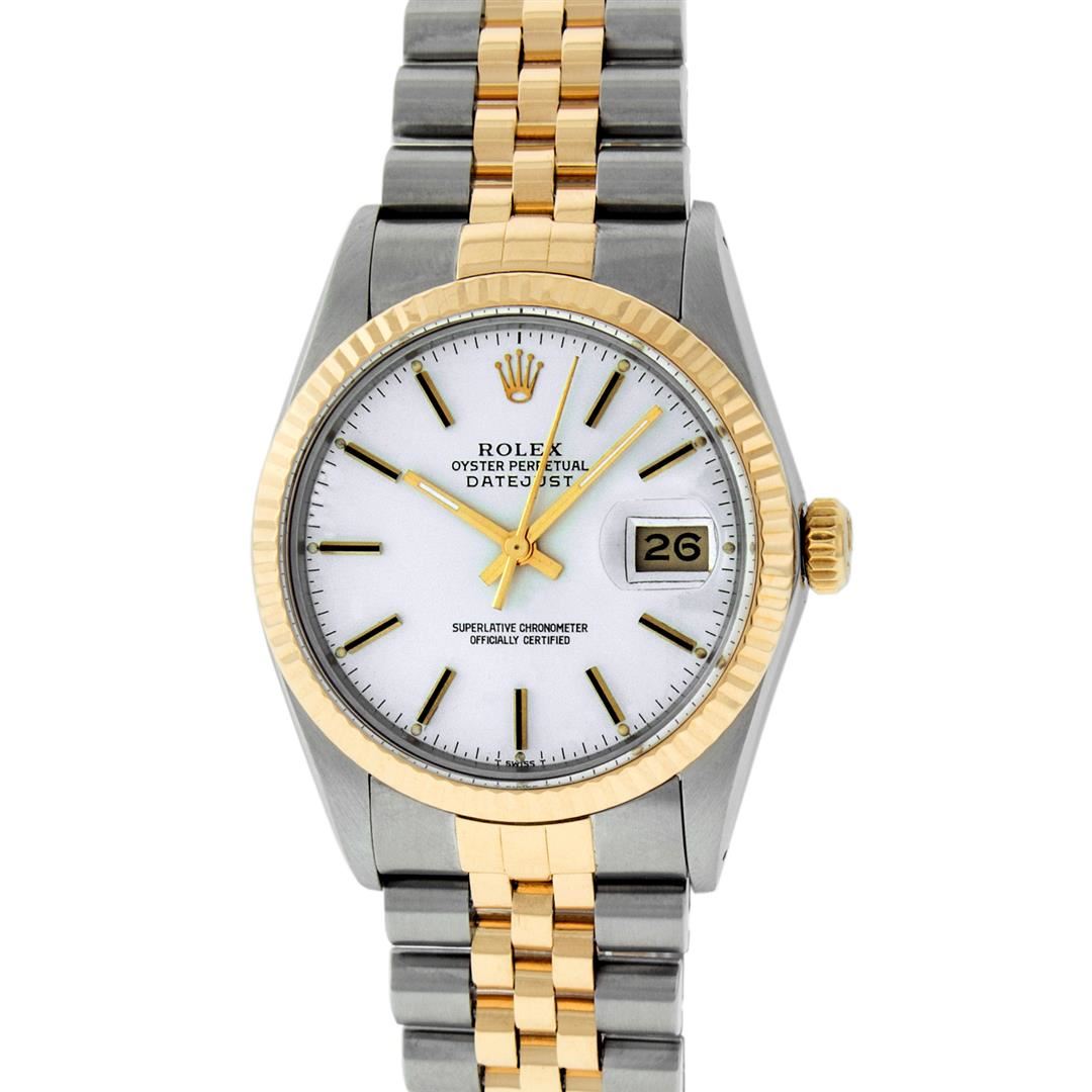 One Men's Pre Owned Yellow Gold Two Tone Rolex Datejust Polished, Serviced & Electronically Tested, Rolex Yellow Gold & Stainless Steel Case: 36mm, Rolex 14K Yellow Gold Crown, Rolex Bezel: Yellow Gold Fluted Bezel. Custom Crystal: New Acrylic Cyclops Lens. Custom Hands: New Luminescent Hands. Rolex Movement: Automatic Winding Movement. Rolex Dial: Silver Index With Index Hour Markers and Small Track With Lumi Dots. Date Window: 3 O'Clock Position Date Display, Quickset, Model: Datejust. Condition: G-6 Extra Fine. Rolex Bracelet: Two Tone Yellow Gold & Stainless Steel Jubilee Band. Bright Polish. 7.0 Inch Length, Adjustable. Standard Clasp, With Rolex Logo. This Watch Has Been Serviced Time Tested And Is In Excellent Condition It Is Free Of All Scratches And Dents.