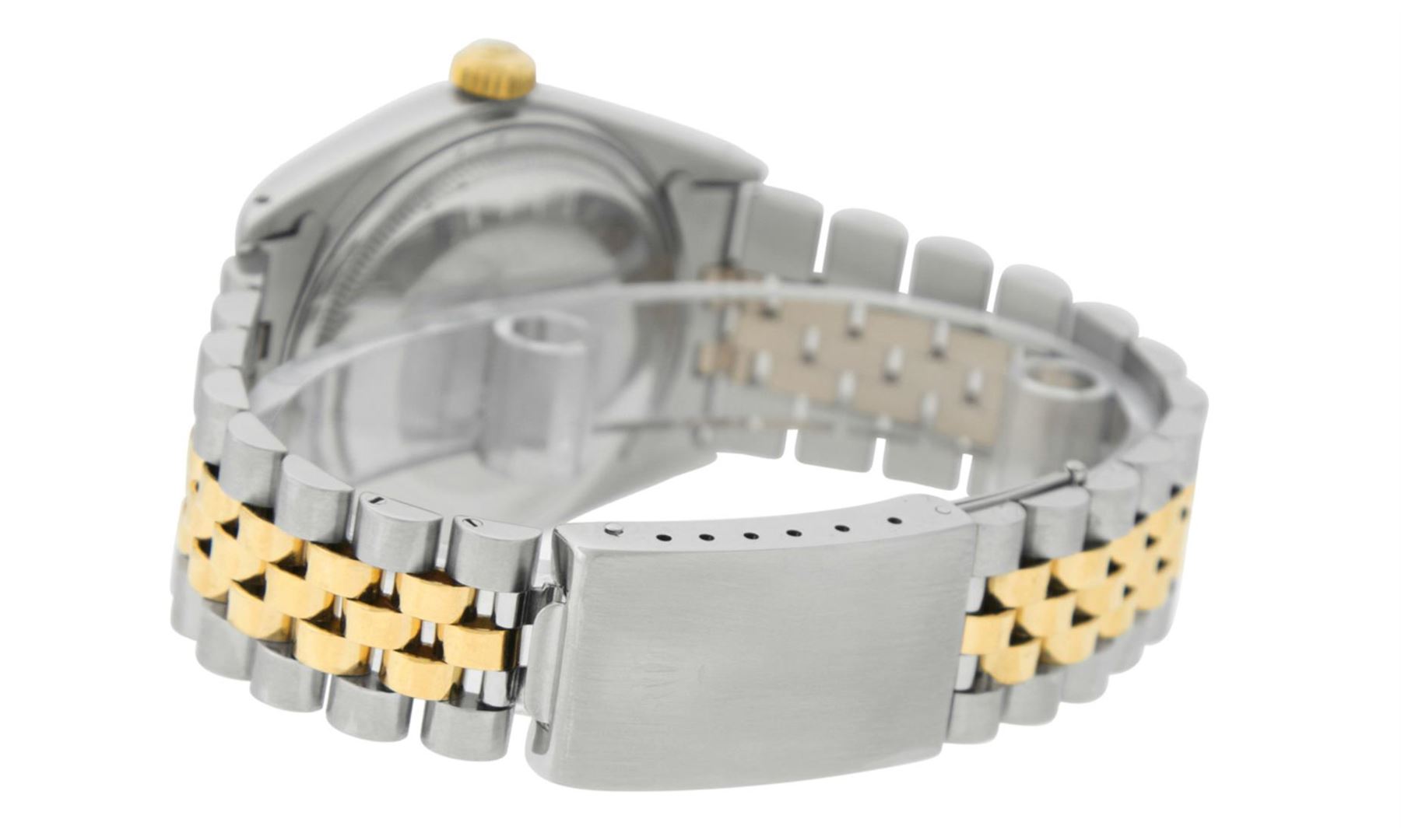 One Men's Rolex Two Tone Yellow Gold And Stainless Steel Datejust Polished, Serviced & Electronically Tested, 14K Yellow Gold & Stainless Steel Case: 36mm, 14K Yellow Gold Crown, Rolex Bezel: 14K Yellow Gold Fluted Bezel. Custom Crystal: New Acrylic With Magnified Date Window. Custom Hands: New Luminescent Hands. Rolex Movement: Automatic Winding Movement 3035. Custom Dial: Refinished To Silver With Index Hour Markers And Square Track. Date Window: 3 O'Clock Position Date Display, Quickset, Model: Datejust. Condition: G-6 Extra Fine. Rolex Bracelet: 14K Two Tone Yellow Gold & Stainless Steel Jubilee Band. Bright Polish. 7.0 Inch Length, Adjustable. Standard Clasp, With Rolex Logo. This Watch Has Been Serviced Time Tested And Is In Excellent Condition It Is Free Of All Scratches And Dents.