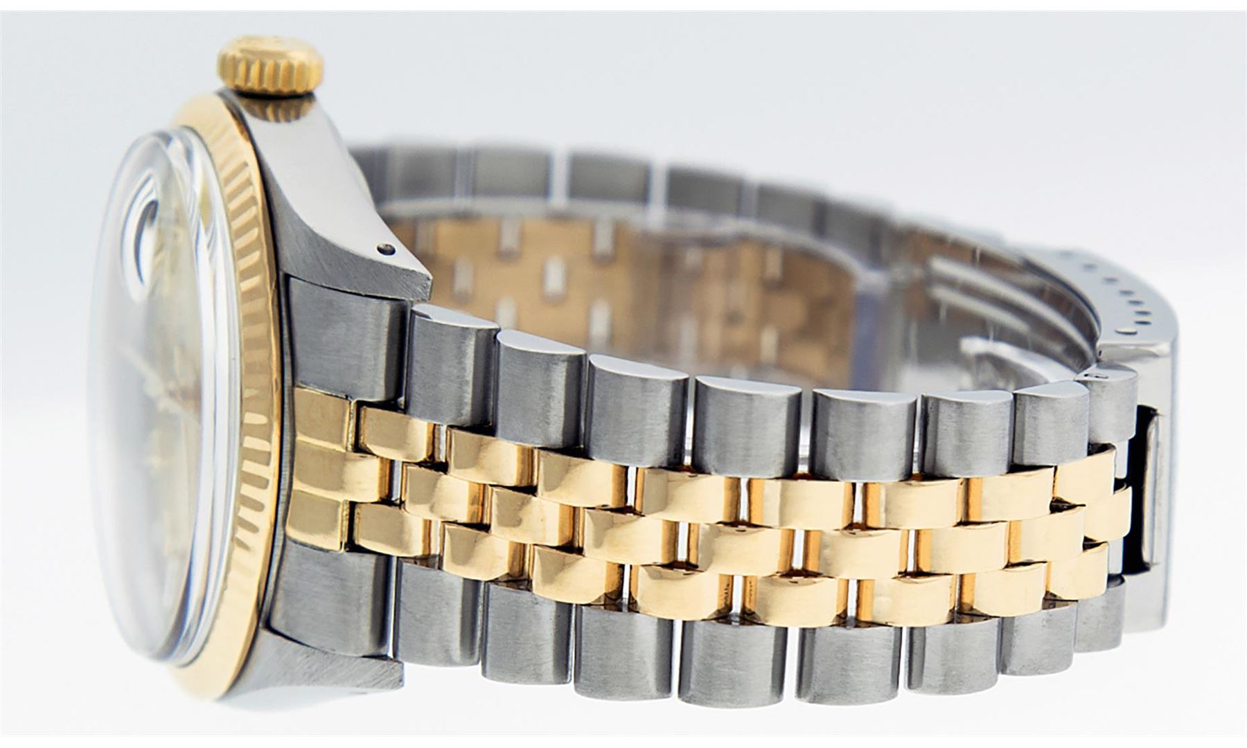 One Men's Yellow Gold Two Tone Rolex Datejust Polished, Serviced & Electronically Tested, Yellow Gold & Stainless Steel Case: 36mm, Yellow Gold Crown, Bezel: Yellow Gold Fluted Bezel. Custom Crystal: New Acrylic Cyclops Lens. Custom Hands: New Luminescent Hands. Movement: Automatic Winding Movement.. Custom Dial: Champagne Diamond Dial, Diamond Count: 8 Diamonds + 2 Baguette Diamonds in Dial, G To H In Color, SI-VS Clarity. Date Window: 3 O'clock Position Date Display, Quickset, Model: Datejust, Condition: G-6 Extra Fine. Bracelet: Two Tone Yellow Gold & Stainless Steel Jubilee Band. Bright Polish. 7.0 Inch Length, Adjustable. Standard Clasp, With Rolex Logo. This Watch Has Been Serviced And Polished It Is Free Of All Scratches And Dents.