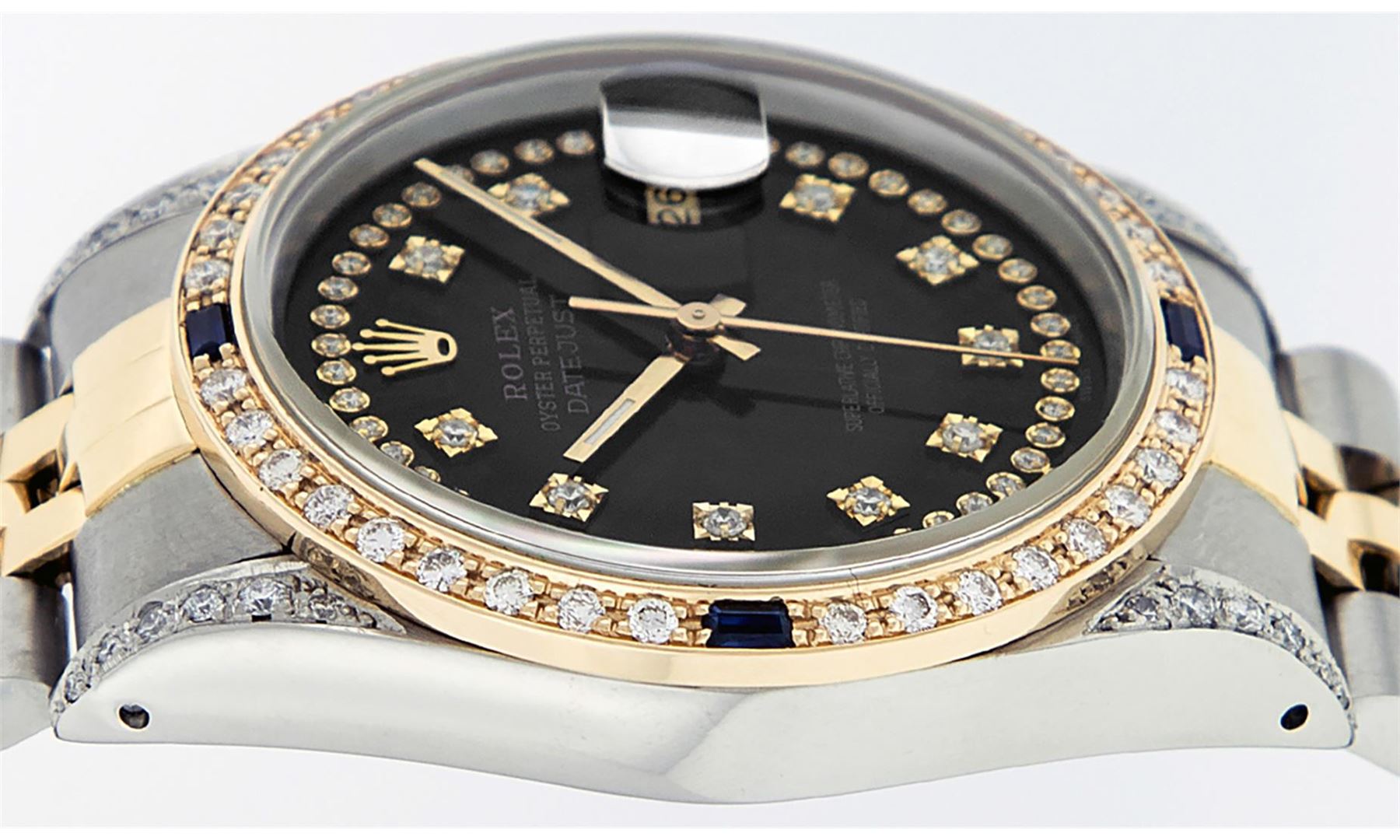 One Men's Yellow Gold & Stainless Steel Datejust Polished Bright with Satin Finish, Serviced & Electronically Tested, Stainless Steel Case: 36mm, Custom Diamond Lugs: 28 Diamonds On Lugs, Color: G to H, Clarity: SI-VS. Yellow Gold Crown, Custom Bezel: New 18K Yellow Gold Beadset Diamond + Sapphire Bezel, Diamond + Stone Count: 36 Diamonds + 4 Sapphires, Total Weight 1.00 Carat, Clarity: SI-VS, Color: G to H. Custom Crystal: New Scratch Resistant Synthetic Sapphire Cyclops Lens. Custom Hands: New Luminescent Hands. Movement: Automatic Winding Movement.. Custom Dial: Black Single Cut String Diamond Dial, Stone Count: 58 Diamonds In Dial, Color: G to H, Clarity: VS2. Date Window: 3 O'clock Position Date Display, Quickset, Model: Datejust. Condition: G-6 Extra Fine. Bracelet: Yellow Gold And Stainless Steel Jubilee Band. Bright Polish & Satin Finish. 7.0 Inch Length, Adjustable. Standard Clasp, With Rolex Logo. This Watch Has Been Serviced And Polished It Is Free Of All Scratches And Dents.