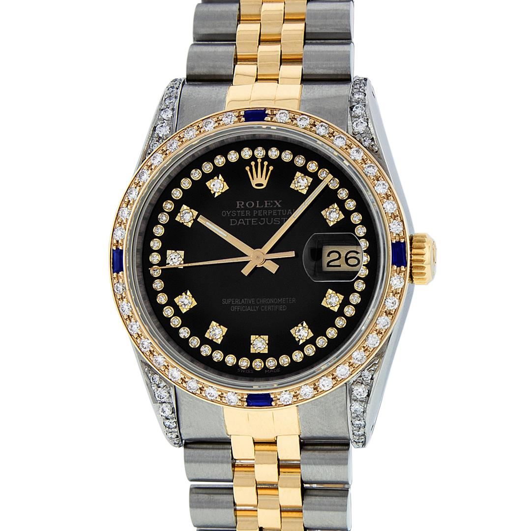 One Men's Yellow Gold & Stainless Steel Datejust Polished Bright with Satin Finish, Serviced & Electronically Tested, Stainless Steel Case: 36mm, Custom Diamond Lugs: 28 Diamonds On Lugs, Color: G to H, Clarity: SI-VS. Yellow Gold Crown, Custom Bezel: New 18K Yellow Gold Beadset Diamond + Sapphire Bezel, Diamond + Stone Count: 36 Diamonds + 4 Sapphires, Total Weight 1.00 Carat, Clarity: SI-VS, Color: G to H. Custom Crystal: New Scratch Resistant Synthetic Sapphire Cyclops Lens. Custom Hands: New Luminescent Hands. Movement: Automatic Winding Movement.. Custom Dial: Black Single Cut String Diamond Dial, Stone Count: 58 Diamonds In Dial, Color: G to H, Clarity: VS2. Date Window: 3 O'clock Position Date Display, Quickset, Model: Datejust. Condition: G-6 Extra Fine. Bracelet: Yellow Gold And Stainless Steel Jubilee Band. Bright Polish & Satin Finish. 7.0 Inch Length, Adjustable. Standard Clasp, With Rolex Logo. This Watch Has Been Serviced And Polished It Is Free Of All Scratches And Dents.