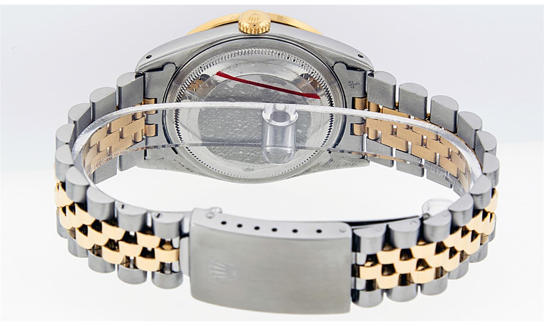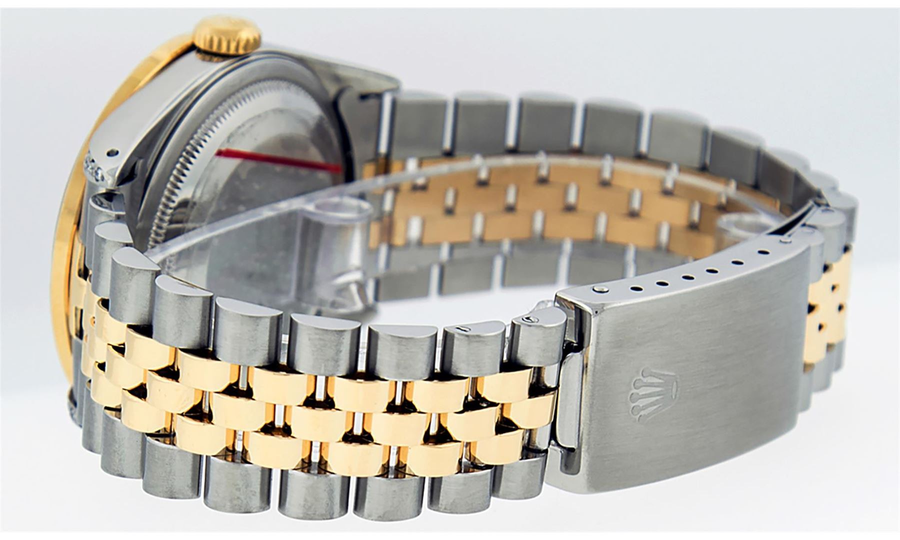 One Men's Yellow Gold & Stainless Steel Datejust Polished Bright with Satin Finish, Serviced & Electronically Tested, Stainless Steel Case: 36mm, Custom Diamond Lugs: 28 Diamonds On Lugs, Color: G to H, Clarity: SI-VS. Yellow Gold Crown, Bezel: Yellow Gold Fluted Bezel. Custom Crystal: New Scratch Resistant Acrylic Cyclops Lens. Custom Hands: New Luminescent Hands. Movement: Automatic Winding Movement.. Custom Dial: Mother Of Pearl Diamond Dial, Stone Count: 8 Diamonds + 2 Baguette Diamonds On Dial, Color: G to H, Clarity: VS2. Date Window: 3 O'clock Position Date Display, Quickset, Model: Datejust. Condition: G-6 Extra Fine. Bracelet: Yellow Gold And Stainless Steel Jubilee Band. Bright Polish & Satin Finish. 7.0 Inch Length, Adjustable. Standard Clasp, With Rolex Logo. This Watch Has Been Serviced And Polished It Is Free Of All Scratches And Dents.