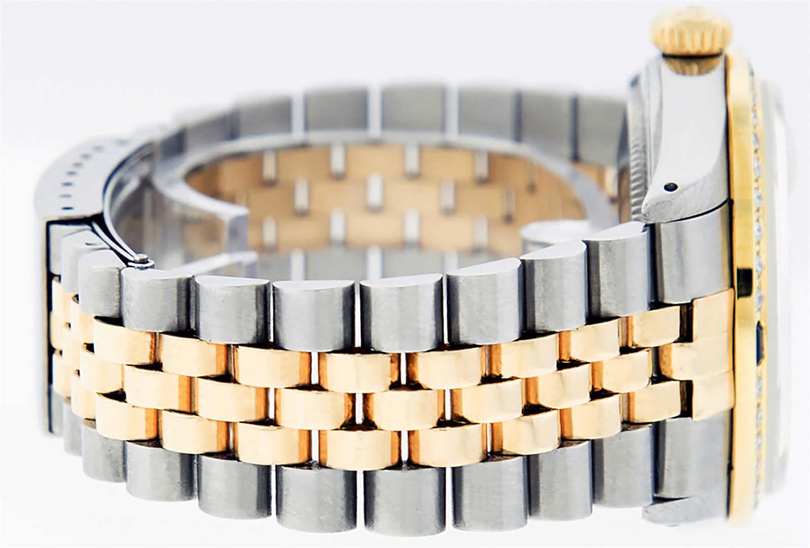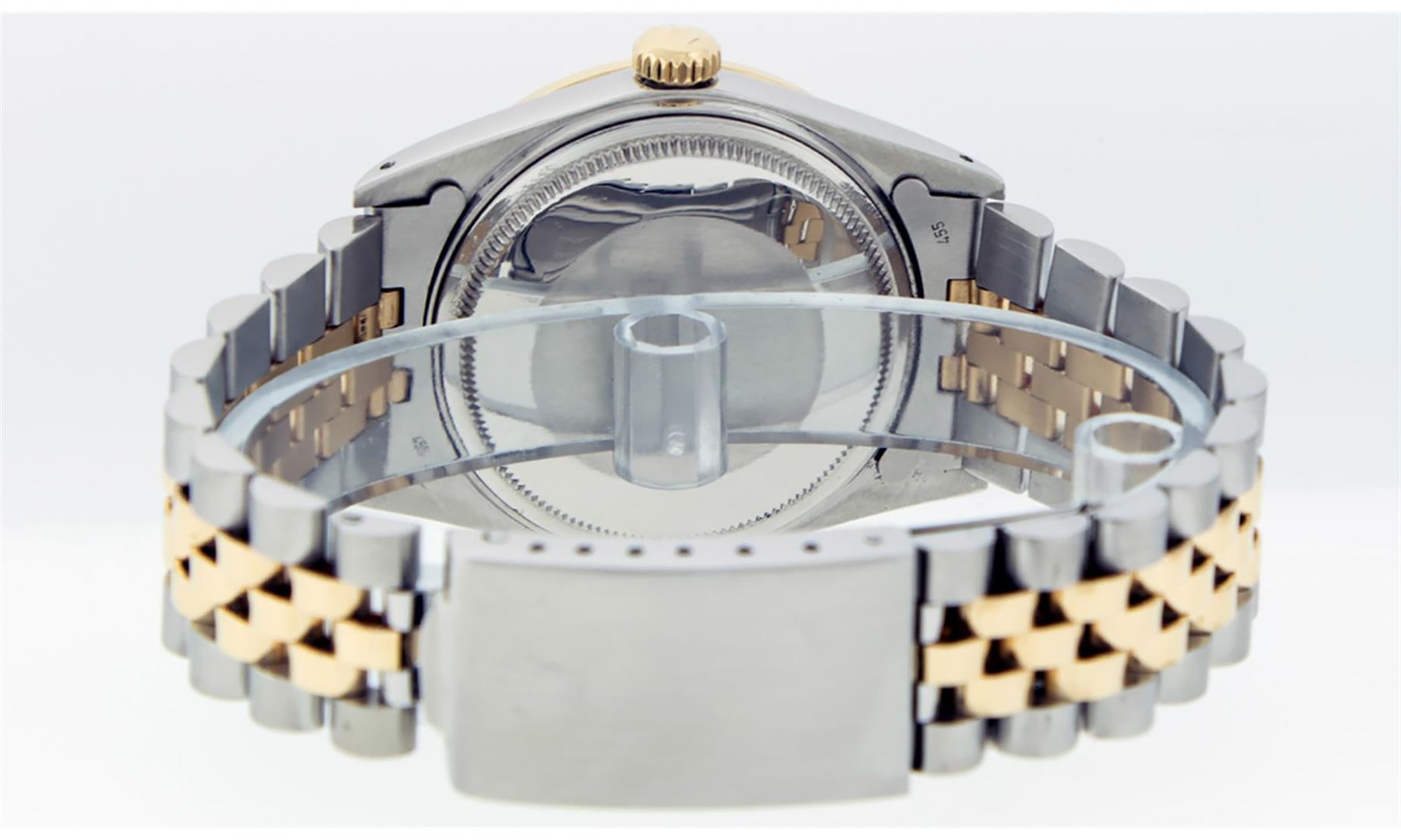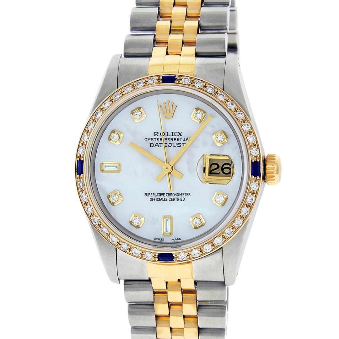 One Men's Yellow Gold Two Tone Rolex Datejust Polished, Serviced & Electronically Tested, Yellow Gold & Stainless Steel Case:36mm, Yellow Gold Crown, Custom Bezel: New 18K Yellow Gold Sapphire Beadset Diamond Bezel, Diamond Count: 36 Diamonds + 4 Sapphires Total Weight 1.00 Carat, Clarity: SI-VS, Color: G to H. Custom Crystal: New Synthetic Sapphire Cyclops Lens. Movement: Automatic Winding Movement.. Custom Dial: Mother Of Pearl Dial Set With Diamond Hour Markers and Baguette Markers On 6 and 9, Diamond Count: 8 + 2 Baguette Diamonds in Dial G To H In Color , Date Window: 3 O'clock Position Date Display, Quickset, Model: 16013 Condition: G-6 Extra Fine. Bracelet: Two Tone Yellow Gold & Stainless Steel Jubilee. Bright Polish. 7.0 Inch Length, Adjustable. Standard Clasp, With Rolex Logo. This Watch Has Been Serviced Time Tested And Is In Excellent Condition It Is Free Of All Scratches And Dents.