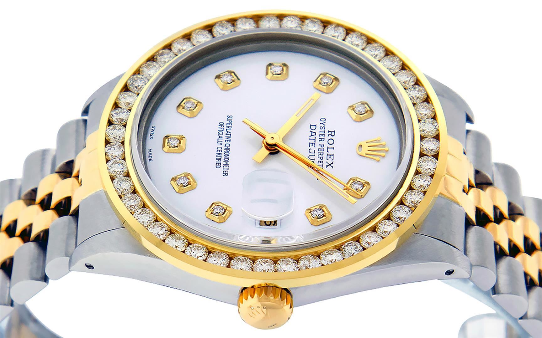 One Men's 14K Yellow Gold Rolex Datejust Polished Bright with Satin Finish, Serviced & Electronically Tested, Stainless Steel Case: 36mm, Yellow Gold Crown, Custom Bezel: New 18K Yellow Gold 3ct Channel Set Diamond Bezel, Diamond Count: 40 Diamonds, Total Weight 3.00 Carat, Clarity: SI-VS, Color: G to H. Custom Crystal: New Synthetic Sapphire Cyclops Lens. Custom Hands: New Luminescent Hands. Movement: Automatic Winding Movement Caliber 3035. Custom Dial: White Diamond Dial, Diamond Count: 10 Diamonds In Dial, Color: G to H, Clarity: SI-VS. Date Window: 3 O'clock Position Date Display, Quickset, Model: 16013 Datejust Condition: G-6 Extra Fine. Bracelet: 14K Yellow Gold And Stainless Steel Jubilee Band. Bright Polish & Satin Finish. 7.0 Inch Length, Adjustable. Standard Clasp, With Rolex Logo. This Watch Has Been Serviced And Polished It Is Free Of All Scratches And Dents.