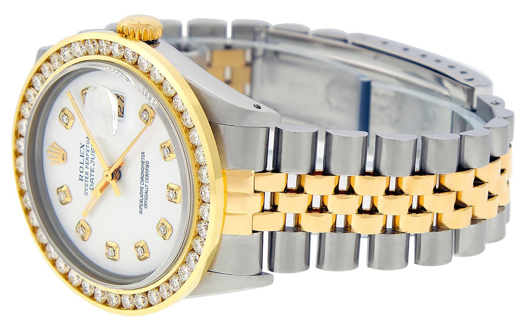 One Men's 14K Yellow Gold Rolex Datejust Polished Bright with Satin Finish, Serviced & Electronically Tested, Stainless Steel Case: 36mm, Yellow Gold Crown, Custom Bezel: New 18K Yellow Gold 3ct Channel Set Diamond Bezel, Diamond Count: 40 Diamonds, Total Weight 3.00 Carat, Clarity: SI-VS, Color: G to H. Custom Crystal: New Synthetic Sapphire Cyclops Lens. Custom Hands: New Luminescent Hands. Movement: Automatic Winding Movement Caliber 3035. Custom Dial: White Diamond Dial, Diamond Count: 10 Diamonds In Dial, Color: G to H, Clarity: SI-VS. Date Window: 3 O'clock Position Date Display, Quickset, Model: 16013 Datejust Condition: G-6 Extra Fine. Bracelet: 14K Yellow Gold And Stainless Steel Jubilee Band. Bright Polish & Satin Finish. 7.0 Inch Length, Adjustable. Standard Clasp, With Rolex Logo. This Watch Has Been Serviced And Polished It Is Free Of All Scratches And Dents.