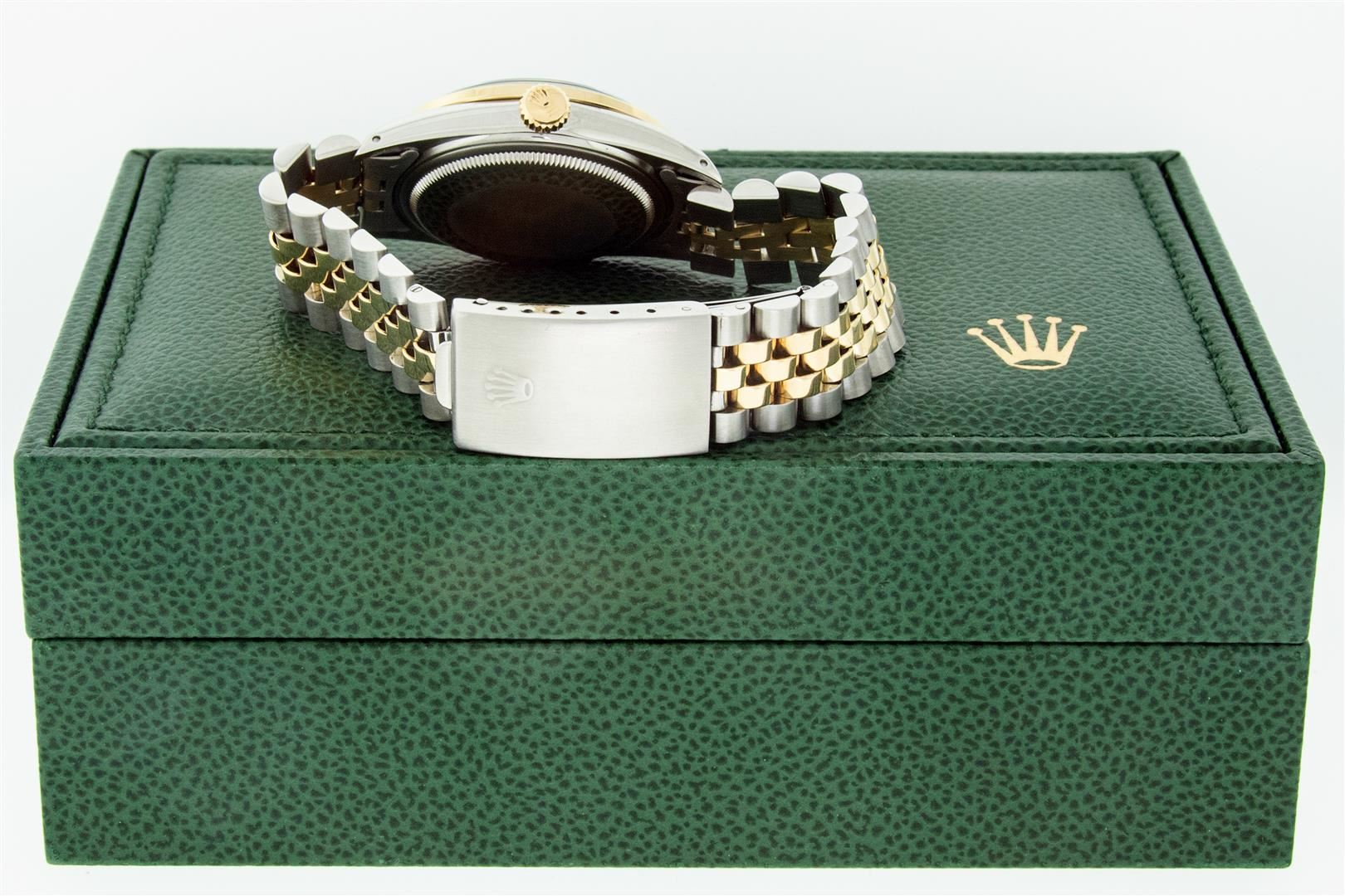 One Men's Yellow Gold Two Tone Rolex Datejust Polished, Serviced & Electronically Tested, Yellow Gold & Stainless Steel Case: 36mm, Yellow Gold Crown, Custom Bezel: New 18K Yellow Gold Sapphire Beadset Diamond Bezel, Stone Count: 36 Diamonds + 4 Sapphires, Clarity: SI-VS, Color: G to H. Custom Crystal: New Sapphire With Magnified Date Window. Custom Hands: New Luminescent Hands. Rolex Movement: Automatic Winding Movement. Custom Dial: Refinished To White With Added Diamond Hour Markers, Diamond Count: 10 Diamonds, Clarity: VS2-SI1, Color: G to H. Date Window: 3 O'clock Position Date Display, Quickset, Model: Datejust. Condition: G-6 Extra Fine. Rolex Bracelet: Two Tone Yellow Gold & Stainless Steel Jubilee Band. Bright Polish. 7.0 Inch Length, Adjustable. Standard Clasp, With Rolex Logo. This Watch Has Been Serviced Time Tested And Is In Excellent Condition It Is Free Of All Scratches And Dents. This Pre Owned Watch Comes With A Rolex Box.