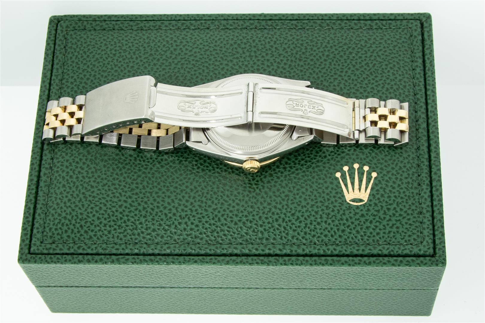 One Men's Yellow Gold Two Tone Rolex Datejust Polished, Serviced & Electronically Tested, Yellow Gold & Stainless Steel Case: 36mm, Yellow Gold Crown, Custom Bezel: New 18K Yellow Gold Sapphire Beadset Diamond Bezel, Stone Count: 36 Diamonds + 4 Sapphires, Clarity: SI-VS, Color: G to H. Custom Crystal: New Sapphire With Magnified Date Window. Custom Hands: New Luminescent Hands. Rolex Movement: Automatic Winding Movement. Custom Dial: Refinished To White With Added Diamond Hour Markers, Diamond Count: 10 Diamonds, Clarity: VS2-SI1, Color: G to H. Date Window: 3 O'clock Position Date Display, Quickset, Model: Datejust. Condition: G-6 Extra Fine. Rolex Bracelet: Two Tone Yellow Gold & Stainless Steel Jubilee Band. Bright Polish. 7.0 Inch Length, Adjustable. Standard Clasp, With Rolex Logo. This Watch Has Been Serviced Time Tested And Is In Excellent Condition It Is Free Of All Scratches And Dents. This Pre Owned Watch Comes With A Rolex Box.