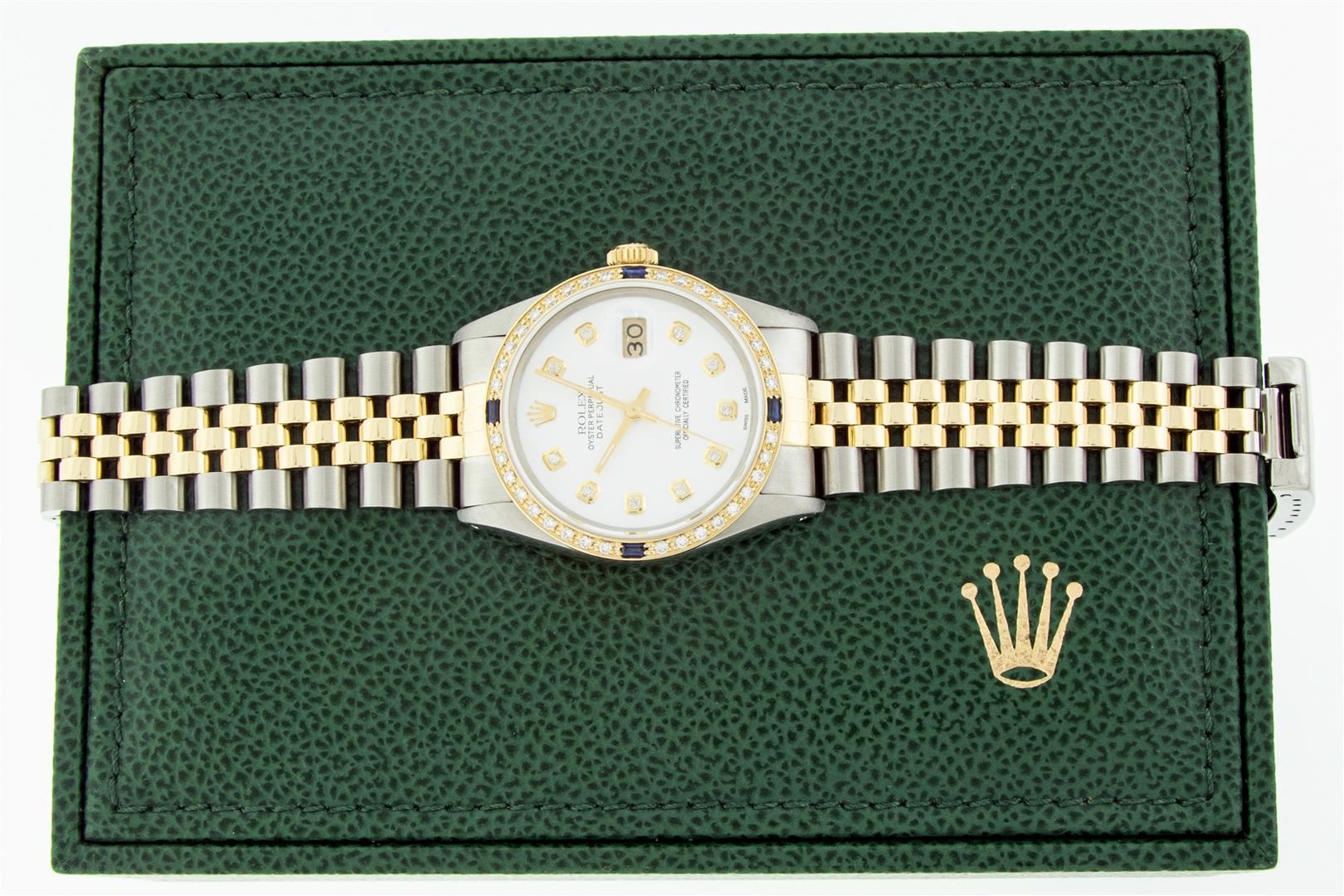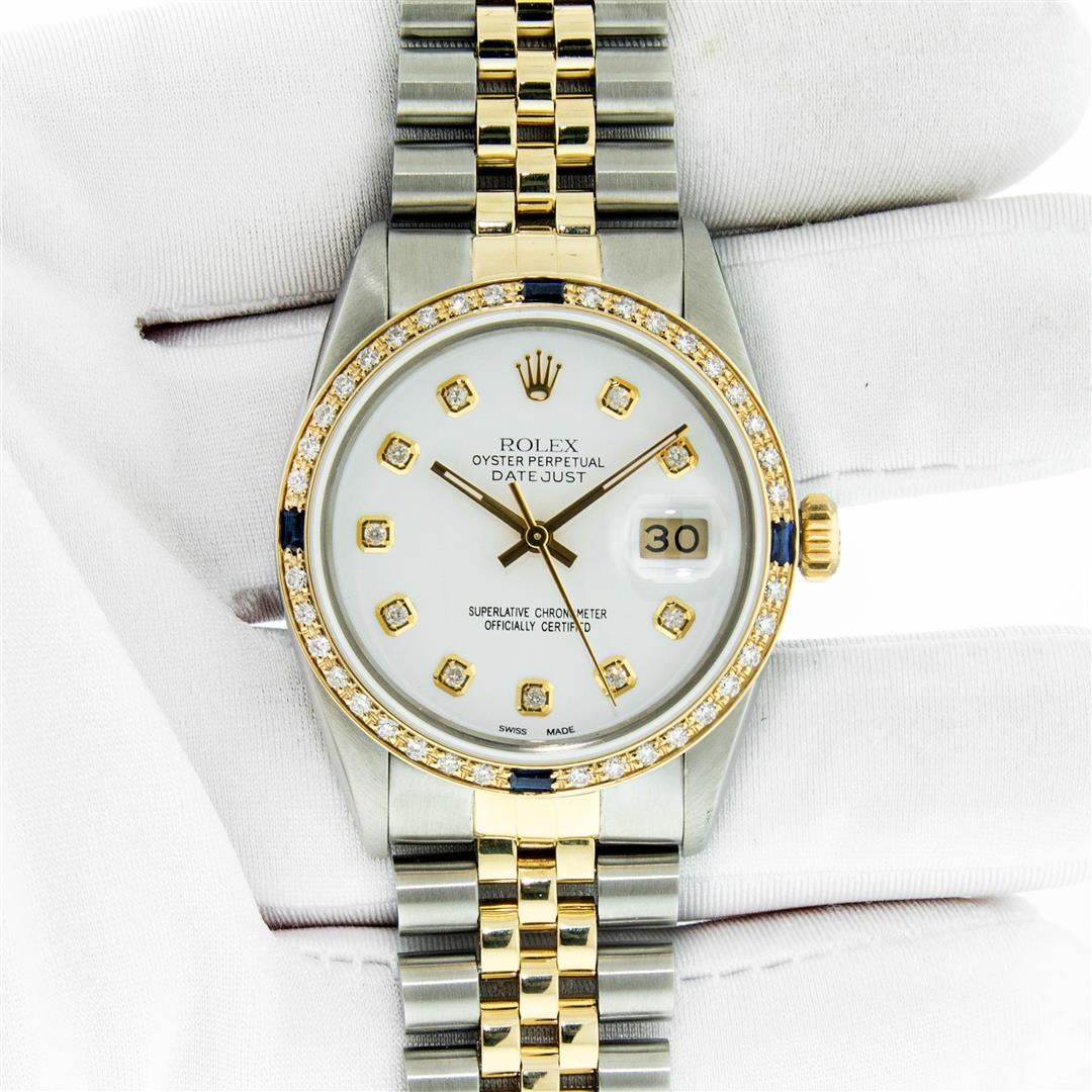 One Men's Yellow Gold Two Tone Rolex Datejust Polished, Serviced & Electronically Tested, Yellow Gold & Stainless Steel Case: 36mm, Yellow Gold Crown, Custom Bezel: New 18K Yellow Gold Sapphire Beadset Diamond Bezel, Stone Count: 36 Diamonds + 4 Sapphires, Clarity: SI-VS, Color: G to H. Custom Crystal: New Sapphire With Magnified Date Window. Custom Hands: New Luminescent Hands. Rolex Movement: Automatic Winding Movement. Custom Dial: Refinished To White With Added Diamond Hour Markers, Diamond Count: 10 Diamonds, Clarity: VS2-SI1, Color: G to H. Date Window: 3 O'clock Position Date Display, Quickset, Model: Datejust. Condition: G-6 Extra Fine. Rolex Bracelet: Two Tone Yellow Gold & Stainless Steel Jubilee Band. Bright Polish. 7.0 Inch Length, Adjustable. Standard Clasp, With Rolex Logo. This Watch Has Been Serviced Time Tested And Is In Excellent Condition It Is Free Of All Scratches And Dents. This Pre Owned Watch Comes With A Rolex Box.