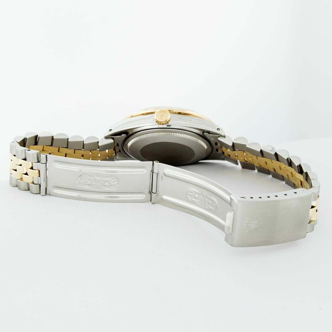 One Men's Rolex Pre Owned Yellow Gold And Stainless Steel Datejust Polished Bright with Satin Finish, Serviced & Electronically Tested, Rolex Stainless Steel Case: 36mm, Rolex Yellow Gold Crown, Custom Bezel: New 18K Yellow Gold Pyramid Diamond Bezel, Diamond Count: 24 Diamonds, Clarity: SI-VS, Color: G to H. Custom Crystal: New Sapphire With Magnified Date. Custom Hands: New Luminescent Hands. Rolex Movement: Automatic Winding Movement 3035. Rolex Dial: White Dial With Roman Hour Markers And Square Track. Date Window: 3 O'Clock Position Date Display, Quickset, Model: Datejust. Condition: G-6 Extra Fine. Rolex Bracelet: 14K Yellow Gold And Stainless Steel Jubilee Band. Bright Polish & Satin Finish. 7.0 Inch Length, Adjustable. Standard Clasp, With Rolex Logo. This Watch Has Been Serviced And Polished It Is Free Of All Scratches And Dents.