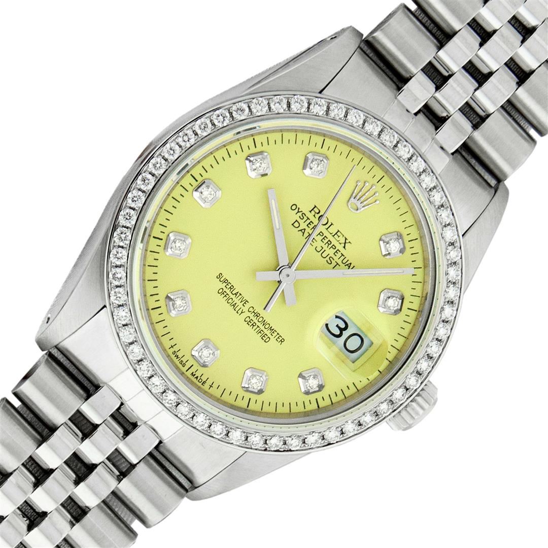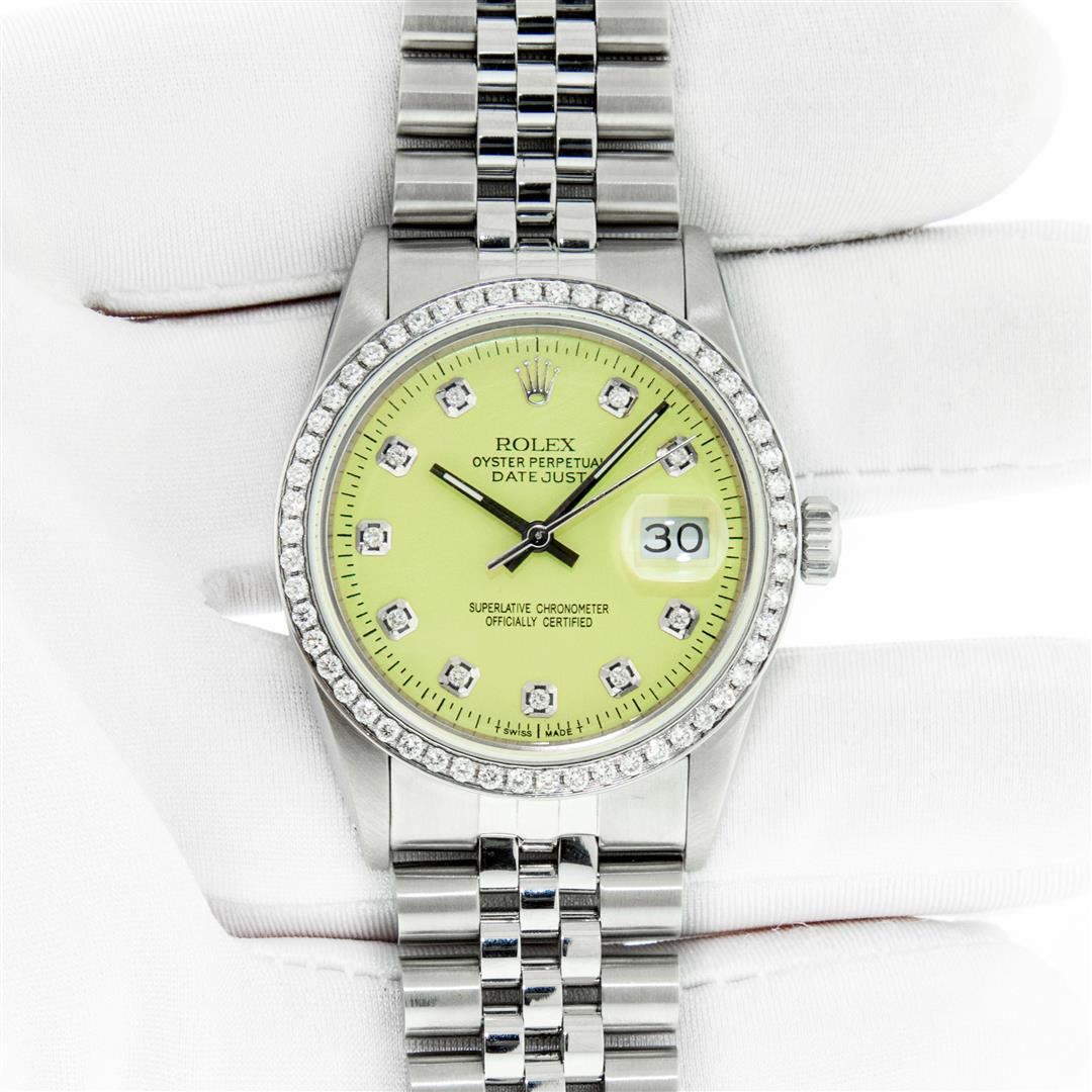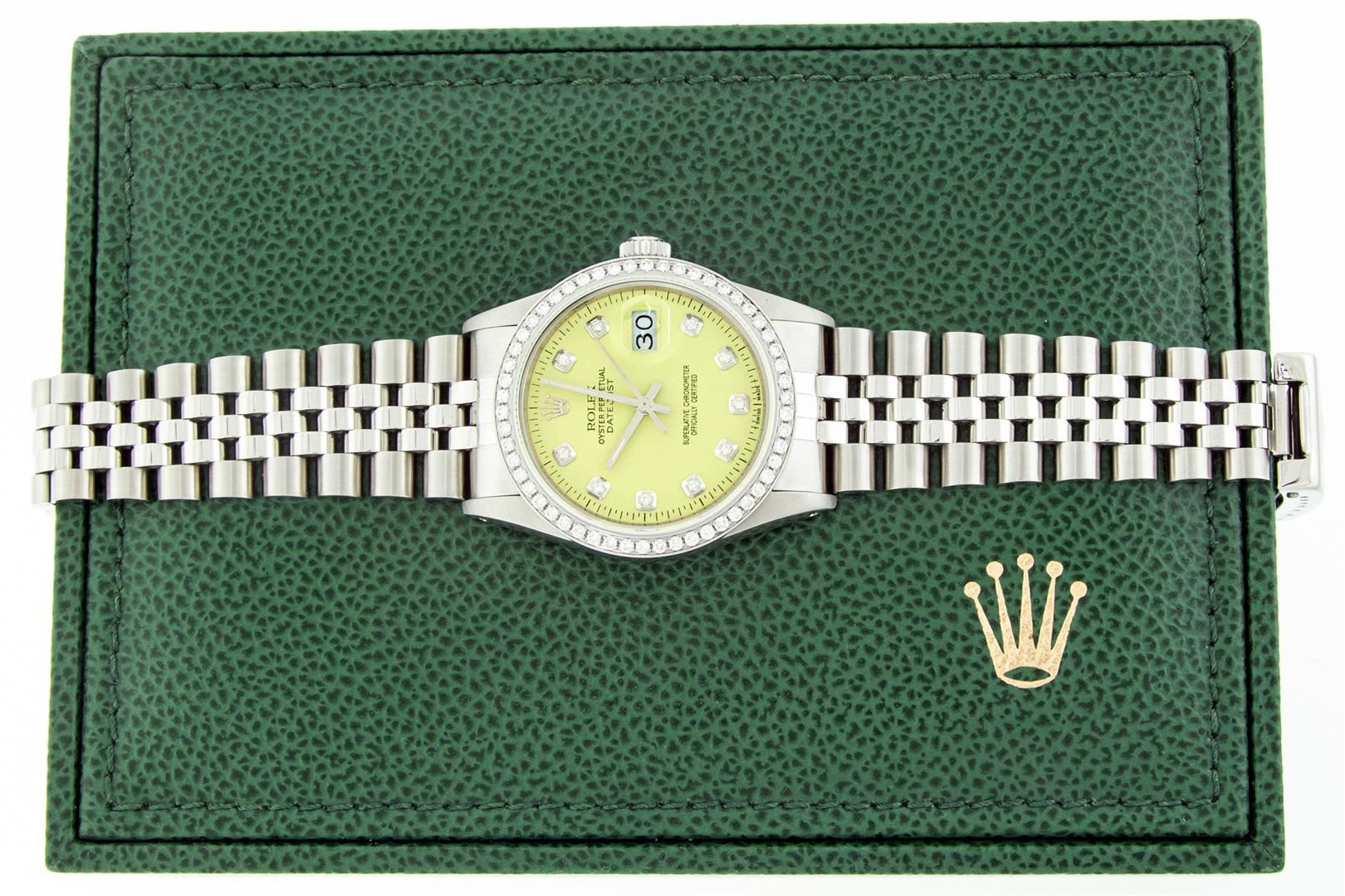 One Mens Rolex Stainless Steel Datejust Polished Bright with Satin Finish, This Watch Has Been Serviced & Electronically Tested, Stainless Steel Case: 36mm, Rolex Stainless Steel Crown, Custom Bezel: New Stainless Steel Bead-set Diamond Bezel, Diamond Count: 54 Diamonds In Bezel, Total Weight 1.00 Carat, Clarity: SI-VS, Color: G to H. Custom Crystal: New Sapphire With Magnified Date Window. Custom Hands: New Luminescent Hands. Rolex Movement: Automatic Winding Movement. Custom Dial: Refinished To Yellow Diamond Dial, Diamond Count: 10 Diamonds In Dial, Color: G to H, Clarity: VS2-SI1. Date Window: 3 O'clock Position Date Display, Quickset, Model: Datejust. Condition: G-6 Extra Fine. Rolex Bracelet: Stainless Steel Jubilee Band. Bright Polish & Satin Finish. 7.0 Inch Length, Adjustable. Standard Clasp, With Rolex Logo. This Preowned Watch Has Been Serviced Time Tested And Is In Excellent Condition It Is Free Of All Scratches And Dents. This Watch Comes With A Rolex Box.
