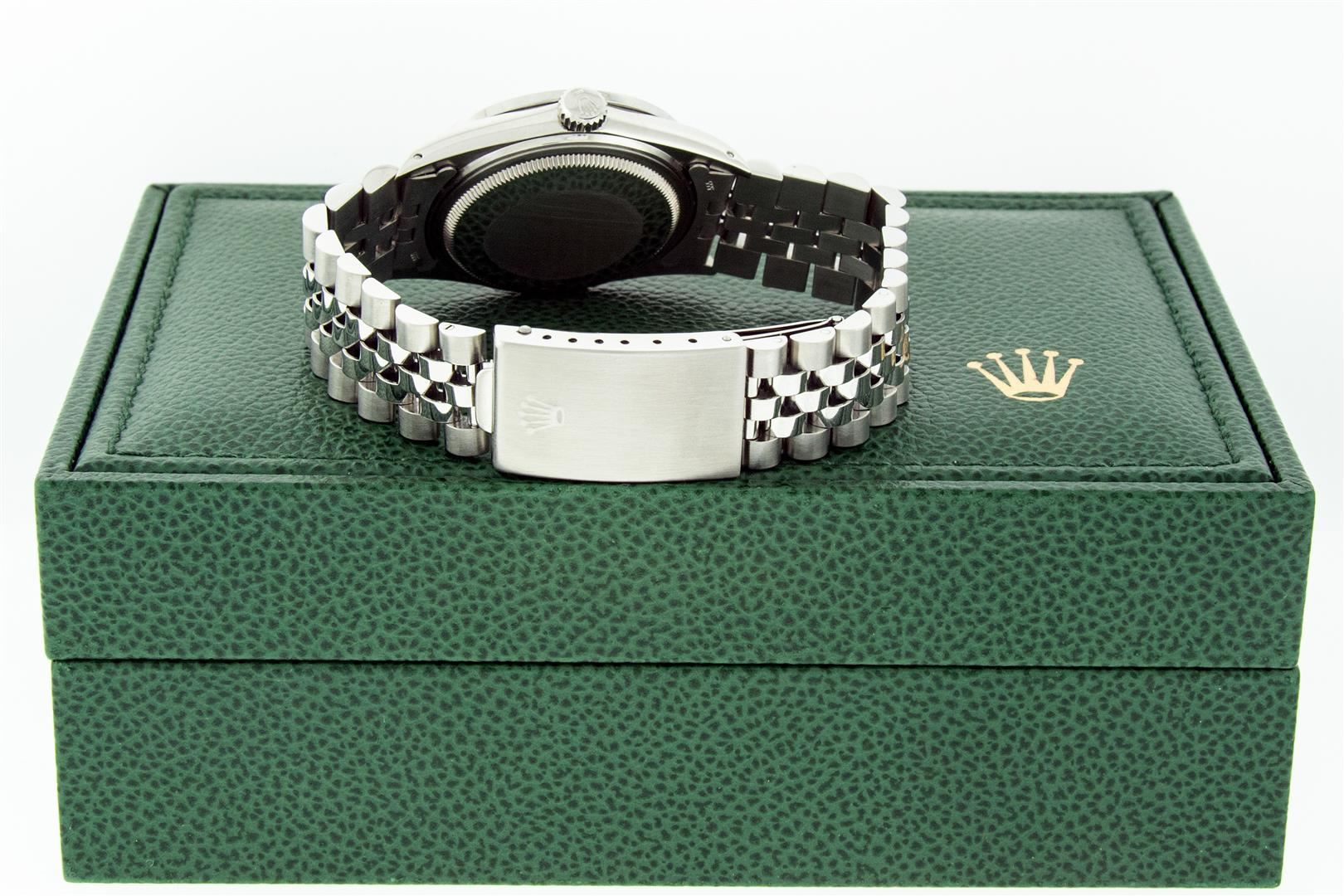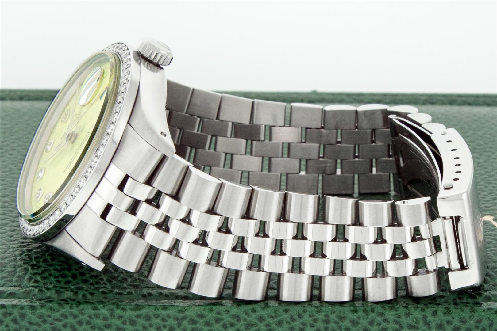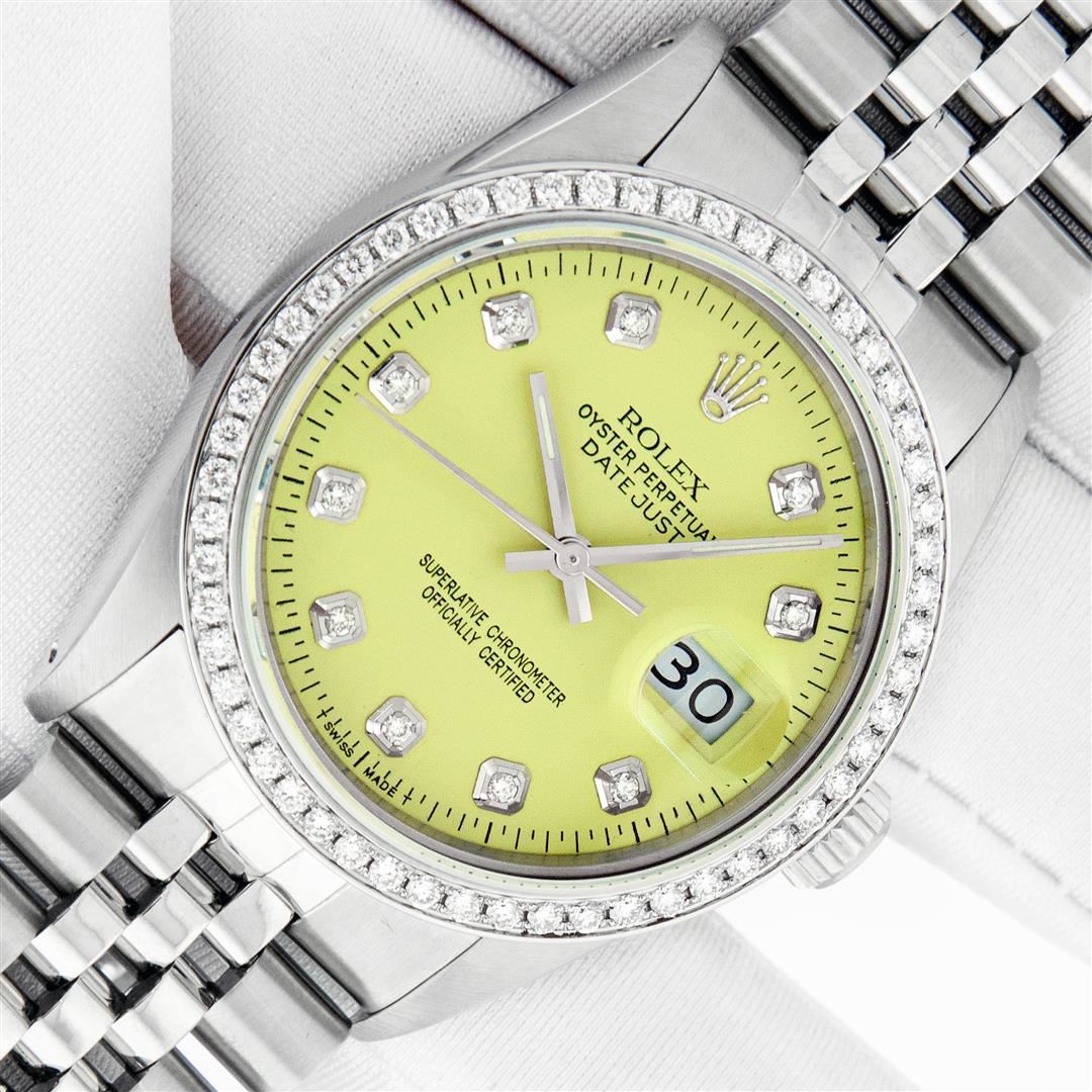 One Mens Rolex Stainless Steel Datejust Polished Bright with Satin Finish, This Watch Has Been Serviced & Electronically Tested, Stainless Steel Case: 36mm, Rolex Stainless Steel Crown, Custom Bezel: New Stainless Steel Bead-set Diamond Bezel, Diamond Count: 54 Diamonds In Bezel, Total Weight 1.00 Carat, Clarity: SI-VS, Color: G to H. Custom Crystal: New Sapphire With Magnified Date Window. Custom Hands: New Luminescent Hands. Rolex Movement: Automatic Winding Movement. Custom Dial: Refinished To Yellow Diamond Dial, Diamond Count: 10 Diamonds In Dial, Color: G to H, Clarity: VS2-SI1. Date Window: 3 O'clock Position Date Display, Quickset, Model: Datejust. Condition: G-6 Extra Fine. Rolex Bracelet: Stainless Steel Jubilee Band. Bright Polish & Satin Finish. 7.0 Inch Length, Adjustable. Standard Clasp, With Rolex Logo. This Preowned Watch Has Been Serviced Time Tested And Is In Excellent Condition It Is Free Of All Scratches And Dents. This Watch Comes With A Rolex Box.