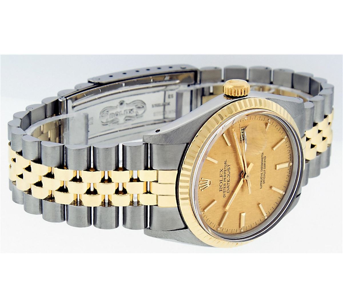 One Mens Two Tone Rolex Datejust Polished, Serviced & Electronically Tested, 14K Yellow Gold & Stainless Steel Case: 36mm,14K Yellow Gold Crown, Bezel: 14K Yellow Gold Fluted Bezel. Custom Crystal: Acrylic Cyclops Lens. Movement: Automatic Winding Movement Caliber 3035. Dial: Champagne Linen Dial With Index Hour Markers and Small Track. Date Window: 3 O'Clock Position Date Display, Quickset, Model: 16013 Condition: G-6 Extra Fine The Watch Is In Very Good Condition Free Of All Scratches And Dents. Bracelet: Two Tone 14K Yellow Gold & Stainless Steel Jubilee. Bright Polish. 7.0 Inch Length, Adjustable. Standard Clasp, With Rolex Logo.