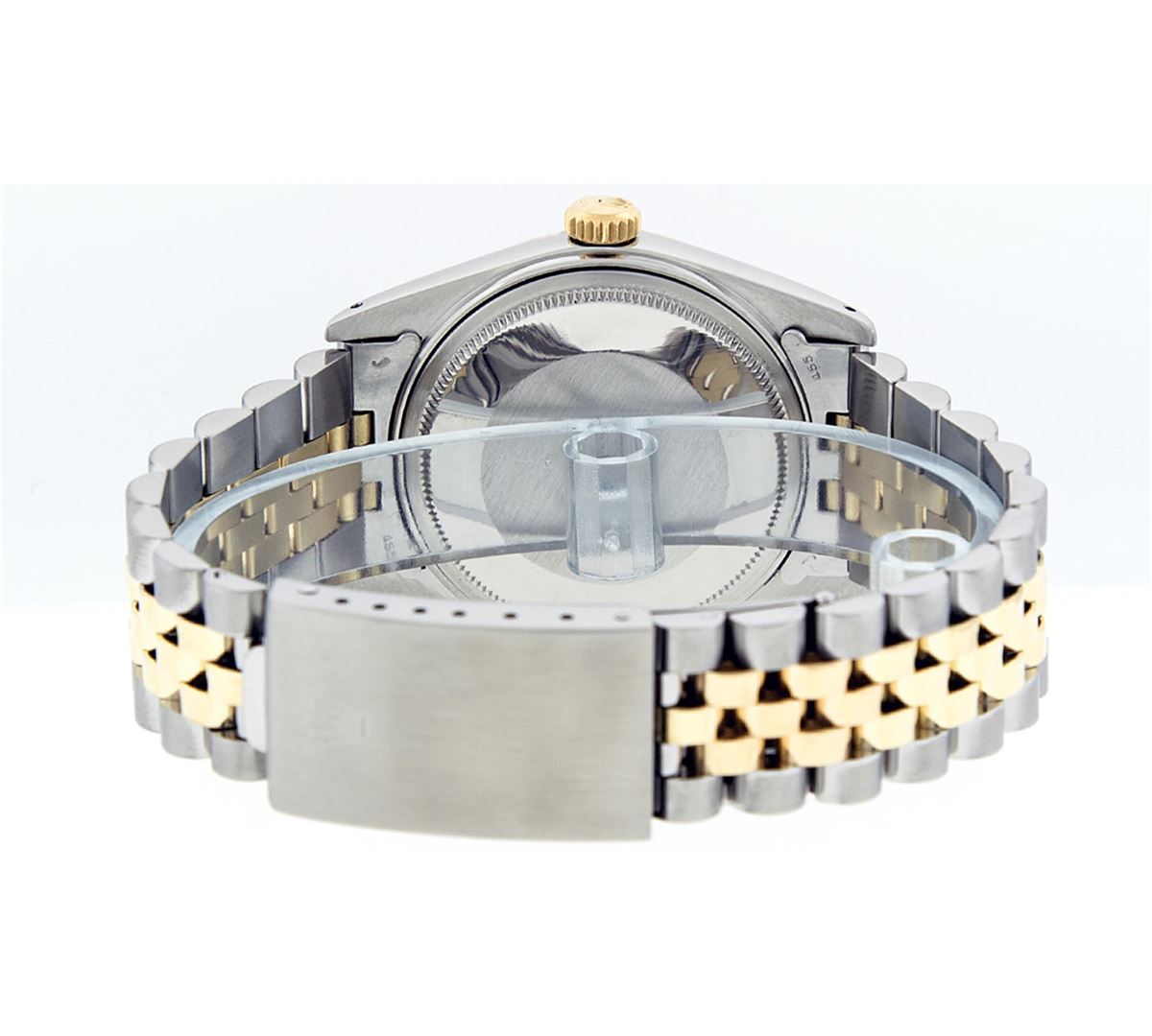 One Mens Two Tone Rolex Datejust Polished, Serviced & Electronically Tested, 14K Yellow Gold & Stainless Steel Case: 36mm,14K Yellow Gold Crown, Bezel: 14K Yellow Gold Fluted Bezel. Custom Crystal: Acrylic Cyclops Lens. Movement: Automatic Winding Movement Caliber 3035. Custom Dial: Mother Of Pearl Roman With Square Track. Date Window: 3 O'Clock Position Date Display, Quickset, Model: 16013 Condition: G-6 Extra Fine. Bracelet:Two Tone 14K Yellow Gold & Stainless Steel Jubilee. Bright Polish. 7.0 Inch Length, Adjustable. Standard Clasp, With Rolex Logo.