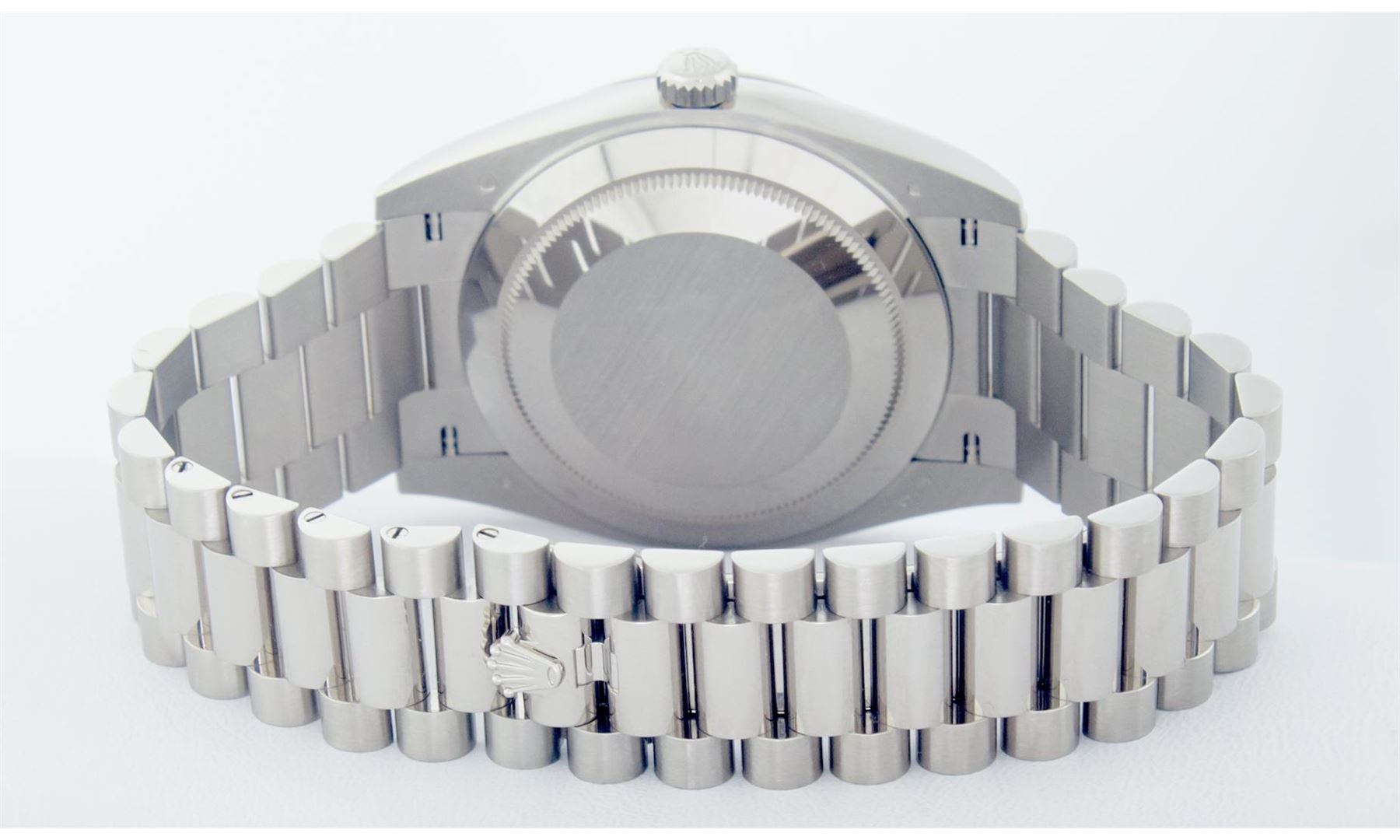 One Mens Quickset Rolex Day Date 18K White Gold President Polished, Serviced & Electronically Tested, Rolex 18K White Gold Case: 40mm, Rolex 18K White Gold Crown, Rolex Bezel: 18K White Gold Fluted Bezel. Crystal: Sapphire With Magnified Date Window. Hands: Solid Hands. Rolex Movement: Automatic Quickset Winding Movement Caliber 3255. Rolex Dial: Olive Green Roman Dial With Square Track. Date Window: 3 O'Clock Position, Day Display: 12 O'Clock Position, Double Quickset, Model: Day Date Quickset President. Condition: G-6 Extra Fine. Rolex Bracelet: 18K White Gold President Band With Hidden Clasp, Bright & Satin Polish. 7.5 Inch Length, Standard Hidden President Clasp, With Rolex Logo. This Pre Owned Watch Has Been Serviced Time Tested And Is In Excellent Condition It Is Free Of All Scratches And Dents. This Watch Comes With Box And Papers.