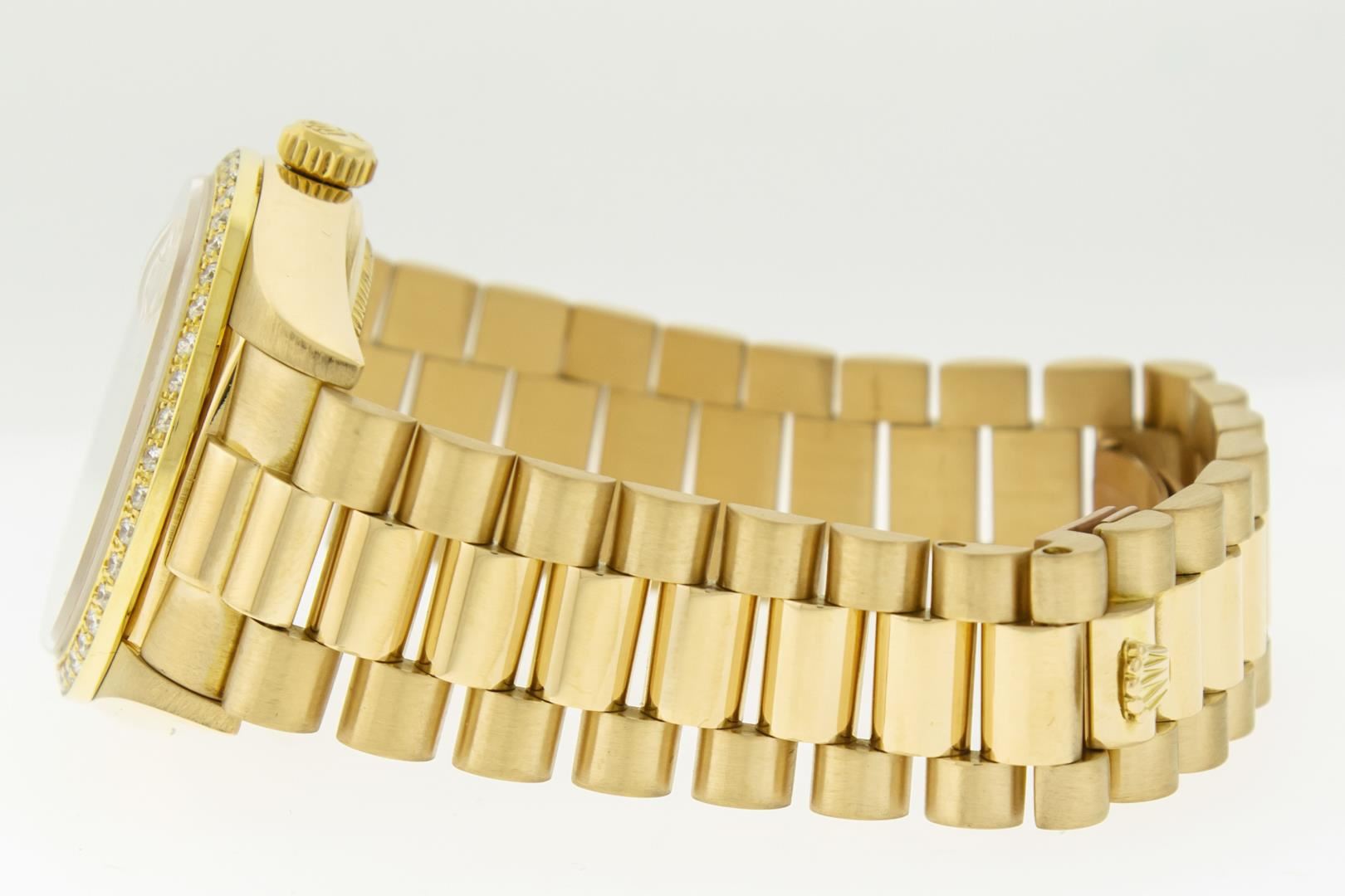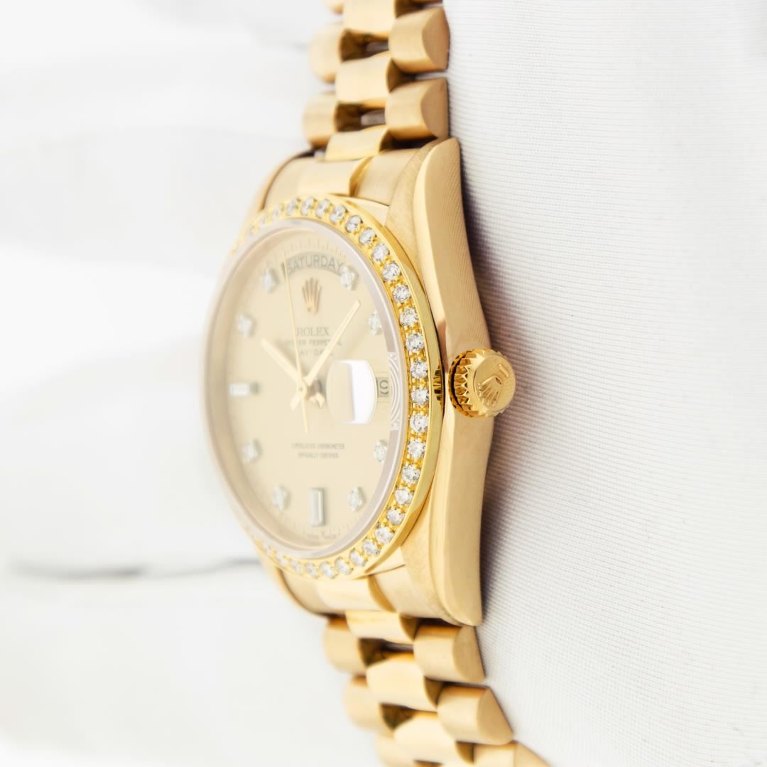 One Mens Pre Owned Rolex Day Date 18K Yellow Gold President Polished, Serviced & Electronically Tested, Rolex 18K Yellow Gold Case: 36mm, Rolex 18K Yellow Gold Crown, Custom Bezel: New 18K Yellow Gold Beadset Diamond Bezel, Diamond Count 44 Diamonds On Bezel. Total Weight 1.0 Carat, Clarity: SI-VS, Color: G to H. Custom Crystal: New Sapphire With Magnified Date Window. Custom Hands: New Luminescent Hands. Rolex Movement: Automatic Winding Movement Caliber 3055. Rolex Dial: Factory Champagne Diamond Dial, Diamond Count: 8 Diamonds + 2 Baguettes, Clarity: VS. Date Window: 3 O'Clock Position Date Display, Day Window: 12 O'Clock Position Date Display. Quickset, Model: Day Date President. Condition: G-6 Extra Fine. Rolex Bracelet: New 18K Yellow Gold President Band. Bright Polish. 7.0 Inch Length, Standard Hidden President Clasp President Band, With Rolex Logo. This Watch Has Been Serviced And Polished It Is Free Of All Scratches And Dents.