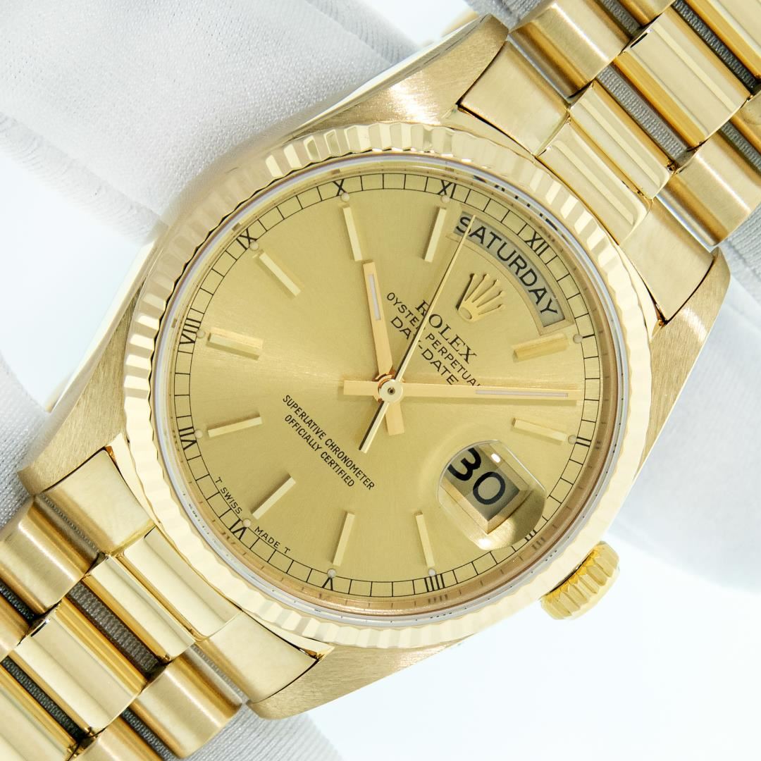 One Mens Quickset Pre Owned Rolex Day Date 18K Yellow Gold President Polished, Serviced & Electronically Tested, Rolex 18K Yellow Gold Case: 36mm, Rolex 18K Yellow Gold Crown, Rolex Bezel: 18K Yellow Gold Fluted Bezel. Crystal: Sapphire With Magnified Date Window. Rolex Movement: Automatic Quickset Winding Movement Caliber 3055. Rolex Dial: Champagne Index With Roman Track & Lumi Dots. Date Window: 3 O'Clock Position, Day Display: 12 O'Clock Position, Single Quickset, Model: Day Date President. Condition: G-6 Extra Fine. Rolex Bracelet: 18K Yellow Gold President Band With Hidden Clasp, Bright & Satin Polish. 7.0 Inch Length, Standard President Clasp, With Rolex Logo. This Watch Has Been Serviced And Polished It Is Free Of All Scratches And Dents. This Watch Comes With A Rolex Box.