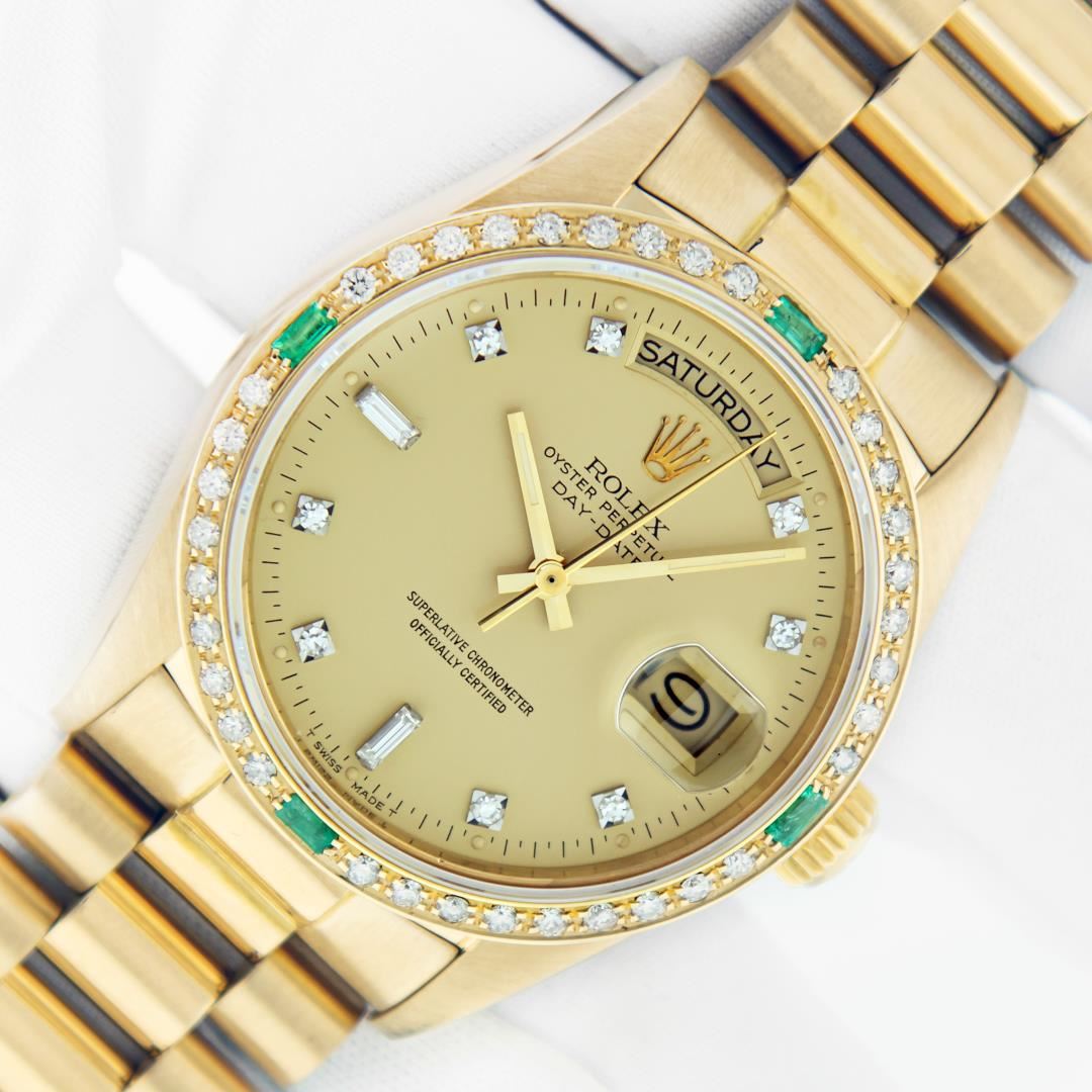 One Mens Pre Owned Rolex Day Date 18K Yellow Gold President Polished, Serviced & Electronically Tested, Rolex 18K Yellow Gold Case: 36mm, Rolex 18K Yellow Gold Crown, Custom Bezel: Custom Bezel: New 18K Yellow Gold Diamond Bezel, Diamond Count 36 Diamonds + 4 Emeralds On Bezel, Clarity: SI-VS, Color: G to H.. Custom Crystal: New Sapphire With Magnified Date Window. Custom Hands: New Luminescent Hands. Rolex Movement: Automatic Winding Movement Caliber 3055. Rolex Dial: Factory Champagne Diamond Dial, Diamond Count: 8 Diamonds + 2 Baguettes, Clarity: VS. Date Window: 3 O'Clock Position Date Display, Day Window: 12 O'Clock Position Date Display. Quickset, Model: Day Date President. Condition: G-6 Extra Fine. Rolex Bracelet: New 18K Yellow Gold President Band. Bright Polish. 7.0 Inch Length, Standard Hidden President Clasp President Band, With Rolex Logo. This Watch Has Been Serviced And Polished It Is Free Of All Scratches And Dents.